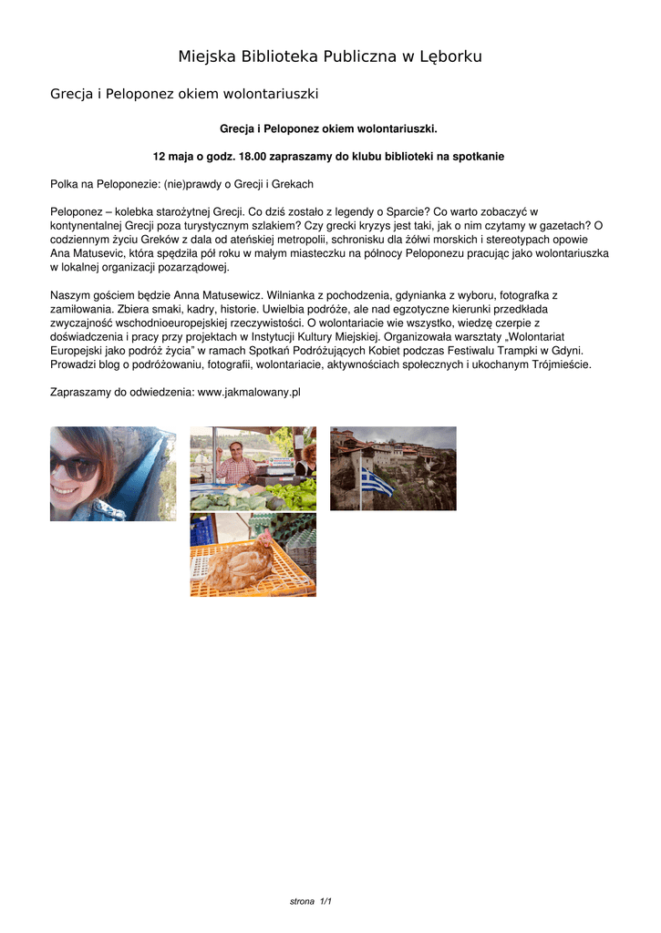 Miejska Biblioteka Publiczna w Lęborku Grecja i Peloponez okiem wolontariuszki Grecja i Peloponez okiem wolontariuszki. 12 maja o godz. 18.00 zapraszamy do klubu biblioteki na spotkanie Polka na Peloponezie: (nie)prawdy o Grecji i Grekach Peloponez – kolebka starożytnej Grecji. Co dziś zostało z legendy o Sparcie? Co warto zobaczyć w kontynentalnej Grecji poza turystycznym szlakiem? Czy grecki kryzys jest taki, jak o nim czytamy w gazetach? O codziennym życiu Greków z dala od ateńskiej metropolii, schronisku dla żółwi morskich i stereotypach opowie Ana Matusevic, która spędziła pół roku w małym miasteczku na północy Peloponezu pracując jako wolontariuszka w lokalnej organizacji pozarządowej. Naszym gościem będzie Anna Matusewicz. Wilnianka z pochodzenia, gdynianka z wyboru, fotografka z zamiłowania. Zbiera smaki, kadry, historie. Uwielbia podróże, ale nad egzotyczne kierunki przedkłada zwyczajność wschodnioeuropejskiej rzeczywistości. O wolontariacie wie wszystko, wiedzę czerpie z doświadczenia i pracy przy projektach w Instytucji Kultury Miejskiej. Organizowała warsztaty „Wolontariat Europejski jako podróż życia” w ramach Spotkań Podróżujących Kobiet podczas Festiwalu Trampki w Gdyni. Prowadzi blog o podróżowaniu, fotografii, wolontariacie, aktywnościach społecznych i ukochanym Trójmieście. Zapraszamy do odwiedzenia: www.jakmalowany.pl strona 1/1 Powered by TCPDF (www.tcpdf.org)
