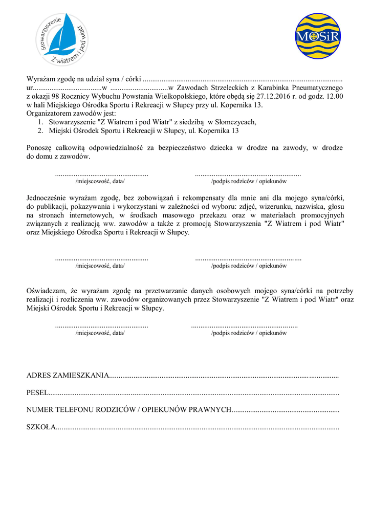 Wyrażam zgodę na udział syna / córki ........................................................................................................... ur.....................................w ...............................w Zawodach Strzeleckich z Karabinka Pneumatycznego z okazji 98 Rocznicy Wybuchu Powstania Wielkopolskiego, które obędą się 27.12.2016 r. od godz. 12.00 w hali Miejskiego Ośrodka Sportu i Rekreacji w Słupcy przy ul. Kopernika 13. Organizatorem zawodów jest: 1. Stowarzyszenie "Z Wiatrem i pod Wiatr" z siedzibą w Słomczycach, 2. Miejski Ośrodek Sportu i Rekreacji w Słupcy, ul. Kopernika 13 Ponoszę całkowitą odpowiedzialność za bezpieczeństwo dziecka w drodze na zawody, w drodze do domu z zawodów. .................................................. ......................................................... /miejscowość, data/ /podpis rodziców / opiekunów Jednocześnie wyrażam zgodę, bez zobowiązań i rekompensaty dla mnie ani dla mojego syna/córki, do publikacji, pokazywania i wykorzystani w zależności od wyboru: zdjęć, wizerunku, nazwiska, głosu na stronach internetowych, w środkach masowego przekazu oraz w materiałach promocyjnych związanych z realizacją ww. zawodów a także z promocją Stowarzyszenia "Z Wiatrem i pod Wiatr" oraz Miejskiego Ośrodka Sportu i Rekreacji w Słupcy. .................................................. ......................................................... /miejscowość, data/ /podpis rodziców / opiekunów Oświadczam, że wyrażam zgodę na przetwarzanie danych osobowych mojego syna/córki na potrzeby realizacji i rozliczenia ww. zawodów organizowanych przez Stowarzyszenie "Z Wiatrem i pod Wiatr" oraz Miejski Ośrodek Sportu i Rekreacji w Słupcy. .................................................. /miejscowość, data/ ......................................................... /podpis rodziców / opiekunów ADRES ZAMIESZKANIA........................................................................................................................... PESEL............................................................................................................................................................ NUMER TELEFONU RODZICÓW / OPIEKUNÓW PRAWNYCH.......................................................... SZKOŁA........................................................................................................................................................