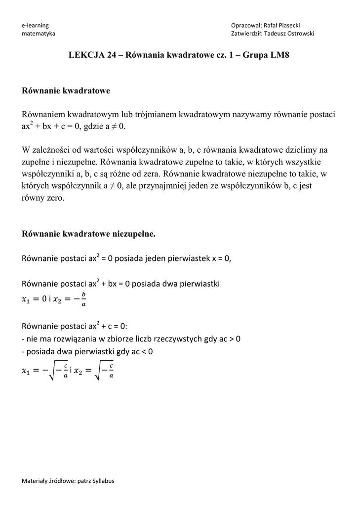 e-learning matematyka Opracował: Rafał Piasecki Zatwierdził: Tadeusz Ostrowski LEKCJA 24 – Równania kwadratowe cz. 1 – Grupa LM8 Równanie kwadratowe Równaniem kwadratowym lub trójmianem kwadratowym nazywamy równanie postaci ax2 + bx + c = 0, gdzie a ≠ 0. W zależności od wartości współczynników a, b, c równania kwadratowe dzielimy na zupełne i niezupełne. Równania kwadratowe zupełne to takie, w których wszystkie współczynniki a, b, c są różne od zera. Równanie kwadratowe niezupełne to takie, w których współczynnik a ≠ 0, ale przynajmniej jeden ze współczynników b, c jest równy zero. Równanie kwadratowe niezupełne. Równanie postaci ax2 = 0 posiada jeden pierwiastek x = 0, Równanie postaci ax2 + bx = 0 posiada dwa pierwiastki i Równanie postaci ax2 + c = 0: - nie ma rozwiązania w zbiorze liczb rzeczywstych gdy ac > 0 - posiada dwa pierwiastki gdy ac < 0 i Materiały źródłowe: patrz Syllabus
