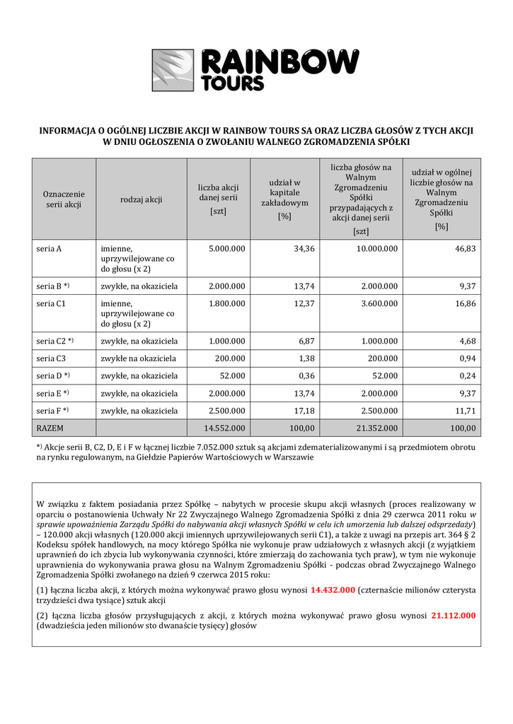 INFORMACJA O OGÓLNEJ LICZBIE AKCJI W RAINBOW TOURS SA ORAZ LICZBA GŁOSÓW Z TYCH AKCJI W DNIU OGŁOSZENIA O ZWOŁANIU WALNEGO ZGROMADZENIA SPÓŁKI Oznaczenie serii akcji rodzaj akcji liczba akcji danej serii [szt] udział w kapitale zakładowym [%] liczba głosów na Walnym Zgromadzeniu Spółki przypadających z akcji danej serii [szt] udział w ogólnej liczbie głosów na Walnym Zgromadzeniu Spółki [%] seria A imienne, uprzywilejowane co do głosu (x 2) 5.000.000 34,36 10.000.000 46,83 seria B *) zwykłe, na okaziciela 2.000.000 13,74 2.000.000 9,37 seria C1 imienne, uprzywilejowane co do głosu (x 2) 1.800.000 12,37 3.600.000 16,86 seria C2 *) zwykłe, na okaziciela 1.000.000 6,87 1.000.000 4,68 seria C3 zwykłe na okaziciela 200.000 1,38 200.000 0,94 seria D *) zwykłe, na okaziciela 52.000 0,36 52.000 0,24 seria E *) zwykłe, na okaziciela 2.000.000 13,74 2.000.000 9,37 seria F *) zwykłe, na okaziciela 2.500.000 17,18 2.500.000 11,71 14.552.000 100,00 21.352.000 100,00 RAZEM *) Akcje serii B, C2, D, E i F w łącznej liczbie 7.052.000 sztuk są akcjami zdematerializowanymi i są przedmiotem obrotu na rynku regulowanym, na Giełdzie Papierów Wartościowych w Warszawie W związku z faktem posiadania przez Spółkę – nabytych w procesie skupu akcji własnych (proces realizowany w oparciu o postanowienia Uchwały Nr 22 Zwyczajnego Walnego Zgromadzenia Spółki z dnia 29 czerwca 2011 roku w sprawie upoważnienia Zarządu Spółki do nabywania akcji własnych Spółki w celu ich umorzenia lub dalszej odsprzedaży) – 120.000 akcji własnych (120.000 akcji imiennych uprzywilejowanych serii C1), a także z uwagi na przepis art. 364 § 2 Kodeksu spółek handlowych, na mocy którego Spółka nie wykonuje praw udziałowych z własnych akcji (z wyjątkiem uprawnień do ich zbycia lub wykonywania czynności, które zmierzają do zachowania tych praw), w tym nie wykonuje uprawnienia do wykonywania prawa głosu na Walnym Zgromadzeniu Spółki - podczas obrad Zwyczajnego Walnego Zgromadzenia Spółki zwołanego na dzień 9 czerwca 2015 roku: (1) łączna liczba akcji, z których można wykonywać prawo głosu wynosi 14.432.000 (czternaście milionów czterysta trzydzieści dwa tysiące) sztuk akcji (2) łączna liczba głosów przysługujących z akcji, z których można wykonywać prawo głosu wynosi 21.112.000 (dwadzieścia jeden milionów sto dwanaście tysięcy) głosów