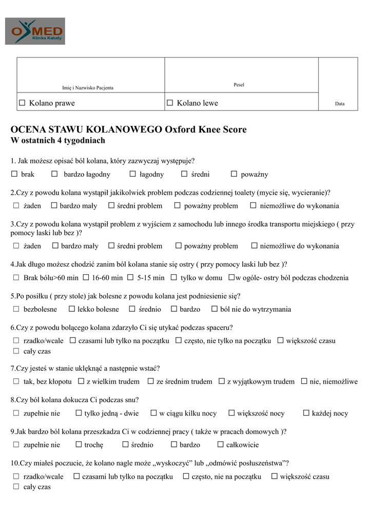 Pesel Imię i Nazwisko Pacjenta □ Kolano prawe □ Kolano lewe Data OCENA STAWU KOLANOWEGO Oxford Knee Score W ostatnich 4 tygodniach 1. Jak możesz opisać ból kolana, który zazwyczaj występuje? □ brak □ bardzo łagodny □ łagodny □ średni □ poważny 2.Czy z powodu kolana wystąpił jakikolwiek problem podczas codziennej toalety (mycie się, wycieranie)? □ żaden □ bardzo mały □ średni problem □ poważny problem □ niemożliwe do wykonania 3.Czy z powodu kolana wystąpił problem z wyjściem z samochodu lub innego środka transportu miejskiego ( przy pomocy laski lub bez )? □ żaden □ bardzo mały □ średni problem □ poważny problem □ niemożliwe do wykonania 4.Jak długo możesz chodzić zanim ból kolana stanie się ostry ( przy pomocy laski lub bez )? □ Brak bólu>60 min □ 16-60 min □ 5-15 min □ tylko w domu □w ogóle- ostry ból podczas chodzenia 5.Po posiłku ( przy stole) jak bolesne z powodu kolana jest podniesienie się? □ bezbolesne □ lekko bolesne □ średnio □ bardzo □ ból nie do wytrzymania 6.Czy z powodu bolącego kolana zdarzyło Ci się utykać podczas spaceru? □ rzadko/wcale □ cały czas □ czasami lub tylko na początku □ często, nie tylko na początku □ większość czasu 7.Czy jesteś w stanie uklęknąć a następnie wstać? □ tak, bez kłopotu □ z wielkim trudem □ ze średnim trudem □ z wyjątkowym trudem □ nie, niemożliwe 8.Czy ból kolana dokucza Ci podczas snu? □ zupełnie nie □ tylko jedną - dwie □ w ciągu kilku nocy □ większość nocy □ każdej nocy 9.Jak bardzo ból kolana przeszkadza Ci w codziennej pracy ( także w pracach domowych )? □ zupełnie nie □ trochę □ średnio □ bardzo □ całkowicie 10.Czy miałeś poczucie, że kolano nagle może „wyskoczyć” lub „odmówić posłuszeństwa”? □ rzadko/wcale □ cały czas □ czasami lub tylko na początku □ często, nie na początku □ większość czasu 11.Czy jesteś w stanie wykonać zakupy domowe samodzielnie? □ tak, bez kłopotu □ nie, niemożliwe □ z niewielkim trudem □ ze średnim trudem □ z wyjątkowym trudem 12.Czy możesz zbiec po schodach? □ tak, bez kłopotu □ z niewielkim trudem □ ze średnim trudem □ z wyjątkowym trudem □ nie, niemożliwe