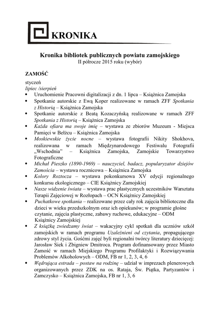 KRONIKA Kronika bibliotek publicznych powiatu zamojskiego II półrocze 2015 roku (wybór) ZAMOŚĆ styczeń lipiec /sierpień Uruchomienie Pracowni digitalizacji z dn. 1 lipca – Książnica Zamojska Spotkanie autorskie z Ewą Koper realizowane w ramach ZFF Spotkania z Historią – Książnica Zamojska Spotkanie autorskie z Beatą Kozaczyńską realizowane w ramach ZFF Spotkania z Historią – Książnica Zamojska Każda ofiara ma swoje imię – wystawa ze zbiorów Muzeum - Miejsca Pamięci w Bełżcu – Książnica Zamojska Moskiewskie życie nocne – wystawa fotografii Nikity Shokhova, realizowana w ramach Międzynarodowego Festiwalu Fotografii „Wschodnia” – Książnica Zamojska, Zamojskie Towarzystwo Fotograficzne Michał Pieszko (1890-1969) – nauczyciel, badacz, popularyzator dziejów Zamościa – wystawa rocznicowa – Książnica Zamojska Kolory Roztocza – wystawa pokonkursowa XV edycji regionalnego konkursu ekologicznego – CIE Książnicy Zamojskiej Nasze widzenie świata – wystawa prac plastycznych uczestników Warsztatu Terapii Zajęciowej w Rozłopach – OCN Książnicy Zamojskiej Puchatkowe spotkania – realizowane przez cały rok zajęcia biblioteczne dla dzieci w wieku przedszkolnym oraz ich opiekunów; w programie głośne czytanie, zajęcia plastyczne, zabawy ruchowe, edukacyjne – ODM Książnicy Zamojskiej Z książką zwiedzamy świat – wakacyjny cykl spotkań dla uczniów szkół zamojskich w ramach programu Uzależnieni od czytania, propagującego zdrowy styl życia. Gośćmi zajęć byli regionalni twórcy literatury dziecięcej: Jarosław Siek i Zbigniew Dmitroca. Program dofinansowany przez Miasto Zamość w ramach Miejskiego Programu Profilaktyki i Rozwiązywania Problemów Alkoholowych – ODM, FB nr 1, 2, 3, 4, 6 Wędrująca estrada – postaw na rodzinę – udział w imprezach plenerowych organizowanych przez ZDK na os. Rataja, Św. Piątka, Partyzantów i Zamczysko – Książnica Zamojska, FB nr 1, 3, 6 Wystawa prac malarskich Piotra Rudnika – FB nr 3 Wymiana sprzętu bibliotecznego (dofinansowanie z programu Infrastruktura kultury MKiDN) – FB nr 4 Urlop z książką – nowości – ciekawości – wystawa – FB nr 5 wrzesień Narodowe czytanie 2015. Lalka Bolesława Prusa – zamojska edycja ogólnopolskiej akcji promującej czytelnictwo, z udziałem m.in. Prezydenta Miasta Zamość, słuchaczy ZUTW, mieszkańców ul. B. Prusa, młodzieży szkolnej oraz przewodników turystycznych – Książnica Zamojska Książnica Zamojska otrzymała wyróżnienie Miejsce Przyjazne Dzieciom 2015 Zamojska Biesiada Literacka z udziałem Małgorzaty Soja, autorki książki Kochałam Ksawerego – Książnica Zamojska Spotkanie Dyskusyjnego Klubu Książki poświęcone opowiadaniom Stefana Dardy Opowiem ci mroczną historię – Książnica Zamojska Non omnis moriar – literacka twórczość Karola Wojtyły – wystawa rocznicowa – Książnica Zamojska Kresy sentymentalne – utracone dziedzictwo – wystawa w ramach obchodów Europejskich Dni Dziedzictwa – Książnica Zamojska Spotkanie literackie niepełnosprawnych twórców – OCN Książnicy Zamojskiej Błogosławiony ks. Jerzy Popiełuszko – duszpasterz robotników – wystawa z okazji 35 rocznicy powstania NSZZ Solidarność – OCN Książnicy Zamojskiej Nasze widzenie świata – wystawa – OCN Książnicy Zamojskiej Tarcze szkolne – wystawa ze zbiorów prywatnych – ODM Książnicy Zamojskiej Wycieczka Zespołów Rewalidacyjnych „Krok za krokiem” w Zamościu – ODM Książnicy Zamojskiej Sobotnie spotkania z książką – cotygodniowe zajęcia dla dzieci i młodzieży realizowane w czasie roku szkolnego; w programie m.in. głośne czytanie książek, konkursy, gry, zabawy, zajęcia plastyczne realizowane w oparciu o czytane teksty – ODM Książnicy Zamojskiej Puchatkowe spotkania – zajęcia biblioteczne – ODM Książnicy Zamojskiej Książki do czytania uczestniczącego z dziećmi niemówiącymi – wystawa ODM Książnicy Zamojskiej, ZNSS „Krok za krokiem” Rozczytane „Słoneczko” – głośne czytanie w Przedszkolu „Słoneczko” – ODM Książnicy Zamojskiej Mity i fakty o dopalaczach i marihuanie – warsztaty profilaktyczne prowadzone przez I. Kwiatkowską i A. Górską w ramach programu Uzależnieni od czytania – ODM Książnicy Zamojskiej, FB nr 3, 4 Stawiam na… Mój bohater literacki – ogłoszenie konkursu plastycznego w ramach projektu Uzależnieni od czytania – ODM, FB nr 1, 2, 3, 4, 6 Biblioteka czeka – realizowane pod wspólnym hasłem cotygodniowe zajęcia biblioteczne dla dzieci i młodzieży, łączące różne formy: głośne czytanie, konkursy, zajęcia plastyczne, gry i zabawy – FB nr 1, 2, 3, 4, 6 Poznajemy pracę statystyka – zajęcia dla dzieci młodszych prowadzone przez pracowników Urzędu Statystycznego w Zamościu – FB nr 1, 3, 4 Zapraszamy. Tu czytamy – cykl głośnego czytania w Przedszkolach nr 1, 15, Przedszkolu Językowym „For Kids” i filii Niepublicznego Przedszkola „Słoneczko” – FB nr 1 Bajki na każdą porę roku – głośne czytanie w Przedszkolu nr 13 – FB nr 2 Wycieczka z Przedszkola nr 13 z Oddziałami Integracyjnymi – FB nr 2 Źródła informacji – lekcja biblioteczna dla uczniów ZSZRR – FB nr 2 Bajeczka dla przedszkolaka – głośne czytanie w Przedszkolu nr 7, 14 i SP nr 9, w grupie przedszkolnej Dwujęzycznej Szkoły Smart School oraz w Punkcie Przedszkolnym „Zuza”– FB nr 3 Godzina na historyjkę – głośne czytanie w Przedszkolach nr 5 i 12 – FB nr 4 Uruchomienie punktu bibliotecznego na Os. Zamczysko – FB nr 4, Stowarzyszenie „Otwarte serca” Światowy Dzień Pierwszej Pomocy – wrzesień – wystawa – FB nr 5 Spotkanie z bajką – głośne czytanie w Przedszkolu nr 6 – FB nr 6 październik CzytaMy! – zamojska edycja ogólnopolskiej kampanii promującej czytelnictwo; w programie 2 spotkania (dla dzieci i dla dorosłych) z Anetą Todorczuk-Perchu