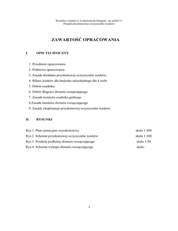 Świetlica wiejska w Lichnówkach Drugich , dz.nr205/11 Projekt przydomowej oczyszczalni ścieków ZAWARTOŚĆ OPRACOWANIA I. OPIS TECHNICZNY 1. Przedmiot opracowania. 2. Podstawa opracowania. 3. Zasada działania przydomowej oczyszczalni ścieków. 4. Bilans ścieków dla budynku mieszkalnego dla 4 osób 5. Dobór osadnika 6. Dobór długości drenażu rozsączającego 7. Zasada montażu osadnika gnilnego 8.Zasada montażu drenażu rozsączającego 9. Zasady eksploatacji przydomowej oczyszczalni ścieków II. RYSUNKI Rys.1. Plan sytuacyjno-wysokościowy skala 1:500 Rys.2. Schemat przydomowej oczyszczalni ścieków skala 1:100 Rys.3. Przekrój podłużny drenażu rozsączającego skala 1:50 Rys.4. Schemat wykopu drenażu rozsączającego skala - 1 Świetlica wiejska w Lichnówkach Drugich , dz.nr205/11 Projekt przydomowej oczyszczalni ścieków OPIS TECHNICZNY ŚWIETLICA WIEJSKA W LICHNÓWKACH DRUGICH, DZ. NR 205/11 PROJEKT PRZYDOMOWEJ OCZYSZCZALNI ŚCIEKÓW 1. Przedmiot opracowania. Przedmiotem inwestycji jest lokalizacja przydomowej oczyszczalni ścieków na potrzeby obiektu, zlokalizowanego Lichnówkach Drugich, dz. nr 205/11. 2. Podstawa opracowania. 2.1 Zlecenie inwestora, 2.2 Plam sytuacyjno wysokościowej, 2.3 Normy i przepisy branżowe 2.4 Badania geotechniczne. 3. Zasada działania przydomowej oczyszczalni ścieków. Ścieki bytowe doprowadzane są do zbiornika gnilnego , gdzie ulegają sedymentacji zawiesin opadających, flotacji tłuszczów i piany fermentacyjnej oraz fermentacji zgromadzonych osadów. Mniej obciążone ścieki przepływają przez filtr doczyszczający i zostają skierowane do studzienki rozgałęźnej , która dzięki swojej konstrukcji zapewnia ich równomierny rozpływ do nitek drenażowych i do złoża rozsączającego, gdzie odbywa się końcowy proces biologicznego oczyszczania przy udziale bakterii tlenowych. Ścieki rozsączane za pomocą rur perforowanych przesiąkają przez różne warstwy gruntu, w których następuje proces biologicznego rozkładu na substancje mineralne, które ostatecznie przenikają do wody gruntowej. Układ napowietrzająco wentylacyjny systemu działa dzięki grawitacyjnemu przepływowi powietrza w wyniku powstałej różnicy ciśnień między kominkami napowietrzającymi ,a wylotem odpowietrzenia kanalizacji wewnętrznej , który jest odprowadzony ponad dachem budynku. 2 Świetlica wiejska w Lichnówkach Drugich , dz.nr205/11 Projekt przydomowej oczyszczalni ścieków 4. Bilans ścieków dla budynku świetlicy wiejsckiej Przyjęto ilość ścieków równą ilości zużywanej wody: Średnie dobowe zużycie wody Qd śr: Qd śr = q x n gdzie: q - jednostkowe zużycie wody przypadające na jednego użytkowniak ( q = 50 dm3 / M d ) n - liczba mieszkańców ( n = 10 ) Qd śr = 0,050 x 10 = 0,5 m3 / d Maksymalne dobowe zużycie wody Qd max: Qd max = Qd śr x Nd gdzie: Nd - współczynnik nierównomierności dobowej ( Nd = 1,2 ) Qd max = 0.5 x 1,2 = 0.6 m3 / d Maksymalne godzinowe zużycie wody Qh max: Qh max = ( Qd max x Nh ) / 24 gdzie: Nh - współczynnik nierównomierności godzinowej ( Nh = 1,8 ) Qh max = ( 0.6 x 1,8 ) / 24 = 0.045 m3 / h Średnie godzinowe zużycie wody Qh śr: Qh śr = Qd śr / 24 = 0.5 / 24 = 0.021 m3 / h Średnie roczne zużycie wody Qa śr: Qa śr = Qd śr x 365 = 0.5 x 365 = 182,5 m3 / a 5. Dobór osadnika Vos = Qd śr x t gdzie: Vos - pojemność osadnika t - czas przetrzymania ścieków w osadniku ( przyjęto t = 4,0 d ) Vos = 0.5 x 4,0 = 2.0 m3 Przyjęto osadnik gnilny o pojemności 2,0 m3 3 Świetlica wiejska w Lichnówkach Drugich , dz.nr205/11 Projekt przydomowej oczyszczalni ścieków 6. Dobór długości drenażu rozsączającego Długość drenażu rozsączającego zależna jest od ilości użytkowników oraz od rodzaju gruntu znajdującego się na danej posesji. Przyjęto długość drenażu 32 mb ( 2 nitki drenażowe, każda po 16 mb długości ), szerokość wykopu: 0,60 m 7. Zasada montażu osadnika gnilnego 1. Zbiorniki dostosowane są do wbudowania pod powierzchnią terenu. 2. Zbiornik nie może być lokalizowany pod jezdnią, natomiast może być umieszczony pod chodnikiem. 3. W wykopie należy przygotować dno poprzez wykonanie warstwy piasku stabilizowanego cementem o grubości min. 15 cm. Tak przygotowane podłoże powinno być szersze od wymiarów osadnika o około 60 cm - sprawdzić poziom. 4. Zbiornik należy ostrożnie umieścić w wykopie, za pomocą zawiesia linowego. Zabrania się mocować zawiesie na rurze wlotowej i wylotowej. 5. Zbiornik należy tak posadowić, aby rura doprowadzająca ścieki z budynku do osadnika miała zachowany spadek 2 - 3 %. 6. Po posadowieniu, lecz przed wykonaniem zasypywania należy wypoziomować osadnik. 7. Zasypywanie zbiornika powinno odbywać się z równoczesnym napełnianiem go wodą. Podczas zasypywania wody w zbiorniku powinno być za każdym razem 10 cm powyżej poziomu zasypywania. 8. Zbiornik obsypać piaskiem stabilizowanym cementem o szerokości około 10 cm. W tym celu zaleca się wykonanie szalunku, który umożliwi wykonanie otoczki piaskowo - cementowej o wymaganej szerokości oraz zasypanie pozostałej, wolnej powierzchni wykopu gruntem rodzimym. 9. Zasypywanie wykonywać warstwami, dokładnie zagęszczając. 10. Piasek wykorzystywany do wykonania otoczki piaskowo cementowej powinien być pozbawiony kamieni oraz innych ostrych zanieczyszczeń, nie można zrzucać go z dużej wysokości. 11. Wokół szyjki włazu należy również wykonać obsypkę z piasku stabilizowanego cementem. 4 Świetlica wiejska w Lichnówkach Drugich , dz.nr205/11 Projekt przydomowej oczyszczalni ścieków 12. Przy głębszym posadowianiu zbiornika (powyżej 40 cm naziomu) w celu przeniesienia nadmiernego obciążenia gruntem należy nad zbiornikiem wykonać płytę ze zbrojonego betonu. Pod płytą powinna znajdować się warstwa piasku. 13. Gdy zbiornik instalowany jest w gruncie uwodnionym, na dnie wykopu należy wykonać płytę betonową o ciężarze wię