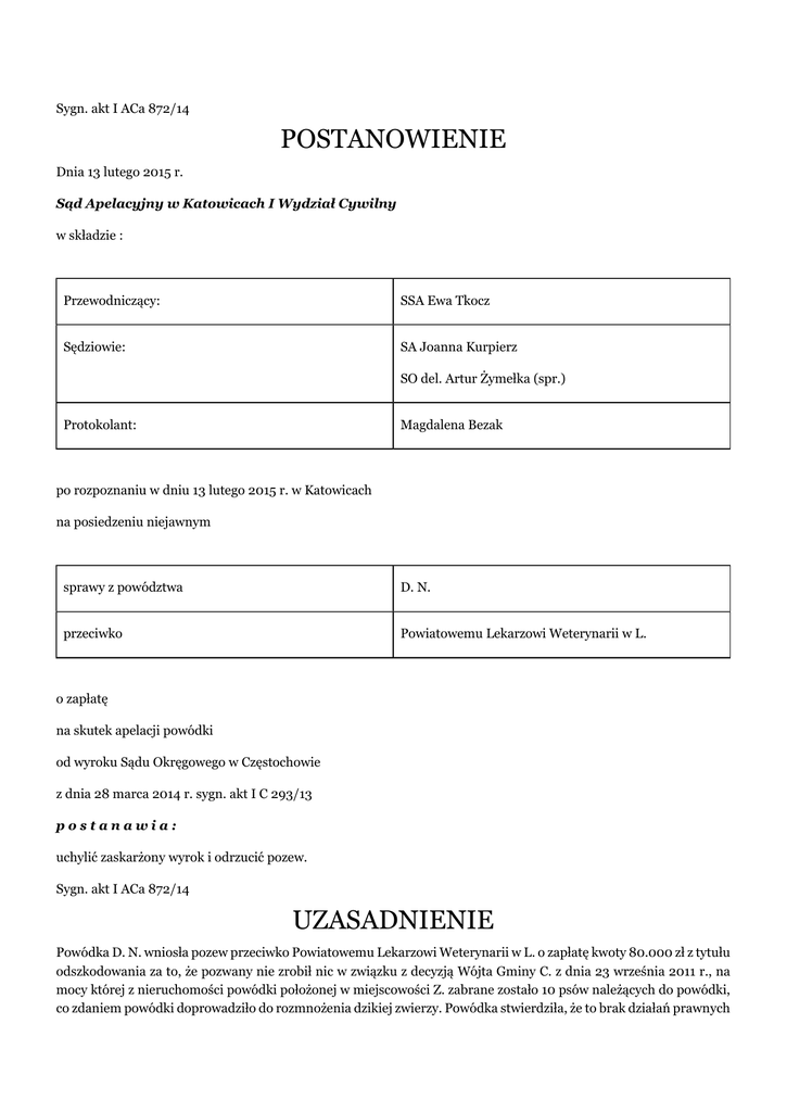Sygn. akt I ACa 872/14 POSTANOWIENIE Dnia 13 lutego 2015 r. Sąd Apelacyjny w Katowicach I Wydział Cywilny w składzie : Przewodniczący: SSA Ewa Tkocz Sędziowie: SA Joanna Kurpierz SO del. Artur Żymełka (spr.) Protokolant: Magdalena Bezak po rozpoznaniu w dniu 13 lutego 2015 r. w Katowicach na posiedzeniu niejawnym sprawy z powództwa D. N. przeciwko Powiatowemu Lekarzowi Weterynarii w L. o zapłatę na skutek apelacji powódki od wyroku Sądu Okręgowego w Częstochowie z dnia 28 marca 2014 r. sygn. akt I C 293/13 postanawia: uchylić zaskarżony wyrok i odrzucić pozew. Sygn. akt I ACa 872/14 UZASADNIENIE Powódka D. N. wniosła pozew przeciwko Powiatowemu Lekarzowi Weterynarii w L. o zapłatę kwoty 80.000 zł z tytułu odszkodowania za to, że pozwany nie zrobił nic w związku z decyzją Wójta Gminy C. z dnia 23 września 2011 r., na mocy której z nieruchomości powódki położonej w miejscowości Z. zabrane zostało 10 psów należących do powódki, co zdaniem powódki doprowadziło do rozmnożenia dzikiej zwierzy. Powódka stwierdziła, że to brak działań prawnych i organizacyjnych ze strony pozwanego doprowadził do tego, że nie może od 2-óch lat korzystać z tej nieruchomości, ponieważ przebywanie na jej terenie grozi śmiercią. Oddalając powództwo Sąd Okręgowy w Częstochowie ustalił, że w dniu 23 września 2011 r. przeprowadzono kontrolę warunków przetrzymywania przez powódkę psów w miejscowości Z. przy ul. (...). W toku czynności kontrolnych stwierdzono utrzymywanie psów w tragicznych warunkach. Siedem psów przebywało w ciasnych kojcach, które nie były sprzątane, bez dostępu do wody. Cztery psy były zamknięte w pomieszczeniach bez okien i dostępu światła. Po wypuszczeniu okazywały objawy ślepoty. Powyższe okoliczności stały się podstawą do wydania przez Wójta Gminy C. decyzji nr (...) z dnia 23 września 2011 r., na mocy której powódce odebrano psy i umieszczono w schronisku prowadzonym przez Fundację (...). W tak ustalonym stanie faktycznym Sąd pierwszej instancji stwierdził, że powódka nie wykazała w świetle art.415 k.c. zasadności dochodzonego roszczenia, ponieważ nie udowodniła, aby pozwany zachowywał się w sposób bezprawny, aby powódka poniosła szkodę oraz, by pomiędzy zachowaniem pozwanego a deklarowaną przez powódkę szkodą zachodził adekwatny związek przyczynowy. Apelację od tego wyroku wniosła powódka domagając się uchylenia wyroku i jego przekazania do ponownego rozpoznania, zarzucając że udowodniła wszystkie okoliczności, które uzasadniały uwzględnienie jej powództwa. Sąd Apelacyjny zważył, co następuje: Zgodnie z art.378§1 k.p.c. sąd drugiej instancji rozpoznaje sprawę w granicach apelacji, jednakże w granicach zaskarżenia bierze z urzędu pod uwagę nieważność postępowania. Stosownie do art.379 pkt 2 k.p.c. nieważność postępowania zachodzi jeżeli strona nie miała zdolności sądowej lub procesowej. W myśl art.64 k.p.c. zdolność sądową, tj. zdolność występowania w procesie jako strona posiada każda osoba fizyczna i prawna. Zdolność sądową mają także jednostki organizacyjne niebędące osobami prawnymi, którym jednakże ustawa przyznaje zdolność prawną. Zgodnie z art.33 k.c. osobami prawnymi są Skarb Państwa i jednostki organizacyjne, którym przepisy szczególne przyznają osobowość prawną. Powódka w rozpoznawanej sprawie nie pozwała imiennie Powiatowego Lekarza Weterynarii w L. jako osoby fizycznej – tym bardziej, że w czasie kiedy powódce odbierano psy funkcję tę pełniła inna osoba niż obecnie - ale jako jednostkę organizacyjną odpowiedzialną za zapewnienie bezpieczeństwa przed dzikimi zwierzętami. Zgodnie z art.5 ust.1 ustawy z dnia 29 stycznia 2004 r. o Inspekcji Weterynaryjnej (Dz.U.2010.112.744 j.t.) powiatowy lekarz weterynarii, jako kierownik powiatowej inspekcji weterynaryjnej wchodzącej w skład niezespolonej administracji rządowej jest jedynie jednym z organów Inspekcji Weterynaryjnej, która z kolei stosownie do art.1 i art.22 ust.3 ustawy z 4 września 1997 r. o działach administracji rządowej (Dz.U.2013.743 j.t.) podlega Ministrowi właściwemu do spraw rolnictwa. Ustawa o Inspekcji Weterynaryjnej w art.9 wskazuje jakie warunki należy spełnić, aby zostać powiatowym lekarzem weterynarii oraz statuuje, że powiatowy lekarz weterynarii podlega wojewódzkiemu lekarzowi weterynarii (art.8 ust.3), a swoje zadania wykonuje przy pomocy powiatowego inspektoratu weterynarii, którego jest kierownikiem (art.11 ust.2), a który to inspektorat jest państwową jednostką budżetową (art.12 ust.2). Żaden z przepisów nie przyznaje Powiatowemu Lekarzowi Weterynarii osobowości prawnej. Nie jest on zatem osobą prawną. Nie ma również przepisu, który przyznawałby Powiatowemu Lekarzowi Weterynarii zdolność sądową, tj. zdolność do samodzielnego występowania jako strona w postępowaniu cywilnym. Z tych przyczyn oznaczenie przez powódkę pozwanego jako jednostki nieposiadającej zdolności sądowej, stosownie do art.199§1 pkt 3 k.p.c. skutkować winno było odrzuceniem pozwu. W sytuacji bowiem, w której pozew wniesiono przeciwko jednostce nie posiadającej zdolności sądowej, w świetle art. 70 i 71 k.p.c. nie jest możliwe usunięcie tego braku w żaden sposób, w konsekwencji czego w takim przypadku pozew należy odrzucić bez wzywania o jego uzupełnienie ( por. postanowienie Sądu Najwyższego z dnia 15 maja 2009 r., II CSK 681/08, LEX nr 519307; postanowienie Sądu Apelacyjnego z dnia 10 września 2013 r., I ACz 942/13, LEX nr 1363382 ). Z wyżej wskazanych przyczyn Sąd Apelacyjny na podstawie art.386§3 k.p.c. w zw. z art.378§1 k.p.c. i w zw. z art.379 pkt 2 k.p.c. uchylił wyrok Sądu pierwszej instancji i pozew odrzucił, co nie pozbawia powódki prawa ponownego wytoczenia powództwa przeciwko prawidłowo oznaczonemu pozwanemu.