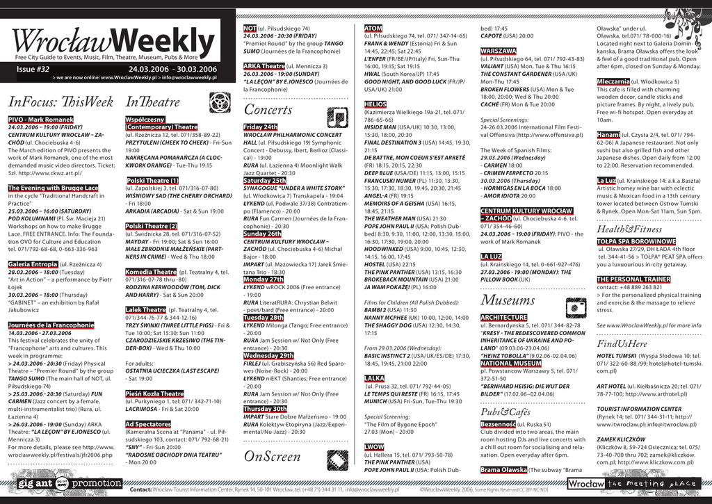 WrocławWeekly Free City Guide to Events, Music, Film, Theatre, Museum, Pubs & More Issue #32 24.03.2006 - 30.03.2006 > we are now online: www.WroclawWeekly.pl > [email protected] InFocus: ThisWeek InTheatre PIVO - Mark Romanek 24.03.2006 – 19:00 (Friday) Centrum Kultury Wrocław – Zachód (ul. Chociebuska 4-6) The March edition of PIVO presents the work of Mark Romanek, one of the most demanded music video directors. Ticket: 5zł. http://www.ckwz.art.pl/ The Evening with Brugge Lace in the cycle “Traditional Handcraft in Practice” 25.03.2006 – 16:00 (Saturday) Pod Kolumnami (Pl. Św. Macieja 21) Workshops on how to make Brugge Lace. FREE ENTRANCE. Info: The Foundation OVO for Culture and Education tel. 071/792-68-68, 0-663-336-963 Galeria Entropia (ul. Rzeźnicza 4) 28.03.2006 – 18:00 (Tuesday) “Art in Action” – a performance by Piotr Łojek 30.03.2006 – 18:00 (Thursday) “GABINET” – an exhibition by Rafał Jakubowicz Journées de la Francophonie 14.03.2006 - 27.03.2006 This festival celebrates the unity of “Francophone” arts and cultures. This week in programme: > 24.03.2006 - 20:30 (Friday) Physical Theatre – “Premier Round” by the group TANGO SUMO (The main hall of NOT, ul. Piłsudskiego 74) > 25.03.2006 - 20:30 (Saturday) Fun Carmen (Jazz concert by a female, multi-instrumentalist trio) (Rura, ul. Łazienna 4) > 26.03.2006 - 19:00 (Sunday) ARKA Theatre: “La leçon” by E.Ionesco (ul. Mennicza 3) For more details, please see http://www. wroclawweekly.pl/festivals/jfr2006.php Współczesny (Contemporary) Theatre (ul. Rzeźnicza 12, tel. 071/358-89-22) Przytuleni (Cheek to Cheek) - Fri-Sun 19:00 Nakręcana pomarańcza (A Clockwork Orange) - Tue-Thu 19:15 Polski Theatre (1) (ul. Zapolskiej 3, tel. 071/316-07-80) Wiśniowy Sad (The Cherry Orchard) - Fri 18:00 Arkadia (Arcadia) - Sat & Sun 19:00 Polski Theatre (2) (ul. Świdnicka 28, tel. 071/316-07-52) Mayday - Fri 19:00; Sat & Sun 16:00 Małe zbrodnie małżeńskie (Partners in Crime) - Wed & Thu 18:00 Komedia Theatre (pl. Teatralny 4, tel. 071/316-07-78 thru -80) Rodzina Kerwoodów (Tom, Dick and Harry) - Sat & Sun 20:00 NOT (ul. Piłsudskiego 74) ATOM 24.03.2006 - 20:30 (Friday) “Premier Round” by the group TANGO SUMO (Journées de la Francophonie) (ul. Piłsudskiego 74, tel. 071/ 347-14-65) Frank & Wendy (Estonia) Fri & Sun 14:45, 22:45; Sat 22:45 L’Enfer (FR/BE/JP/Italy) Fri, Sun-Thu 16:00, 19:15; Sat 19:15 Hwal (South Korea/JP) 17:45 Good Night, and Good Luck (FR/JP/ USA/UK) 21:00 ARKA Theatre (ul. Mennicza 3) 26.03.2006 - 19:00 (Sunday) “La leçon” by E.Ionesco (Journées de la Francophonie) Concerts Friday 24th WROCŁAW PHILHARMONIC CONCERT HALL (ul. Piłsudskiego 19) Symphonic Concert - Debussy, Ibert, Berlioz (Classical) - 19:00 RURA (ul. Łazienna 4) Moonlight Walk Jazz Quartet - 20:30 Saturday 25th SYNAGOGUE “UNDER A WHITE STORK” (ul. Włodkowica 7) Transkapela - 19:04 ŁYKEND (ul. Podwale 37/38) Contratiempo (Flamenco) - 20:00 RURA Fun Carmen (Journées de la Francophonie) - 20:30 Sunday 26th CENTRUM KULTURY WROCłAW – ZACHÓD (ul. Chociebuska 4-6) Michał Bajor - 18:00 IMPART (ul. Mazowiecka 17) Jarek Śmietana Trio - 18:30 Monday 27th Lalek Theatre (pl. Teatralny 4, tel. ŁYKEND wROCK 2006 (Free entrance) - 19:00 RURA LiteratRURA: Chrystian Belwit - poet/bard (Free entrance) - 20:00 071/344-76-77 & 344-12-16) Trzy Świnki (Three Little Pigs) - Fri & Tue 10:00; Sat 15:30; Sun 11:00 Czarodziejskie krzesiwo (The Tinder-Box) - Wed & Thu 10:00 Tuesday 28th ŁYKEND Milonga (Tango; Free entrance) - 20:00 RURA Jam Session w/ Not Only (Free entrance) - 20:30 For adults: Ostatnia Ucieczka (Last Escape) - Sat 19:00 FIRLEJ (ul. Grabiszyńska 56) Red Sparowes (Noise-Rock) - 20:00 ŁYKEND niEKT (Shanties; Free entrance) - 20:00 RURA Jam Session w/ Not Only (Free entrance) - 20:30 Pieśń Kozła Theatre (ul. Purkyniego 1, tel: 071/ 342-71-10) Lacrimosa - Fri & Sat 20:00 Ad Spectatores (Kameralna Scena at “Panama” - ul. Piłsudskiego 103, contact: 071/ 792-68-21) “Sny” - Fri-Sun 20:00 “Radosne obchody Dnia Teatru” - Mon 20:00 Wednesday 29th Thursday 30th IMPART Stare Dobre Małżeńswo - 19:00 RURA Kolektyw Etopiryna (Jazz/Experimental/Nu-Jazz) - 20:30 OnScreen HELIOS (Kazimierza Wielkiego 19a-21, tel. 071/ 786-65-66) Inside Man (USA/UK) 10:30, 13:00, 15:30, 18:00, 20:30 Final Destination 3 (USA) 14:45, 19:30, 21:15 De battre, mon coeur s’est arreté (FR) 18:15, 20:15, 22:30 Deep Blue (USA/DE) 11:15, 13:00, 15:15 Francuski Numer (PL) 11:30, 13:30, 15:30, 17:30, 18:30, 19:45, 20:30, 21:45 Angel-A (FR) 19:15 Memoirs of a Geisha (USA) 16:15, 18:45, 21:15 The Weather Man (USA) 21:30 Pope John Paul II (USA: Polish Dubbed) 8:30, 9:30, 11:00, 12:00, 13:30, 15:00, 16:30, 17:30, 19:00, 20:00 Hoodwinked (USA) 9:00, 10:45, 12:30, 14:15, 16:00, 17:45 Hostel (USA) 22:15 The Pink Panther (USA) 13:15, 16:30 Brokeback Mountain (USA) 21:00 Ja Wam Pokażę! (PL) 16:00 Films for Children (All Polish Dubbed): Bambi 2 (USA) 11:30 Nanny McPhee (UK) 10:00, 12:00, 14:00 The Shaggy Dog (USA) 12:30, 14:30, 17:15 From 29.03.2006 (Wednesday): Basic Instinct 2 (USA/UK/ES/DE) 17:30, 18:45, 19:45, 21:00 22:00 LALKA (ul. Prusa 32, tel. 071/ 792-44-05) Le Temps qui reste (FR) 16:15, 17:45 Munich (USA) Fri-Sun, Tue-Thu 19:30 Special Screening: “The Film of Bygone Epoch” 27.03 (Mon) - 20:00 LWOW (ul. Hallera 15, tel. 071/ 793-50-78) The Pink Panther (USA) Pope John Paul II (USA: Polish Dub- Contact: Wrocław Tourist Information Center, Rynek 14, 50-101 Wrocław, tel. (+48 71) 344 31 11, [email protected] bed) 17:45 Capote (USA) 20:00 WARSZAWA (ul. Piłsudskiego 64, tel. 071/ 792-43-83) Valiant (USA) Mon, Tue & Thu 16:15 The Constant Gardener (USA/UK) Mon-Thu 17:45 Broken Flowers (USA) Mon & Tue 18:00, 20:00; Wed & Thu 20:00 Caché (FR) Mon & Tue 20:00 Special Screenings: 24-26.03.2006 International Film Festival Offensiva (http://www.offensiva.pl) The Week of Spanish Films: 29.03.2006 (Wednesday) - Car
