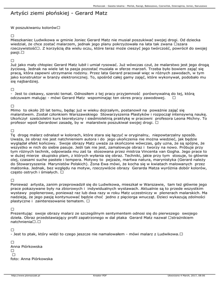 Płońszczak - Gazeta lokalna - Płońsk, Raciąż, Baboszewo, Czerwińsk, Dzierzążnia, Joniec, Naruszewo Artyści ziemi płońskiej - Gerard Matz W poszukiwaniu kolorów Mieszkaniec Ludwikowa w gminie Joniec Gerard Matz nie musiał poszukiwać swojej drogi. Od dziecka wiedział, że chce zostać malarzem, jednak jego plany pokrzyżowała na lata tak zwana szara rzeczywistość. Z korzyścią dla wielu oczu, które teraz może cieszyć jego twórczość, powrócił do swojej pasji. Już jako mały chłopiec Gerard Matz lubił i umiał rysować. Już wówczas czuł, że malarstwo jest jego drogą życiową. Jednak na wiele lat ta pasja pozostać musiała w sferze marzeń. Trzeba było bowiem zająć się pracą, która zapewni utrzymanie rodziny. Przez lata Gerard pracował więc w różnych zawodach, w tym jako konstruktor w branży elektronicznej. To, spośród całej gamy zajęć, które wykonywał, podobało mu się najbardziej. - Jest to ciekawy, szeroki temat. Odnosiłem z tej pracy przyjemność porównywalną do tej, którą odczuwam malując - mówi Gerard Matz wspominając ten okres pracy zawodowej. Mimo to około 20 lat temu, będąc już w wieku dojrzałym, postanowił na poważnie zająć się malarstwem. Został członkiem Warszawskiego Stowarzyszenia Plastyków i rozpoczął intensywną naukę. Ukończył sześcioletni kurs teoretyczny i siedmioletnią praktykę w pracowni profesora Leona Michny. To profesor wpoił Gerardowi zasadę, by w malarstwie poszukiwał swojej drogi. Tę drogę malarz odnalazł w kolorach, które stara się łączyć w oryginalny, niepowtarzalny sposób. Uważa, że obraz nie jest natchnieniem autora i do jego ukończenia nie można wiedzieć, jak będzie wyglądał efekt końcowy. Swoje obrazy Matz uważa za skończone wówczas, gdy uzna, że są spójne, że wszystko w nich do siebie pasuje. Jeśli tak nie jest, zamalowuje obraz i tworzy na nowo. Próbuje przy tym różnych technik, odpowiada mu zaś ta stosowana przez mistrza Vincenta van Gogha. Jego prace to w dużej mierze skupisko plam, z których wyłania się obraz. Techniki, jakie przy tym stosuje, to głównie olej, czasami suche pastele i tempera. Motywy to pejzaże, martwa natura, marynistyka (Gerard należy do Stowarzyszenia Marynistów Polskich). Żona Ewa mówi, że kocha się w kwiatach malowanych przez małżonka. Jednak, bez względu na motyw, rzeczywiście obrazy Gerarda Matza wyróżnia dobór kolorów, często ostrych i śmiałych. Ponieważ artysta, zanim przeprowadził się do Ludwikowa, mieszkał w Warszawie, tam też głównie jego prace pokazywane były na zbiorowych i indywidualnych wystawach. Aktualnie są to przede wszystkim wystawy poplenerowe, ponieważ raz lub dwa razy w roku Matz uczestniczy w plenerach malarskich. Ma nadzieję, że jego pasję kontynuować będzie choć jedno z pięciorga wnucząt. Dzieci wykazują zdolności plastyczne i zainteresowanie tematem. Prezentując swoje obrazy malarz ze szczególnym sentymentem odnosi się do pierwszego swojego dzieła. Obraz przedstawiający profil zapatrzonego w dal ptaka Gerard Matz nazwał strażnikiem natchnienia. - Jest to ptak, który widzi to czego jeszcze nie namalowałem - mówi malarz z Ludwikowa. Anna Piórkowska foto: Anna Piórkowska http://www.plonszczak.pl Kreator PDF Utworzono 4 March, 2017, 08:06