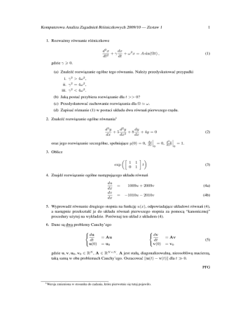 Komputerowa Analiza Zagadnień Różniczkowych 2009/10 — Zestaw 1 1 1. Rozważmy równanie różniczkowe dx d2 x +γ + ω 2 x = A sin(Ωt) , 2 dt dt (1) gdzie γ > 0. (a) Znaleźć rozwiazanie ˛ ogólne tego równania. Należy przedyskutować przypadki i. γ 2 > 4ω 2 , ii. γ 2 = 4ω 2 , iii. γ 2 < 4ω 2 . (b) Jaka˛ postać przybiera rozwiazanie ˛ dla t >> 0? (c) Przedyskutować zachowanie rozwiazania ˛ dla Ω ' ω. (d) Zapisać róznanie (1) w postaci układu dwu równań pierwszego rz˛edu. 2. Znaleźć rozwiazanie ˛ ogólne równania1 d2 y dy d3 y +5 2 +8 + 4y = 0 dx dx dx dy oraz jego rozwiazanie ˛ szczególne, spełniajace ˛ y(0) = 0, dx = 0, 0 (2) d2 y dx2 = 1. 0 3. Oblicz exp 1 0 1 1 t (3) 4. Znajdź rozwiazanie ˛ ogólne nast˛epujacego ˛ układu równań du dx dv dx = 1009u + 2009v (4a) = −1010u − 2010v (4b) 5. Wyprowadź równanie drugiego stopnia na funkcj˛e u(x), odpowiadajace ˛ układowi równań (4), a nast˛epnie przekształć je do układu równań pierwszego stopnia za pomoca˛ “kanonicznej” procedury użytej na wykładzie. Porównaj ten układ z układem (4). 6. Dane sa˛ dwa problemy Cauchy’ego du dt u(0) = Au = u0 dv dt v(0) = Av (5) = v0 gdzie u, v, u0 , v0 ∈ RN , A ∈ RN ×N . A jest stała,˛ diagonalizowalna,˛ nieosobliwa˛ macierza,˛ taka˛ sama˛ w obu problemach Cauchy’ego. Oszacować ku(t) − v(t)k dla t 0. PFG 1 Wersja zmieniona w stosunku do zadania, które pierwotnie si˛e tutaj pojawiło.
