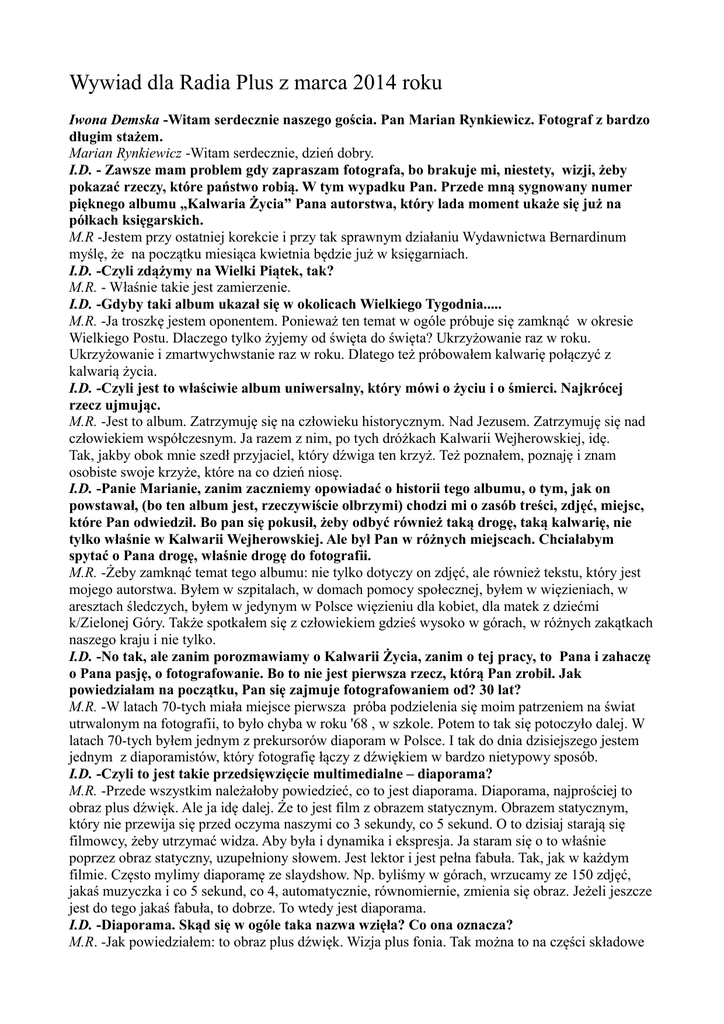 Wywiad dla Radia Plus z marca 2014 roku Iwona Demska -Witam serdecznie naszego gościa. Pan Marian Rynkiewicz. Fotograf z bardzo długim stażem. Marian Rynkiewicz -Witam serdecznie, dzień dobry. I.D. - Zawsze mam problem gdy zapraszam fotografa, bo brakuje mi, niestety, wizji, żeby pokazać rzeczy, które państwo robią. W tym wypadku Pan. Przede mną sygnowany numer pięknego albumu „Kalwaria Życia” Pana autorstwa, który lada moment ukaże się już na półkach księgarskich. M.R -Jestem przy ostatniej korekcie i przy tak sprawnym działaniu Wydawnictwa Bernardinum myślę, że na początku miesiąca kwietnia będzie już w księgarniach. I.D. -Czyli zdążymy na Wielki Piątek, tak? M.R. - Właśnie takie jest zamierzenie. I.D. -Gdyby taki album ukazał się w okolicach Wielkiego Tygodnia..... M.R. -Ja troszkę jestem oponentem. Ponieważ ten temat w ogóle próbuje się zamknąć w okresie Wielkiego Postu. Dlaczego tylko żyjemy od święta do święta? Ukrzyżowanie raz w roku. Ukrzyżowanie i zmartwychwstanie raz w roku. Dlatego też próbowałem kalwarię połączyć z kalwarią życia. I.D. -Czyli jest to właściwie album uniwersalny, który mówi o życiu i o śmierci. Najkrócej rzecz ujmując. M.R. -Jest to album. Zatrzymuję się na człowieku historycznym. Nad Jezusem. Zatrzymuję się nad człowiekiem współczesnym. Ja razem z nim, po tych dróżkach Kalwarii Wejherowskiej, idę. Tak, jakby obok mnie szedł przyjaciel, który dźwiga ten krzyż. Też poznałem, poznaję i znam osobiste swoje krzyże, które na co dzień niosę. I.D. -Panie Marianie, zanim zaczniemy opowiadać o historii tego albumu, o tym, jak on powstawał, (bo ten album jest, rzeczywiście olbrzymi) chodzi mi o zasób treści, zdjęć, miejsc, które Pan odwiedził. Bo pan się pokusił, żeby odbyć również taką drogę, taką kalwarię, nie tylko właśnie w Kalwarii Wejherowskiej. Ale był Pan w różnych miejscach. Chciałabym spytać o Pana drogę, właśnie drogę do fotografii. M.R. -Żeby zamknąć temat tego albumu: nie tylko dotyczy on zdjęć, ale również tekstu, który jest mojego autorstwa. Byłem w szpitalach, w domach pomocy społecznej, byłem w więzieniach, w aresztach śledczych, byłem w jedynym w Polsce więzieniu dla kobiet, dla matek z dziećmi k/Zielonej Góry. Także spotkałem się z człowiekiem gdzieś wysoko w górach, w różnych zakątkach naszego kraju i nie tylko. I.D. -No tak, ale zanim porozmawiamy o Kalwarii Życia, zanim o tej pracy, to Pana i zahaczę o Pana pasję, o fotografowanie. Bo to nie jest pierwsza rzecz, którą Pan zrobił. Jak powiedziałam na początku, Pan się zajmuje fotografowaniem od? 30 lat? M.R. -W latach 70-tych miała miejsce pierwsza próba podzielenia się moim patrzeniem na świat utrwalonym na fotografii, to było chyba w roku '68 , w szkole. Potem to tak się potoczyło dalej. W latach 70-tych byłem jednym z prekursorów diaporam w Polsce. I tak do dnia dzisiejszego jestem jednym z diaporamistów, który fotografię łączy z dźwiękiem w bardzo nietypowy sposób. I.D. -Czyli to jest takie przedsięwzięcie multimedialne – diaporama? M.R. -Przede wszystkim należałoby powiedzieć, co to jest diaporama. Diaporama, najprościej to obraz plus dźwięk. Ale ja idę dalej. Że to jest film z obrazem statycznym. Obrazem statycznym, który nie przewija się przed oczyma naszymi co 3 sekundy, co 5 sekund. O to dzisiaj starają się filmowcy, żeby utrzymać widza. Aby była i dynamika i ekspresja. Ja staram się o to właśnie poprzez obraz statyczny, uzupełniony słowem. Jest lektor i jest pełna fabuła. Tak, jak w każdym filmie. Często mylimy diaporamę ze slaydshow. Np. byliśmy w górach, wrzucamy ze 150 zdjęć, jakaś muzyczka i co 5 sekund, co 4, automatycznie, równomiernie, zmienia się obraz. Jeżeli jeszcze jest do tego jakaś fabuła, to dobrze. To wtedy jest diaporama. I.D. -Diaporama. Skąd się w ogóle taka nazwa wzięła? Co ona oznacza? M.R. -Jak powiedziałem: to obraz plus dźwięk. Wizja plus fonia. Tak można to na części składowe rozłożyć. Skąd się wzięło? Nie umiem tego powiedzieć. Chcę tylko zaznaczyć, że to jest bardzo mało znana forma. A szkoda. Szkoda naprawdę, że np. telewizja niemiecka, kanadyjska, francuska, duńska, belgijska stosują ją. A u nas jeszcze tego nie mamy. Bo naprawdę mamy bardzo zdolnych diaporamistów, którzy zdobywają laury w świecie. I.D. -Ale w latach 70-tych Pana diaporama była pierwszą diaporamą, która powstała w Polsce. Tak? Również przeczytałam, że to była jedna z pierwszych, które powstały na świecie w tym czasie. M.R. -No może to było tak, że to była jedna z pierwszych o tej tematyce. I.D. -A jaka to była tematyka? Czy też to była tematyka pasyjna? M.R. -To był tytuł „Miriam”. Mogę jeszcze powiedzieć, że teraz to jest bardzo komfortowa praca. Cyfrowo możemy wszystko obrobić, zrobić. Ja kiedyś, żeby wzbogacić formę prezentacji diaporamy, wyświetlałem nawet z 8, 10 rzutników slajdy. Zmieniało się je na bieżąco. Trzeba było się wstrzelić dokładnie w odpowiedni takt muzyki. Teraz możemy z dokładnością co do sekundy wszystko to zsynchronizować. I.D. -Czyli łatwiej w tej chwili, i szybciej robi się taką diaporamę niż 30, 40 lat temu? M.R. -Oj, tak. Dużo, dużo łatwiej. Prościej dokładniej. Można tak jak film, złożyć obraz i dźwięk. I.D. -A ile Pan takich diaporam wykonał w swoim życiu? M.R. -Nie umiem powiedzieć czy aż tak dużo, bo nie wiem, czy wszystkie moje prace należy zaliczyć do tych diaporam. Ale takich większych diaporam, które mają ok. godziny, tak jak film, trwają półtorej godziny, no może ze dwadzieścia parę. I.D. -W jakiej tematyce się Pan porusza w tych wszystkich diaporamach? M.R. -Najbliższa jest dla mnie tematyka socjologiczna. Tematyka „postrzegam człowieka” i tematyka sakralna. I.D. -A czy zdarzyło się Panu zrobić jakąś diaporamę taką zupeł