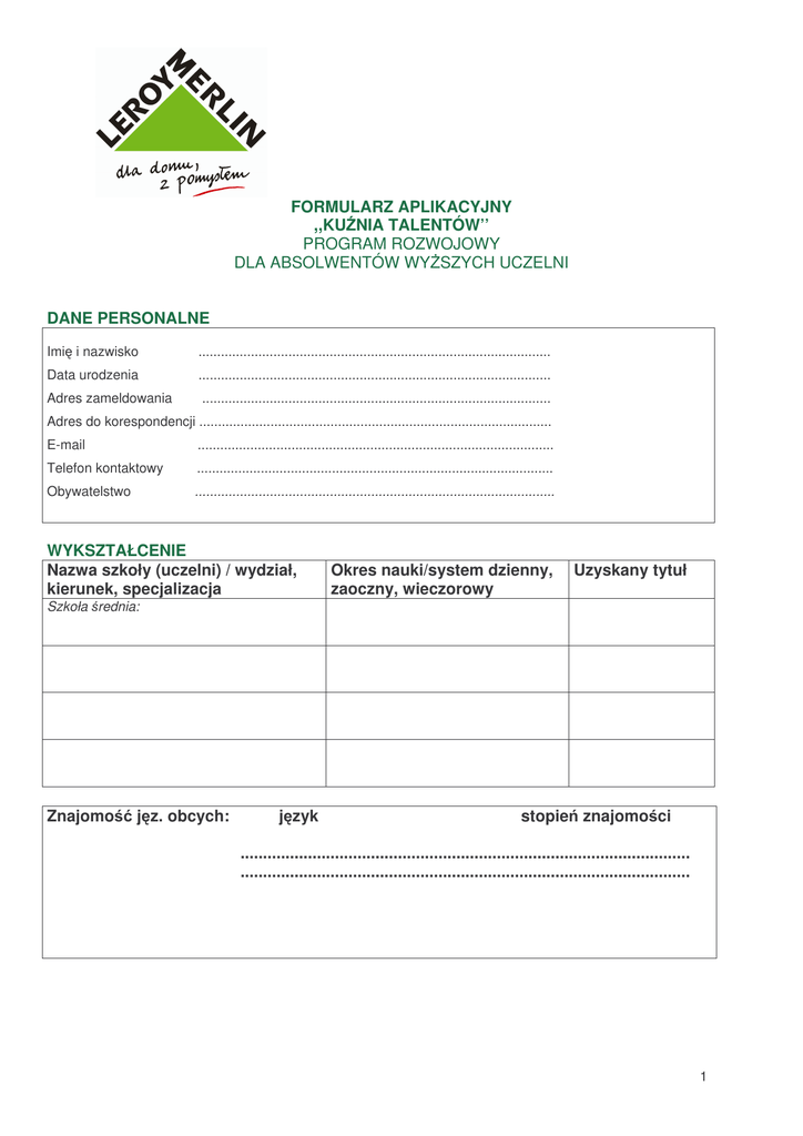 FORMULARZ APLIKACYJNY ,,KU NIA TALENTÓW’’ PROGRAM ROZWOJOWY DLA ABSOLWENTÓW WY SZYCH UCZELNI DANE PERSONALNE Imi i nazwisko .............................................................................................. Data urodzenia .............................................................................................. Adres zameldowania ............................................................................................. Adres do korespondencji .............................................................................................. E-mail ............................................................................................... Telefon kontaktowy ............................................................................................... Obywatelstwo ................................................................................................ WYKSZTAŁCENIE Nazwa szkoły (uczelni) / wydział, kierunek, specjalizacja Szkoła rednia: Znajomo j z. obcych: j zyk Okres nauki/system dzienny, zaoczny, wieczorowy Uzyskany tytuł stopie znajomo ci .................................................................................................... .................................................................................................... 1 FORMULARZ APLIKACYJNY ,,KU NIA TALENTÓW’’ PROGRAM ROZWOJOWY DLA ABSOLWENTÓW WY SZYCH UCZELNI DODATKOWE KWALIFIKACJE DO WIADCZENIE ZAWODOWE (je li je posiadasz) OD - DO Miejsce pracy, stanowisko, główne zadania JAKIE S TWOJE YCIOWE PASJE (dlaczego po wi casz im czas?) OPISZ PROJEKT, W KTÓRYM BRAŁE /BRAŁA UDZIAŁ, JAKA BYŁA TWOJA ROLA I JAKI BYŁ REZULTAT PODJ TYCH DZIAŁA ? 2 FORMULARZ APLIKACYJNY ,,KU NIA TALENTÓW’’ PROGRAM ROZWOJOWY DLA ABSOLWENTÓW WY SZYCH UCZELNI DLACZEGO CHCIAŁBY / CHCIAŁABY PRACOWA CO CHCIAŁBY / CHCIAŁABY OSI GN W HANDLU? ? UWAGI DODATKOWE 3 FORMULARZ APLIKACYJNY ,,KU NIA TALENTÓW’’ PROGRAM ROZWOJOWY DLA ABSOLWENTÓW WY SZYCH UCZELNI Wyra am zgod na przetwarzanie moich danych, zawartych w powy szym formularzu zgłoszonym Leroy Merlin, dla potrzeb procesu rekrutacji. (Zgodnie z ustaw z dn. 29.08.1997 o Ochronie Danych osobowych, DU Nr 133, poz. 883) ........................................................ PODPIS Wypełniony kwestionariusz wy lij na adres: E-mail: [email protected] z tematem: ,,Ku nia Talentów’’ i jednocze nie podpisan kopi poczt na adres: Leroy Merlin Polska Sp. z o.o. Ul. Targowa 72 03-734 Warszawa z dopiskiem ,,Ku nia Talentów’’ DATA 4