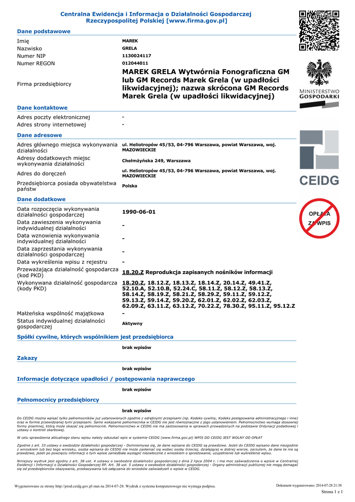 Centralna Ewidencja i Informacja o Działalności Gospodarczej Rzeczypospolitej Polskiej [www.firma.gov.pl] Dane podstawowe Imię Nazwisko Numer NIP Numer REGON Firma przedsiębiorcy MAREK GRELA 1130024117 012044011 MAREK GRELA Wytwórnia Fonograficzna GM lub GM Records Marek Grela (w upadłości likwidacyjnej); nazwa skrócona GM Records Marek Grela (w upadłości likwidacyjnej) Dane kontaktowe Adres poczty elektronicznej Adres strony internetowej Dane adresowe Adres głównego miejsca wykonywania ul. Heliotropów 45/53, 04796 Warszawa, powiat Warszawa, woj. MAZOWIECKIE działalności Adresy dodatkowych miejsc Chełmżyńska 249, Warszawa wykonywania działalności Adres do doręczeń ul. Heliotropów 45/53, 04796 Warszawa, powiat Warszawa, woj. MAZOWIECKIE Przedsiębiorca posiada obywatelstwa państw Polska Dane dodatkowe Data rozpoczęcia wykonywania działalności gospodarczej Data zawieszenia wykonywania indywidualnej działalności Data wznowienia wykonywania indywidualnej działalności Data zaprzestania wykonywania działalności gospodarczej Data wykreślenia wpisu z rejestru Przeważająca działalność gospodarcza (kod PKD) Wykonywana działalność gospodarcza (kody PKD) Małżeńska wspólność majątkowa Status indywidualnej działalności gospodarczej 19900601 18.20.Z Reprodukcja zapisanych nośników informacji 18.20.Z, 18.12.Z, 18.13.Z, 18.14.Z, 20.14.Z, 49.41.Z, 52.10.A, 52.10.B, 52.24.C, 58.11.Z, 58.12.Z, 58.13.Z, 58.14.Z, 58.19.Z, 58.21.Z, 58.29.Z, 59.11.Z, 59.12.Z, 59.13.Z, 59.14.Z, 59.20.Z, 62.01.Z, 62.02.Z, 62.03.Z, 62.09.Z, 63.11.Z, 63.12.Z, 70.22.Z, 78.30.Z, 95.11.Z, 95.12.Z Aktywny Spółki cywilne, których wspólnikiem jest przedsiębiorca brak wpisów Zakazy brak wpisów Informacje dotyczące upadłości / postępowania naprawczego brak wpisów Pełnomocnicy przedsiębiorcy brak wpisów Do CEIDG można wpisać tylko pełnomocników już ustanowionych zgodnie z odrębnymi przepisami (np. Kodeks cywilny, Kodeks postępowania administracyjnego i inne) oraz w formie przewidzianej tymi przepisami. Samo wskazanie pełnomocnika w CEIDG nie jest równoznaczne z jego ustanowieniem. Pełnomocnictwo wymaga stosownej formy pisemnej, którą może okazać się pełnomocnik. Pełnomocnictwo w CEIDG nie ma zastosowania w sprawach prowadzonych na podstawie Ordynacji podatkowej i ustawy o kontroli skarbowej. W celu sprawdzenia aktualnego stanu wpisu należy odszukać wpis w systemie CEIDG (www.firma.gov.pl) WPIS DO CEIDG JEST WOLNY OD OPŁAT Zgodnie z art. 33 ustawy o swobodzie działalności gospodarczej Domniemywa się, że dane wpisane do CEIDG są prawdziwe. Jeżeli do CEIDG wpisano dane niezgodnie z wnioskiem lub bez tego wniosku, osoba wpisana do CEIDG nie może zasłaniać się wobec osoby trzeciej, działającej w dobrej wierze, zarzutem, że dane te nie są prawdziwe, jeżeli po powzięciu informacji o tym wpisie zaniedbała wystąpić niezwłocznie z wnioskiem o sprostowanie, uzupełnienie lub wykreślenie wpisu. Niniejszy wydruk jest zgodny z art. 38 ust. 4 ustawy o swobodzie działalności gospodarczej z dnia 2 lipca 2004 r. i ma moc zaświadczenia o wpisie w Centralnej Ewidencji i Informacji o Działalności Gospodarczej RP. Art. 38 ust. 5 ustawy o swobodzie działalności gospodarczej Organy administracji publicznej nie mogą domagać się od przedsiębiorców okazywania, przekazywania lub załączania do wniosków zaświadczeń o wpisie w CEIDG. Wygenerowano ze strony http://prod.ceidg.gov.pl stan na 20140728. Wydruk z systemu komputerowego nie wymaga podpisu. Dokument wygenerowano: 20140728 21:38 Strona 1 z 1