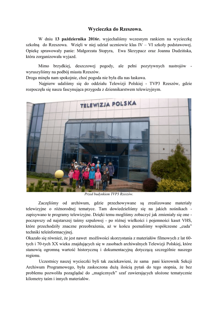 Wycieczka do Rzeszowa. W dniu 13 października 2016r. wyjechaliśmy wczesnym rankiem na wycieczkę szkolną do Rzeszowa. Wzięli w niej udział uczniowie klas IV – VI szkoły podstawowej. Opiekę sprawowały panie: Małgorzata Stopyra, Ewa Skrzypacz oraz Joanna Dudzińska, która zorganizowała wyjazd. Mimo brzydkiej, deszczowej pogody, ale pełni pozytywnych nastrojów wyruszyliśmy na podbój miasta Rzeszów. Droga minęła nam spokojnie, choć pogoda nie była dla nas łaskawa. Najpierw udaliśmy się do oddziału Telewizji Polskiej - TVP3 Rzeszów, gdzie rozpoczęła się nasza fascynująca przygoda z dziennikarstwem telewizyjnym. Przed budynkiem TVP3 Rzeszów. Zaczęliśmy od archiwum, gdzie przechowywane są zrealizowane materiały telewizyjne o różnorodnej tematyce. Tam dowiedzieliśmy się na jakich nośnikach zapisywano te programy telewizyjne. Dzięki temu mogliśmy zobaczyć jak zmieniały się one począwszy od najstarszej taśmy szpulowej - po różnej wielkości i pojemności kaset VHS, które przechodziły znaczne przeobrażenia, aż w końcu poznaliśmy współczesne „cuda” techniki teleinformacyjnej. Okazało się również, że jest nawet możliwości skorzystania z materiałów filmowych z lat 60tych i 70-tych XX wieku znajdujących się w zasobach archiwalnych Telewizji Polskiej, które stanowią ogromną wartość historyczną i dokumentacyjną dotyczącą szczególnie naszego regionu. Uczestnicy naszej wycieczki byli tak zaciekawieni, że sama pani kierownik Sekcji Archiwum Programowego, była zaskoczona dużą ilością pytań do tego stopnia, że bez problemu pozwoliła pozaglądać do „magicznych” szaf zawierających ułożone tematycznie kilometry taśm i innych materiałów. Wizyta w archiwum. Program wycieczki obejmował także wizytę w reżyserce, gdzie nagrywa się, montuje, kontroluje i emituje na antenie programy, które często nadawane są na żywo. Było to pomieszczenie pełne ekranów oraz konsoli, na której znajdowało się mnóstwo przycisków, pokręteł i innych guziczków. Niejedna osoba miała ochotę posprawdzać do czego służą, ale udało się nam niczego nie zepsuć, a przy okazji dowiedzieliśmy się wielu ciekawych informacji, o których do tej pory nie mieliśmy pojęcia. Odkrywanie tajemnic reżyserki telewizyjnej. Punktem kulminacyjnym naszej wyprawy było oglądanie studia telewizyjnego, z którego codziennie nadawane są programy. Zaskoczyła nas duża ilość kamer, kabli i świateł. W pomieszczeniu tym przygotowane są miejsca do prezentacji pogody, codziennych aktualności oraz do rozmów z gośćmi na żywo. Poznaliśmy zasady i tajniki funkcjonowania studia oraz wiele ciekawostek. Każdy zaglądał tam, gdzie tylko było można, niejedna osoba stanęła za kamerą lub przy stole prezentera wiadomości. Wszyscy przeszli też casting na prezenterów pogody i okazało się, że wszyscy sobie świetnie radzą. Kto wie – może wśród nas są przyszli dziennikarze… Na uspokojenie emocji – obejrzeliśmy film prezentujący działanie TVP3 Rzeszów i takim akcentem zakończyliśmy wizytę w tym niezwykłym świecie telewizji. Cała nasza grupa w studiu telewizyjnym. Kolejnym celem naszej wycieczki było obejrzenie musicalu pt.: „Akademia Pana Kleksa” w Teatrze „Maska”. Muzyczny spektakl oparty był na adaptacji znanej nam historii szkoły Ambrożego Kleksa, którą przedstawił w swojej książce Jan Brzechwa. Reżyserował Jerzy Jan Połoński, a w role bohaterów wcielili się prawdziwi aktorzy teatru. Gotowi na kolejne przeżycia… Wydawać by się mogło, że wszyscy znają opowieść o nieco ekscentrycznym panu Kleksie czy o jego nietypowych metodach nauczania, że niewiele może nas zaskoczyć, a tu już po wejściu na salę widowiskową – poczuliśmy atmosferę prawdziwego teatru. Ale najlepsze było dopiero przed nami… Sala teatralna była zapełniona do ostatniego miejsca. Pan Ambroży Kleks i część jego uczniówz akademii. Na scenie wśród zmieniających się dekoracji – pojawiali się aktorzy i na nowo odkrywali przed nami świat znanej baśni. Scena powrotu oka pana Kleksa z Księżyca:) Wśród widzów były chwile radości, śmiechu, ale i grozy (kiedy np. w całkowitej ciemności zaczęły świecić się oczy stada wilków). Cały musical był kolorowym i roztańczonym przedstawieniem, które wywarło ogromne wrażenie na widzach, czego dowodem były gromkie brawa i ponowne wywoływanie aktorów. Bardzo ciekawa była nauka w akademii… Po uczcie zmysłów - potrzeba było uczty dla podniebienia, aby nieco później, korzystając z poprawiającej się aury – pospacerować po rzeszowskiej Starówce. Mimo zmęczenia - humory dopisywały:) Droga powrotna do szkoły minęła nam szybko w świetnych nastrojach, a po drodze spotkała nas jeszcze niespodzianka, mianowicie w jednym miejscu ujrzeliśmy całe mnóstwo ogromnych, kolorowych balonów, które pojawiły się przy okazji corocznej imprezy lokalnej Balonowe Lato. Pełni wrażeń, choć już zmęczeni, dotarliśmy szczęśliwie do domów i tym samym potwierdziliśmy tezę, że 13-go też może być świetnie, bo ten wyjazd będziemy długo pamiętać…