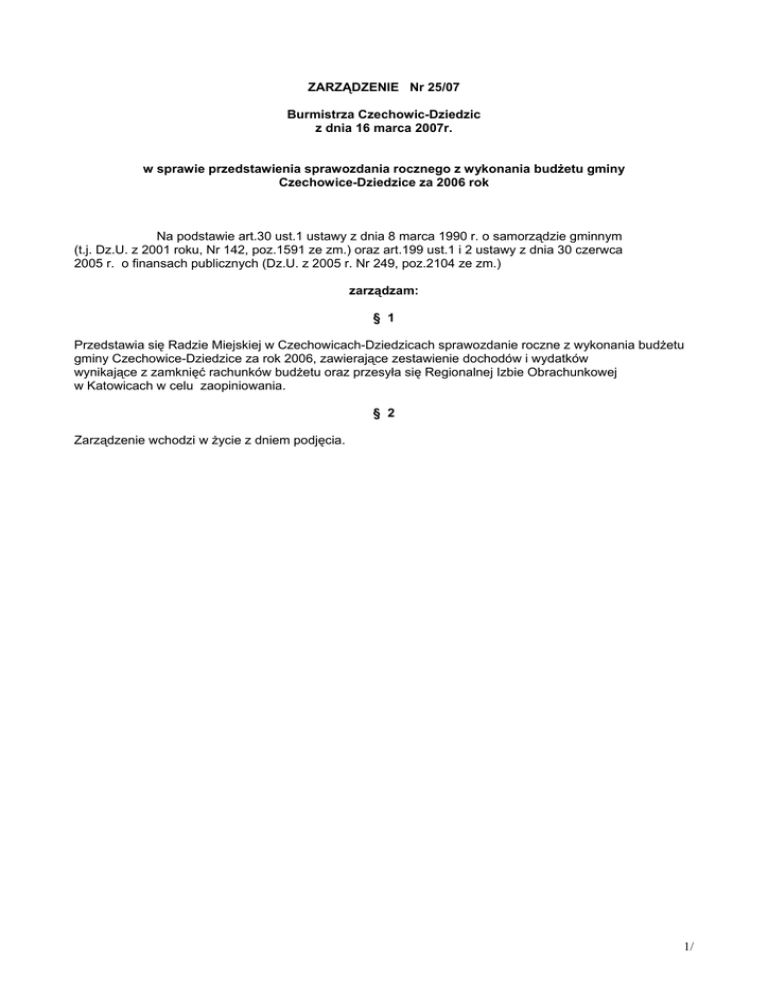 ZARZĄDZENIE Nr 25/07 Burmistrza Czechowic-Dziedzic z dnia 16 marca 2007r. w sprawie przedstawienia sprawozdania rocznego z wykonania budżetu gminy Czechowice-Dziedzice za 2006 rok Na podstawie art.30 ust.1 ustawy z dnia 8 marca 1990 r. o samorządzie gminnym (t.j. Dz.U. z 2001 roku, Nr 142, poz.1591 ze zm.) oraz art.199 ust.1 i 2 ustawy z dnia 30 czerwca 2005 r. o finansach publicznych (Dz.U. z 2005 r. Nr 249, poz.2104 ze zm.) zarządzam: § 1 Przedstawia się Radzie Miejskiej w Czechowicach-Dziedzicach sprawozdanie roczne z wykonania budżetu gminy Czechowice-Dziedzice za rok 2006, zawierające zestawienie dochodów i wydatków wynikające z zamknięć rachunków budżetu oraz przesyła się Regionalnej Izbie Obrachunkowej w Katowicach w celu zaopiniowania. § 2 Zarządzenie wchodzi w życie z dniem podjęcia. 1/ SPRAWOZDANIE Z WYKONANIA BUDŻETU GMINY CZECHOWICE-DZIEDZICE ZA 2006 ROK Czechowice-Dziedzice, marzec 2007 rok 2/ A. DANE OGÓLNE Budżet gminy Czechowice - Dziedzice na rok 2006 uchwalony został Uchwałą Nr XLII/458/06 Rady Miejskiej z dnia 13 marca 2006 roku i wynosił: - dochody budżetu gminy w tym: dochody własne udziały w podatkach stanowiących dochód budżetu Państwa subwencja ogólna w tym: - część oświatowa - część równoważąca dotacja na zadania zlecone dotacja na zadania własne dotacja na zadania bieżące realizowane na podstawie porozumień - spłata zobowiązań długoterminowych - wydatki budżetu gminy w tym: wydatki majątkowe rezerwy w tym: rezerwa ogólna rezerwa na usuwanie skutków klęsk żywiołowych rezerwa na bezpieczeństwo pozostałe wydatki w tym: - wynagrodzenia i pochodne od wynagrodzeń - dotacja dla zakładu budżetowego - dotacje dla gminnych instytucji kultury - wydatki na obsługę długu - wydatki jednostek pomocniczych - dotacje dla organizacji pozarządowych - pozostałe dotacje 78 648 287 zł 32 309 321 zł 22 145 433 zł 16 581 689 zł 16 005 919 zł 575 770 zł 6 837 578 zł 597 815 zł 176 451 zł 2 572 847 zł 92 819 656 zł 21 366 962 zł 160 500 zł 100 000 zł 10 000 zł 50 500 zł 71 292 194 zł 34 316 734 zł 1 448 000 zł 2 701 500 zł 500 000 zł 598 743 zł 470 500 zł 385 799 zł Deficyt pokryto nadwyżką budżetową z lat ubiegłych w wysokości 6 085 789 zł, wolnymi środkami w wysokości 3 076 757 zł, pożyczkami w kwocie 782 454 zł i kredytami w kwocie 4 226 369 zł. W 2006r. Rada Miejska podjęła 4 uchwały zmieniające budżet gminy. Burmistrz wydał 18 zarządzeń w sprawie zmian w budżecie oraz 4 zarządzenia w sprawie zmian w układzie wykonawczym. W 2006 roku w budżecie gminy nastąpiły zmiany zarówno po stronie dochodów jak i wydatków. Uchwałą Rady Miejskiej dokonano następujących zmian: I. Dochody budżetu gminy zwiększono o kwotę 922 065 zł z tytułu: - części oświatowej subwencji ogólnej dla jednostek samorządu terytorialnego - dotacji celowej na zadania realizowane na podstawie porozumień - dotacji celowej na zadania własne 185 589 zł 109 000 zł 46 036 zł 3/ - dotacji celowej na „zielone szkoły” z Wojewódzkiego Funduszu Ochrony Środowiska i Gospodarki Wodnej w Katowicach - dotacji celowej z Wojewódzkiego Funduszu Ochrony Środowiska i Gospodarki Wodnej na wapnowanie gleb - dotacji celowej z Wojewódzkiego Funduszu Ochrony Środowiska i Gospodarki Wodnej w Katowicach na dofinansowanie zadania majątkowego pn. „Termomodernizacja Szkoły Podstawowej Nr 7” - dotacji celowej z Powiatowego Funduszu Ochrony Środowiska i Gospodarki Wodnej na usuwanie wyrobów zawierających azbest - dotacji celowej z Powiatowego Funduszu Ochrony Środowiska i Gospodarki Wodnej na dofinansowanie zadania majątkowego pn. „Termomodernizacja Szkoły Podstawowej Nr 3 w Czechowicach-Dziedzicach” - dofinansowania zajęć ze środków Funduszu Zajęć Sportowo-Rekreacyjnych dla Uczniów - darowizny w ramach programu „Małe granty” – „Akademia szkoły z klasą” - dotacji z Fundacji Ochrony Zdrowia „Czechowice-Dziedzice dla Zdrowia” na dofinansowanie Gimnazjum Nr 1 - dotacji celowej otrzymanej od samorządu województwa dla Miejskiego Domu Kultury - wpłaty celowej na poprawę bezpieczeństwa miasta - wpływów ze zwrotów dotacji wykorzystanych niezgodnie z przeznaczeniem lub pobranych w nadmiernej wysokości - rekompensata utraconych dochodów z tytułu zwolnień określonych w ustawie o rehabilitacji zawodowej i społecznej oraz zatrudnienia osób niepełnosprawnych - wpłat celowych na wapnowanie gleb - dochodów z tyt. czynszów od lokali - dochodów z wysypiska - wpłat celowych na organizację Dni Czechowic-Dziedzic II. Dochody budżetu gminy zmniejszono o kwotę 5 000 zł z tytułu: - dochodów z cmentarza III. Wydatki budżetu gminy zwiększono o kwotę 2 296 756 zł na: - dotację do Starostwa Powiatowego w Bielsku-Białej na drogi powiatowe - dotację – zwrotów dotacji wykorzystanych niezgodnie z przeznaczeniem lub pobranych w nadmiernej wysokości - wydatki bieżące na „zielone szkoły” - wydatki bieżące na wapnowanie gleb - wydatki bieżące na usuwanie wyrobów zawierających azbest ba terenie gminy - wydatki bieżące na poprawę bezpieczeństwa - wydatki bieżące w szkołach podstawowych - wydatki bieżące w gimnazjach - wydatki bieżące na oczyszczanie miast i wsi - wydatki bieżące na działalność kulturalną - wydatki bieżące w gospodarce mieszkaniowej – AZK - wydatki bieżące związane z pracami geodezyjnymi i kartograficznymi - wydatki bieżące na organizację imprez kulturalnych w ramach obchodów Dni Czechowic-Dziedzic - wydatki bieżące na organizację imprez sportowych w ramach obchodów Dni Czechowic-Dziedzic 59 500 zł 137 592 zł 11 736 zł 15 000 zł 20 000 zł 23 000 zł 1 500 zł 10 000 zł 4 000 zł 10 000 zł 4 500 zł 108 864 zł 32 980 zł 125 000 zł 3 129 zł 14 639 zł 5 000 zł 1 300 000 zł 4 500 zł 59 500 zł 170 572 zł 15 000 zł 10 000 zł 11 457 zł 69 079 zł 79 000 zł 4 000 zł 123 129 zł 30 000 z