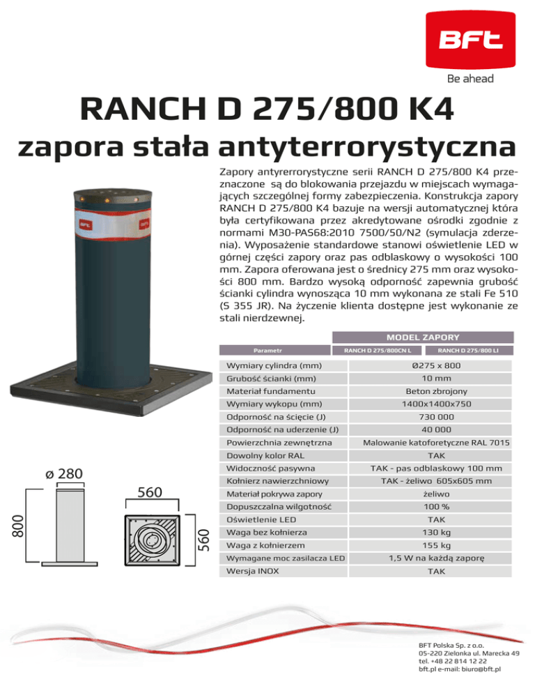 RANCH D 275/800 K4 zapora stała antyterrorystyczna Zapory antyrerrorystyczne serii RANCH D 275/800 K4 przeznaczone są do blokowania przejazdu w miejscach wymagających szczególnej formy zabezpieczenia. Konstrukcja zapory RANCH D 275/800 K4 bazuje na wersji automatycznej która była certyfikowana przez akredytowane ośrodki zgodnie z normami M30-PAS68:2010 7500/50/N2 (symulacja zderzenia). Wyposażenie standardowe stanowi oświetlenie LED w górnej części zapory oraz pas odblaskowy o wysokości 100 mm. Zapora oferowana jest o średnicy 275 mm oraz wysokości 800 mm. Bardzo wysoką odporność zapewnia grubość ścianki cylindra wynosząca 10 mm wykonana ze stali Fe 510 (S 355 JR). Na życzenie klienta dostępne jest wykonanie ze stali nierdzewnej. MODEL ZAPORY Parametr RANCH D 275/800CN L Wymiary cylindra (mm) 10 mm Materiał fundamentu Beton zbrojony Wymiary wykopu (mm) 1400x1400x750 Odporność na ścięcie (J) 730 000 Powierzchnia zewnętrzna Dowolny kolor RAL Widoczność pasywna Kołnierz nawierzchniowy 40 000 Malowanie katoforetyczne RAL 7015 TAK TAK - pas odblaskowy 100 mm TAK - żeliwo 605x605 mm Materiał pokrywa zapory żeliwo Dopuszczalna wilgotność 100 % Oświetlenie LED 560 800 560 Ø275 x 800 Grubość ścianki (mm) Odporność na uderzenie (J) ø 280 RANCH D 275/800 LI TAK Waga bez kołnierza 130 kg Waga z kołnierzem 155 kg Wymagane moc zasilacza LED Wersja INOX 1,5 W na każdą zaporę TAK BFT Polska Sp. z o.o. 05-220 Zielonka ul. Marecka 49 tel. +48 22 814 12 22 bft.pl e-mail: [email protected]