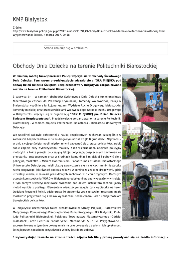 KMP Białystok Źródło: http://www.bialystok.policja.gov.pl/po2/aktualnosci/11891,Obchody-Dnia-Dziecka-na-terenie-Politechniki-Bialostockiej.html Wygenerowano: Sobota, 4 marca 2017, 09:58 Strona znajduje się w archiwum. Obchody Dnia Dziecka na terenie Politechniki Białostockiej W minioną sobotę funkcjonariusze Policji włączyli się w obchody Światowego Dnia Dziecka. Tym razem przedsięwzięcie wiązało się z "GRĄ MIEJSKĄ pod nazwą Dzień Dziecka Świętem Bezpieczeństwa”. Inicjatywa zorganizowana została na terenie Politechniki Białostockiej. 1 czerwca br. - w ramach obchodów Światowego Dnia Dziecka funkcjonariusze Nieetatowego Zespołu ds. Prewencji Kryminalnej Komendy Wojewódzkiej Policji w Białymstoku wspólnie z funkcjonariuszami Wydziału Ruchu Drogowego białostockiej komendy miejskiej oraz przedstawicielami Wojewódzkiego Ośrodka Ruchu Drogowego w Białymstoku włączyli się w organizację "GRY MIEJSKIEJ pn. Dzień Dziecka Świętem Bezpieczeństwa”. Przedsięwzięcie zorganizowano na terenie Politechniki Białostockiej - w ramach projektu Politechnika Białostocka – Białostocki Uniwersytet Dziecięcy. We wspólnej zabawie połączonej z nauką bezpiecznych zachowań szczególnie w kontekście bezpieczeństwa w ruchu drogowym udział wzięło 8 grup dzieci. Najmłodsi – w dniu swojego święta mogli między innymi zapoznać się z pracą policjantów, zrobić sobie zdjęcie przy wykorzystaniu makiety z ich wizerunkiem, obejrzeć policyjny motocykl, a także przejść pouczającą lekcję dotyczącą bezpiecznych zachowań na przystanku autobusowym oraz w środkach komunikacji miejskiej i pobawić się z policyjną maskotką – Misiem Dobromisiem. Ponadto mali studenci Białostockiego Uniwersytetu Dziecięcego mieli okazję sprawdzenia się na ulicach mini-miasteczka ruchu drogowego, jak również podczas zabawy w domino ze znakami drogowymi, gdzie utrwalały wiedzę w zakresie prawidłowych zachowań w ruchu drogowym. Dorosłym uczestnikom spotkania WORD w Białymstoku udostępnił pojazd wyposażony w troleje, a tym samym stworzył możliwość ćwiczenia pod okiem instruktora techniki jazdy metod wyjścia z poślizgu. Elementem wieńczącym zajęcia była wycieczka na teren Oddziału Prewencji Policji, gdzie grupa 70 studentów wraz ze swoimi rodzicami miała możliwość przyjrzenia się z bliska wyposażeniu technicznemu oraz umiejętnościom białostockich policjantów. W inicjatywie uczestniczyli także przedstawiciele: Straży Miejskiej, Ratownictwa Medycznego, Komunalnego Przedsiębiorstwa Komunikacyjnego (KPK Białystok), Klubu Judo Politechniki Białostockiej, Polskiego Towarzystwa Matematycznego (Oddział Białostocki) oraz Centrum Popularyzacji Matematyki SIGNUM. Przygotowane i zaprezentowane w tym dniu pokazy miały na celu pokazanie dzieciom i ich opiekunom, że najlepszym sposobem pozyskiwania wiedzy jest dobra zabawa. * wykorzystując zawarte na stronie treści, zdjęcia lub filmy proszę powoływać się na źródło informacji – www.podlaska.policja.gov.pl Ocena: 0/5 (0) Tweetnij
