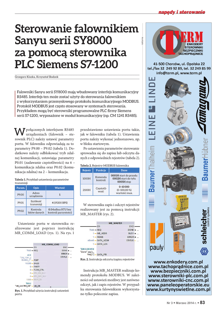 reklama Sterowanie falownikiem Sanyu serii SY8000 za pomocą sterownika PLC Siemens S7-1200 Grzegorz Kiszka, Krzysztof Bodzek Falowniki Sanyu serii SY8000 mają wbudowany interfejs komunikacyjny RS485. Interfejs ten może zostać użyty do sterowania falownikiem z wykorzystaniem przemysłowego protokołu komunikacyjnego MODBUS. Protokół MODBUS jest często stosowany w systemach sterowania. Przykładem mogą być sterowniki programowalne PLC firmy Siemens serii S7-1200, wyposażone w moduł komunikacyjny (np. CM 1241 RS485). W połączonych interfejsem RS485 urządzeniach (falownik – sterownik PLC) należy ustawić parametry portu. W falowniku odpowiadają za to parametry P9.00 – P9.02 (tabela 1). Dodatkowo należy odblokować tryb zdalnej komunikacji, ustawiając parametry P0.01 (zadawanie częstotliwości) na 6 – komunikacja zdalna oraz P0.02 (komunikacja zdalna) na 2 – komunikacja. Tabela 1. Przykład ustawienia parametrów transmisji Param. P9.00 P9.01 P9.02 Opis Adres urządzenia Szybkość transmisji Kontrola bitów danych Wartość 1 4 (19200 BPS) 0 (Modbus RTU bez kontroli parzystości) przedstawiono ustawienia portu takie, jak w falowniku (tabela 1). Ustawienia portu należy wykonać jednorazowo, np. w bloku startowym. Po ustawieniu parametrów sterowanie sprowadza się do zapisu lub odczytu danych z odpowiednich rejestrów (tabela 2). Tabela 2. Rejestry MODBUS falownika Rejestr Funkcja Dane 1000H Komenda kontroli 0001H start do przodu 0002H start do tyłu 0005H stop 2100H Częstotliwość 0–10 000 (0–100,00 %) wartości max. W sterowniku zapis i odczyt rejestrów realizowany jest za pomocą instrukcji MB_MASTER (rys. 2). Ustawienie portu w sterowniku realizowane jest poprzez instrukcję MB_COMM_LOAD (rys. 1). Na rys. 1 Rys. 2. Instrukcja odczytu/zapisu rejestrów Rys. 1. Przykład użycia instrukcji ustawień portu Instrukcja MB_MASTER realizuje komendy protokołu MODBUS. W zależności od ustawień możliwy jest zarówno odczyt, jak i zapis rejestrów. W przypadku sterowania falownikiem wykorzystano tylko polecenie zapisu. Nr 3 z Marzec 2014 r. z 83 Tabela 3. Ustawienie MB_MASTER Param. MB _ADDR Opis Adres urządzenia Wartość dury środowiska TIA PORTAL, można w łatwy sposób zrealizować sterowanie falownikiem. 1 MODE Odczyt /Zapis 0 – odczyt (03H) 1 – zapis (06H; 10H) DATA _ADDR Adres rejestru 44097 – komendy kontroli 48449 – komendy kontroli DATA _LEN Liczba rejestrów 1 DATA _PTR Dane Zgodnie z tab. 2 Opis parametrów funkcji MB_MASTER zamieszczono w tabeli 3, rzy czym parametr DATA_ADDR tworzy się wpi- 84 z Nr 3 z Marzec 2014 r. Rys. 3. Instrukcja odczytu/zapisu rejestrów sując 4 (komenda MODBUS – 03H; 06H lub 10H), a następnie adres rejestru +1 w systemie dziesiętnym (np. 1000H – tabela 2 odpowiada 44097). Dane dla komunikacji MODBUS (DATA_PTR) przechowywane są w globalnym bloku danych (np. DB3 „Dane” – rys. 3) i podaje się je jako wskaźnik (rys. 2). Wykorzystując interfejs komunikacyjny falownika z serii SY8000, sterownik PLC S7-1200 oraz wbudowane proce- ї inż. Grzegorz Kiszka; dr inż. Krzysztof Bodzek Artykuł jest fragmentem projektu inżynierskiego autorów pt. „Wykorzystanie sterownika PLC do sterowania falownikiem. Protokół MODBUS RTU” realizowanego na Wydziale Elektrycznym Politechniki Śląskiej.