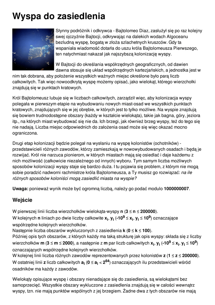 Wyspa do zasiedlenia Słynny podróżnik i odkrywca - Bajtolomeo Diaz, zasłużył się po raz kolejny swej ojczyźnie Bajtocji, odkrywając na dalekich wodach Algoceanu bezludną wyspę, bogatą w złoża szlachetnych kruszców. Gdy ta wspaniała wiadomość dotarła do uszu króla Bajtolomeusza Pierwszego, ten natychmiast nakazał jak najszybszą kolonizację wyspy. W Bajtocji do określania współrzędnych geograficznych, od dawien dawna stosuje się układ współrzędnych kartezjańskich, a jednostka jest w nim tak dobrana, aby położenie wszystkich ważnych miejsc określone było parą liczb całkowitych. Tak więc nowoodkrytą wyspę możemy opisać, jako wielokąt, którego wierzchołki znajdują się w punktach kratowych. Król Bajtolomeusz lubuje się w liczbach całkowitych, zarządził więc, aby kolonizacja wyspy polegała w pierwszym etapie na wybudowaniu nowych miast-osad we wszystkich punktach kratowych, znajdujących się w jej obrębie, w których jest to tylko możliwe. Na wyspie znajdują się bowiem trudnodostępne obszary (każdy w kształcie wielokąta), takie jak bagna, góry, jeziora itp., na których miast wybudować się nie da. Ich brzegi, jak również brzeg wyspy, też do tego się nie nadają. Liczba miejsc odpowiednich do założenia osad może się więc okazać mocno ograniczona. Drugi etap kolonizacji będzie polegał na wysłaniu na wyspę kolonistów (ochotników) przedstawicieli różnych zawodów, którzy zamieszkają w nowowybudowanych osadach i będą je rozwijać. Król nie narzuca pionierom, w których miastach mają się osiedlać i daje każdemu z nich możliwość (całkowicie niezależnego od innych) wyboru. Tym samym liczba możliwych sposobów kolonizacji wyspy staje się bardzo duża. I tu pojawia się problem, z którym nie mogą sobie poradzić nadworni rachmistrze króla Bajtolomeusza, a Ty musisz go rozwiązać: na ile różnych sposobów koloniści mogą zasiedlić miasta na wyspie? Uwaga: ponieważ wynik może być ogromną liczbą, należy go podać modulo 1000000007. Wejście W pierwszej linii liczba wierzchołków wielokąta-wyspy n (3 ≤ n ≤ 200000). W kolejnych n liniach po dwie liczby całkowite xi, yi (-109 ≤ xi, yi ≤ 109) oznaczające współrzędne kolejnych wierzchołków. Następnie liczba obszarów wykluczonych z zasiedlenia k (0 ≤ k ≤ 100). Później opis tych obszarów, z których każdy ma taką strukturę jak opis wyspy: składa się z liczby wierzchołków m (3 ≤ m ≤ 2000), a następnie z m par liczb całkowitych xi, yi (-109 ≤ xi, yi ≤ 109) oznaczających współrzędne kolejnych wierzchołków. W kolejnej linii liczba różnych zawodów reprezentowanych przez kolonistów z (1 ≤ z ≤ 200000). W ostatniej linii z liczb całkowitych ai (0 ≤ ai < 264) oznaczających ilu przedstawicieli wśród osadników ma każdy z zawodów. Wielokąty opisujące wyspę i obszary nienadające się do zasiedlenia, są wielokątami bez samoprzecięć. Wszystkie obszary wykluczone z zasiedlenia znajdują się w całości wewnątrz wyspy, tzn. nie mają punktów wspólnych z jej brzegiem. Żadne dwa z tych obszarów nie mają punktów wspólnych. Wyjście Jedna liczba całkowita oznaczająca na ile sposobów (modulo 1000000007) koloniści mogą zasiedlić wyspę. Uwaga 1: Jeżeli na wyspie nie ma miejsc nadających się do założenia miast, to należy przyjąć, że nie ma sposobu na zasiedlenie wyspy. Uwaga 2: Jeżeli na wyspie są miejsca na założenie osad, ale nie ma kolonistów chętnych do jej zasiedlenia, to należy przyjąć, że jest jeden sposób kolonizacji - bez udziału osadników. Przykład Wejście: 5 11 51 63 95 29 2 4 24 28 57 75 4 52 54 44 22 3 523 Wyjście: 282475249 Rysunek do przykładu: Na tej wyspie jest tylko siedem miejsc, w których założone zostaną osady.