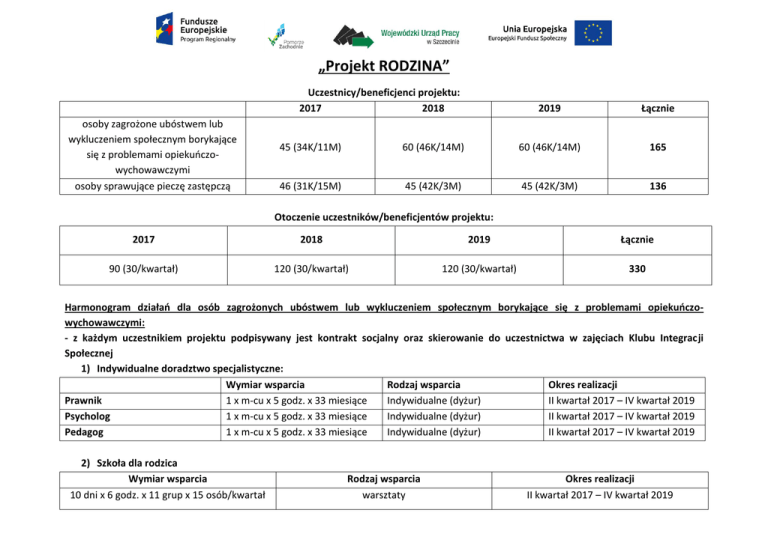 „Projekt RODZINA” Uczestnicy/beneficjenci projektu: 2017 2018 osoby zagrożone ubóstwem lub wykluczeniem społecznym borykające się z problemami opiekuńczowychowawczymi osoby sprawujące pieczę zastępczą 2019 Łącznie 45 (34K/11M) 60 (46K/14M) 60 (46K/14M) 165 46 (31K/15M) 45 (42K/3M) 45 (42K/3M) 136 Otoczenie uczestników/beneficjentów projektu: 2017 2018 2019 Łącznie 90 (30/kwartał) 120 (30/kwartał) 120 (30/kwartał) 330 Harmonogram działań dla osób zagrożonych ubóstwem lub wykluczeniem społecznym borykające się z problemami opiekuńczowychowawczymi: - z każdym uczestnikiem projektu podpisywany jest kontrakt socjalny oraz skierowanie do uczestnictwa w zajęciach Klubu Integracji Społecznej 1) Indywidualne doradztwo specjalistyczne: Wymiar wsparcia Rodzaj wsparcia Okres realizacji Prawnik 1 x m-cu x 5 godz. x 33 miesiące Indywidualne (dyżur) II kwartał 2017 – IV kwartał 2019 Psycholog 1 x m-cu x 5 godz. x 33 miesiące Indywidualne (dyżur) II kwartał 2017 – IV kwartał 2019 Pedagog 1 x m-cu x 5 godz. x 33 miesiące Indywidualne (dyżur) II kwartał 2017 – IV kwartał 2019 2) Szkoła dla rodzica Wymiar wsparcia 10 dni x 6 godz. x 11 grup x 15 osób/kwartał Rodzaj wsparcia warsztaty Okres realizacji II kwartał 2017 – IV kwartał 2019 3) Warsztaty gospodarowania budżetem domowym Wymiar wsparcia 3 dni x 6 godz. x 11 grup x 15 osób/kwartał Rodzaj wsparcia warsztaty Okres realizacji II kwartał 2017 – IV kwartał 2019 4) Warsztaty profilaktyka zdrowego trybu życia Wymiar wsparcia 3 dni x 6 godz. x 11 grup x 15 osób/kwartał Rodzaj wsparcia warsztaty Okres realizacji II kwartał 2017 – IV kwartał 2019 5) Alternatywne formy spędzania czasu wolnego Teatr Kino Kręgle Wyjazd do wioski tematycznej/edukacyjnego parku rozrywki Wymiar wsparcia 1 wyjście x 11 grup x 45 osób (15 uczestników + 30 osób z otoczenia) 1 wyjście x 11 grup x 45 osób (15 uczestników + 30 osób z otoczenia) 1 wyjście x 11 grup x 45 osób (15 uczestników + 30 osób z otoczenia) 1 wyjazd x 11 grup x 45 osób (15 uczestników + 30 osób z otoczenia) Wsparcie towarzyszące dla uczestników projektu: - ubezpieczenie NNW, - bilety MZK na dojazdy na zajęcia, - zapewnienie opieki na czas zajęć nad dziećmi do 7 roku życia bądź osobą zależną, - catering na czas trwania zajęć (6 godzin i więcej). Okres uczestnictwa w projekcie: I kwartał Okres realizacji II kwartał 2017 – IV kwartał 2019 II kwartał 2017 – IV kwartał 2019 II kwartał 2017 – IV kwartał 2019 II kwartał 2017 – IV kwartał 2019 Harmonogram działań dla osób sprawujących pieczę zastępczą : - z każdym uczestnikiem projektu podpisywana jest deklaracja uczestnictwa w projekcie 1) Indywidualne doradztwo specjalistyczne: Wymiar wsparcia Prawnik 1 x m-cu x 3 godz. x 33 miesiące Psycholog 1 x m-cu x 3 godz. x 33 miesiące Pedagog 1 x m-cu x 3 godz. x 33 miesiące Rodzaj wsparcia Indywidualne (dyżur) Indywidualne (dyżur) Indywidualne (dyżur) 2) Warsztaty kompetencji rodzicielskich dla osób sprawujących rodzinną pieczę zastępczą Tematyka Wymiar wsparcia Rodzaj wsparcia „Mały terrorysta” 2 dni x 2 godz. x 3 podgrupy warsztaty Przyczyny agresji i autoagresji 1 dzień x 2 godz. x 3 podgrupy warsztaty Wykorzystywanie seksualne 2 dni x 2 godz. x 3 podgrupy warsztaty dzieci FAS prawda czy mit 2 dni x 2 godz. x 3 podgrupy warsztaty Zaburzenia zachowania/emocji 2 dni x 2 godz. x 3 podgrupy warsztaty Zaburzenia zachowania/emocji 2 dni x 2 godz. x 3 podgrupy warsztaty Rozpoznawanie zaburzeń psychicznych we wczesnym 2 dni x 4 godz. x 3 podgrupy warsztaty etapie rozwoju Seksualność dzieci 2 dni x 2 godz. x 3 podgrupy warsztaty niepełnosprawnych Wsparcie towarzyszące dla uczestników projektu: - ubezpieczenie NNW, - bilety MZK na dojazdy na zajęcia, - catering na czas trwania zajęć (4 godziny i więcej). Okres uczestnictwa w projekcie: marzec – grudzień (10 miesięcy) Okres realizacji II kwartał 2017 – IV kwartał 2019 II kwartał 2017 – IV kwartał 2019 II kwartał 2017 – IV kwartał 2019 Okres realizacji III 2017, III 2018, III 2019 IV 2017, IV 2018, IV 2019 V 2017, V 2018, V 2019 VI 2017, VI 2018, VI 2019 IX 2017, IX 2018, IX 2019 X 2017, X 2018, X 2019 XI 2017, XI 2018, XI 2019 XII 2017, XII 2018, XII 2019