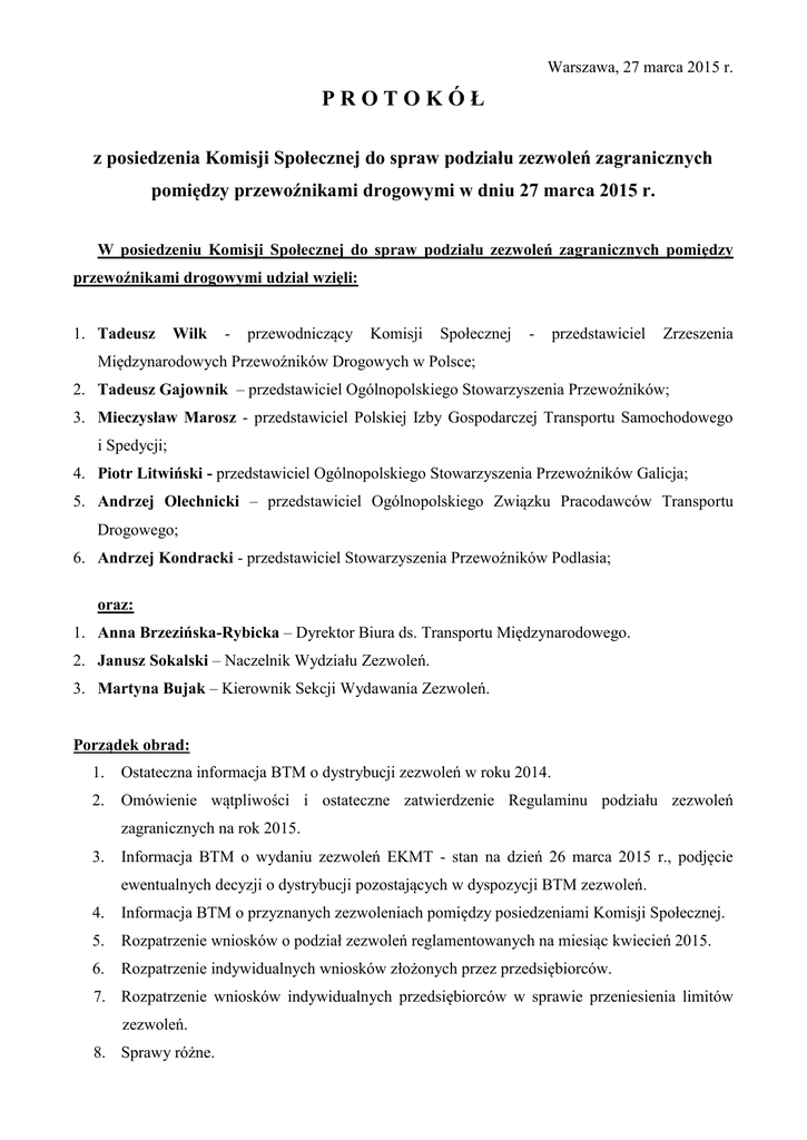 Warszawa, 27 marca 2015 r. PROTOKÓŁ z posiedzenia Komisji Społecznej do spraw podziału zezwoleń zagranicznych pomiędzy przewoźnikami drogowymi w dniu 27 marca 2015 r. W posiedzeniu Komisji Społecznej do spraw podziału zezwoleń zagranicznych pomiędzy przewoźnikami drogowymi udział wzięli: 1. Tadeusz Wilk - przewodniczący Komisji Społecznej - przedstawiciel Zrzeszenia Międzynarodowych Przewoźników Drogowych w Polsce; 2. Tadeusz Gajownik – przedstawiciel Ogólnopolskiego Stowarzyszenia Przewoźników; 3. Mieczysław Marosz - przedstawiciel Polskiej Izby Gospodarczej Transportu Samochodowego i Spedycji; 4. Piotr Litwiński - przedstawiciel Ogólnopolskiego Stowarzyszenia Przewoźników Galicja; 5. Andrzej Olechnicki – przedstawiciel Ogólnopolskiego Związku Pracodawców Transportu Drogowego; 6. Andrzej Kondracki - przedstawiciel Stowarzyszenia Przewoźników Podlasia; oraz: 1. Anna Brzezińska-Rybicka – Dyrektor Biura ds. Transportu Międzynarodowego. 2. Janusz Sokalski – Naczelnik Wydziału Zezwoleń. 3. Martyna Bujak – Kierownik Sekcji Wydawania Zezwoleń. Porządek obrad: 1. Ostateczna informacja BTM o dystrybucji zezwoleń w roku 2014. 2. Omówienie wątpliwości i ostateczne zatwierdzenie Regulaminu podziału zezwoleń zagranicznych na rok 2015. 3. Informacja BTM o wydaniu zezwoleń EKMT - stan na dzień 26 marca 2015 r., podjęcie ewentualnych decyzji o dystrybucji pozostających w dyspozycji BTM zezwoleń. 4. Informacja BTM o przyznanych zezwoleniach pomiędzy posiedzeniami Komisji Społecznej. 5. Rozpatrzenie wniosków o podział zezwoleń reglamentowanych na miesiąc kwiecień 2015. 6. Rozpatrzenie indywidualnych wniosków złożonych przez przedsiębiorców. 7. Rozpatrzenie wniosków indywidualnych przedsiębiorców w sprawie przeniesienia limitów zezwoleń. 8. Sprawy różne. Ad.1 Komisja zapoznała się z informacją o dystrybucji zezwoleń zagranicznych z kontyngentu 2014. Ad.2 Komisja omówiła i zatwierdziła Regulamin podziału zezwoleń na rok 2015. Ad.3 Rodzaj zezwolenia Liczba zezwoleń 1. Grupa IV EURO 5 – bez A, GR, RUS 1 2. Grupa V EURO 3 – bez A, GR, I i RUS 4 3. Grupa VI EURO 5 - bez A, GR, I, RUS i H 1102 4. Grupa VI EURO 6 - bez A, GR, I, RUS i H 94 Ad.4 Przedstawiono Komisji Społecznej wykaz zezwoleń, które zostały przyznane dla przedsiębiorców i Stowarzyszeń pomiędzy posiedzeniami. Komisja Społeczna zaakceptowała przedstawiony wykaz nie wnosząc zastrzeżeń. Ad.5 Podstawą przyznania zezwoleń w limicie dodatkowym na miesiąc kwiecień jest: - poprawne wykorzystanie limitu zezwoleń przyznanych na rok 2015 proporcjonalnie do upływu roku, tj. 3/12 limitu, zwróconych do dnia 20 marca br.: Armenia ogólne Zezwolenia przydziela się po 1 szt. dla przedsiębiorcy. Azerbejdżan kraje 3 Zezwolenia przydziela się po 1 szt. dla przedsiębiorcy. Zezwoleń nie otrzymują ci przedsiębiorcy, którzy pobrali i nie wykorzystali lub wykorzystali nieprawidłowo zezwolenia tego rodzaju z kontyngentu 2014. Przedsiębiorca pobierał zezwolenia w roku 2014. Azerbejdżan ogólne Zezwolenia przydziela się po 4 szt. dla przedsiębiorcy ale nie więcej niż wnioskował. Białoruś kraje 3 Zezwolenia przydziela się po 1 szt. dla przedsiębiorcy, liczba przydzielonych zezwoleń nie może być wyższa od liczby wypisów (uprawnionych pojazdów). Bośnia i Hercegowina kraje 3 Zezwolenia przydziela się zgodnie z wnioskiem. Bułgaria kraje 3 Zezwolenia przydziela się po 1 szt. dla przedsiębiorcy. Chorwacja kraje 3 Zezwolenia przydziela się zgodnie z wnioskiem. Czarnogóra kraje 3 Zezwolenia przydziela się zgodnie z wnioskiem. Finlandia kraje 3 Zezwolenia przydziela się zgodnie z wnioskiem. Gruzja ogólne Zezwolenia przydziela się po 1 szt. dla przedsiębiorcy, liczba przydzielonych zezwoleń nie może być wyższa od liczby wypisów (uprawnionych pojazdów). Kazachstan ogólne Zezwolenia przydziela się po 1 szt. dla przedsiębiorcy. Zezwoleń nie otrzymują ci przedsiębiorcy, którzy pobrali i nie wykorzystali lub wykorzystali nieprawidłowo zezwolenia tego rodzaju z kontyngentu 2014. Przedsiębiorca pobierał zezwolenia w roku 2014. Kazachstan kraje 3 Zezwolenia przydziela się po 1 szt. dla przedsiębiorcy. Zezwoleń nie otrzymują ci przedsiębiorcy, którzy pobrali i nie wykorzystali lub wykorzystali nieprawidłowo zezwolenia tego rodzaju z kontyngentu 2014. Przedsiębiorca pobierał zezwolenia w roku 2014. Kirgistan kraje 3 Zezwolenia przydziela się po 1 szt. dla przedsiębiorcy. Litwa kraje 3 Zezwolenia przydziela się po 1 szt. dla przedsiębiorcy. Norwegia kraje 3 Zezwolenia przydziela się zgodnie z wnioskiem. Rosja kraje 3 Zezwolenia przydzielone zostały według poniższych kryteriów: 1 sztuka na pierwszych 10 pojazdów uprawnionych, jedna sztuka na każdy kolejny 5 pojazd uprawniony, jednakże nie więcej niż 10 szt. na przedsiębiorcę, przedsiębiorca nie może otrzymać zezwoleń w liczbie większej od wnioskowanej. Zezwolenia w ramach limitów dodatkowych otrzymają wyłącznie przedsiębiorcy, którzy posiadają licencję na wykonywanie mtd rzeczy powyżej jednego roku (licząc od daty odebrania licencji). Rumunia kraje 3 Zezwolenia przydziela się zgodnie z wnioskiem. Serbia kraje 3 Zezwolenia przydziela się po 1 szt. dla przedsiębiorcy, który pobrał co najmniej 1 zezwolenie danego rodzaju z kontyngentu 2014. Zezwoleń nie otrzymują ci przedsiębiorcy, którzy pobrali i nie wykorzystali lub wykorzystali nieprawidłowo zezwolenia tego rodzaju z kontyngentu 2014. Szwecja kraje 3 EURO 0 Zezwolenia przydziela się zgodnie z wnioskiem. Tadżykistan ogólne Zezwolenia przydziela się po 1 szt. dla przedsiębiorcy. Tadżykistan kraje 3 Zezwolenia przydziela się po 1 szt. dla przedsiębiorcy. Turcja wjazd na pusto lub kraje 3 Zezwolenia przydziela się po 2 szt. dla przedsiębiorcy ale nie więcej niż wnioskował. Uzbekistan ogólne Zezwolenia przydziela się po 1 szt. dla przedsiębiorcy, który pobrał co najmnie