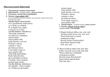 Plan uroczystości ślubowania 1. Wprowadzenie sztandaru, Hymn Polski 2. Rafał Iskierski – recytacja wiersza „Ojczyzna Wolna!” 3. Prezentacja z okazji Święta Niepodległości 4. Piosenka „Nasze polskie ABC” [jeżeli pomyliłam kolejność solistek, one na pewno wiedzą, którą część piosenki śpiewają] (Matylda Stępień, Marta Kondrat): Już w przedszkolu wiedzą dzieci, co to Wisła co to Bałtyk. Że na Śląsku leży węgiel, a zaś góry to są Tatry. (Caroline Robinson, Julia Barszcz): Taki polski elementarz raz zobaczysz i pamiętasz (wszyscy razem): Nasze polskie ABC, każde dziecko o tym wie. Wchodzi w głowę, wchodzi w serce, jak literka po literce. Coraz lepiej czytasz je, nasze polskie ABC. (Ania Ciciła, Zuzia Sichau) Kiedy będę taki duży, jak na przykład są rodzice. Z książek z kina i podróży, poznam kraju okolice. (Caroline Robinson, Julia Barszcz): Jak zakładka - Wisły wstążka, no a Polska jest jak książka. (wszyscy razem): Nasze polskie ABC, każde dziecko o tym wie. Wchodzi w głowę, wchodzi w serce, jak literka po literce. Coraz lepiej czytasz je, nasze polskie ABC. 5. Matylda Stępień – recytacja wiersza „Barwy ojczyste” 6. Piosenka „Biegnie kreda po tablicy” (wszyscy razem, z choreografią) I. Biegnie kreda po tablicy szur, szur, szur! Zawijasy kreda ćwiczy szur, szur, szur! Wtem literki hop! I zwinnie uciekają poza linię! Równaj szereg! Prostuj grzbiet! Rząd literek naprzód, bieg! Szur, szur, szur……… II. Skacze kreda po tablicy hop, hop, hop! Kółka i krzyżyki ćwiczy hop, hop, hop! Wtem cyferki hyc! Ukradkiem uciekają poza kratkę! Równaj szereg! Równaj krok! Rząd cyferek naprzód skok! Hop, hop, hop,…. 7. Recytacja wiersza: „Czy wiecie jak zachować się w szkole?” Alan: Grzeczność na co dzień ? Nikola: Bardzo ważna sprawa! Zuzia: O tym również wspomnieć tu wypada. Wiola: Gdy powiesz dziękuję Marta: to słowo nic cię nie kosztuje! Ania: A przepraszam i proszę Rafał: -chlubę ci uczniu przynoszą! Marika: Zawsze niech uśmiech gości na twej twarzy. Matylda: Wtedy będzie cię przyjaźnią Caroline: każdy uczeń darzył! Kuba: Nie hałasuj na przerwie! Michał: Każdy ci to powie, Oliwia: że hałas niszczy zdrowie! Julia: Nigdy nie przezywaj innych kolego! Kacper: Bo to czyni wiele złego. Natalia: Nigdy nie skarż uczniu mały, Oskar: bo to nie przynosi chwały. Alicja: Obrażanie to bardzo brzydka wada. Wiktoria: Tak zachowywać się uczniom Adam: nie wypada! 8. Piosenka „Hymn ucznia” (wszyscy razem) Wieki historii zaklęte w wielkich księgach, Przepiękne myśli zaczarowane w wiersze. Lasy, pola i góry przecięte rzek wstęgą, Gdy myślę: POLSKA – to w głowie świta pierwsze. Odwagę orła w sercu dziś niosę; Polska Szkoło, to ja, twój uczeń! Pokaż jak kochać mój ojczysty kraj, Daj mi do świata bram klucze. 9. Przemówienie dyrekcji i oficjalne pasowanie na ucznia – dzieci powtarzają za dyrekcją słowa ślubowania. Ślubowanie- tekst Ślubuję uroczyście! Będę świecił przykładem dobrego kolegi i wzorowego ucznia. Będę strzegł honoru i dobrego imienia Szkoły. Będę szanował swoich nauczycieli, przełożonych i rodziców. Będę kochał swoją Ojczyznę, szanował język i symbole narodowe.