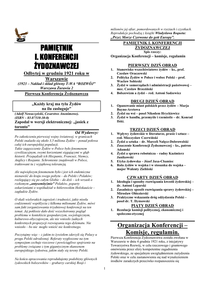 milionów jej ofiar, pomordowanych w rzeziach i czystkach. Reprodukcje pochodzą z książki Władysława Boqueta: „Przez Morze Czerwone do gett Europy”. PAMIĘTNIK I. KONFERENCJI ŻYDOZNAWCZEJ PAMIĘTNIK I. KONFERENCJI ŻYDOZNAWCZEJ Spis rzeczy: Organizacja Konferencji – komisje, regulamin PIERWSZY DZIŃ OBRAD 1. Odbytej w grudniu 1921 roku w Warszawie 2. (1923 – Nakład i skład główny T-WA “ROZWÓJ” Warszawa Żurawia 2 3. Pierwsza Konferencja Żydoznawcza 4. „Każdy kraj ma tylu Żydów na ilu zasługuje” 1. Stanowisko wszechświatowe żydów – ks., prof. Czesław Oraczewski Polityka Żydów w Polsce i wobec Polski – prof. Wacław Sobieski Żydzi w samorządach i administracji państwowej – mec. Czesław Brzeziński Bolszewizm a żydzi – red. Antoni Sadzewicz DRUGI DZIEŃ OBRAD (Adolf Nowaczyński, Cesarstwo Anonimowe). (ISBN – 83-87510-30-0) 2. 3. Zapodał w wersji elektronicznej: „jasiek z toronto” Od Wydawcy: 1. Opanowanie miast polskich przez żydów – Marja Buyno-Aretowa Żydzi na wsi – poseł Nikodem Hryckiewicz Żydzi w handlu, przemyśle i rzemiośle – dr. Konrad Ilski. TRZECI DZIEŃ OBRAD Po zakończeniu pierwszej wojny światowej, w granicach Polski znalazło się około 3,5 miliona Żydów – ponad połowa całej ich europejskiej populacji. Takie zagęszczenie Żydów w Polsce było fenomenem cywilizacyjnym, swymi korzeniami sięgającymi w głąb historii. Przepędzali ich Hiszpanie, Francuzi, Niemcy, Anglicy i Rosjanie. Schronienie znajdowali w Polsce, traktowani tu z wyjątkową tolerancją. 2. 3. 4. 5. 6. Ale największym fenomenem było i jest ich endemiczna nienawiść do kraju swego pobytu – do Polski i Polaków; rozlegający się po całym Globie – do dziś – ich wrzask o rzekomym „antysemityźmie” Polaków, poparty oskarżeniami o współudział w hitlerowskim Holokauście – zagładzie Żydów. Wpływy żydowskie w literaturze, prasie i sztuce – red. Mieczysław Czerwiński Żydzi a sztuka – dr. Marceli Nałęcz-Dobrowolski Znaczenie Konferencji Żydoznawczej – ks., patron Adamski Żydzi a sprawa robotnicza – radny Kazimierz Janikowski Etyka żydowska – Józef Jaxa-Chamiec Rola żydów w wojsku i w stosunku do wojska – major Walenty Zieliński CZWARTY DZIEŃ OBRAD 1. 2. 3. O skali wielorakich zagrożeń i trudności, jakie niosła codzienność współżycia z kilkoma milionami Żydów, mówi sam fakt zorganizowania trzydniowej konferencji na ten temat. Jej pokłosie dało dość wszechstronny pogląd problemu w kontekście gospodarczym, socjologicznym, kulturowo-obyczajowym, ale nie wniosło żadnych konkretnych propozycji rozwiązania tego dylematu. Nie wniosło – bo nie mogło wnieść nic konkretnego. Ideologia i sposoby rozwiązania kwestii żydowskiej – dr. Antoni Leparski Zasadniczy sposób rozwiązania sprawy żydowskiej – Mirosław Obiezierski Praktyczne wskazania dróg odżydzenia Polski – poseł dr. T. Dymowski PIĄTY DZIEŃ OBRAD 1. Rezolucje komisji politycznej, ekonomicznej i społeczno-etycznej Organizacja Konferencji – Komisje, regulamin. Poczytajmy więc – z jakim to żywiołem zderzyli się Polacy u progu Polski odrodzonej. Referaty wygłoszone na tym sympozjum cechuje rzeczowe i powściągliwe spojrzenie na problemy związane z tym gigantycznym skansenem europejskiego żydostwa, jakim stały się tereny Polski. Pierwsza Konferencja Żydoznawstwa została zwołana w Warszawie w dniu 4 grudnia 1921 roku, z inicjatywy Towarzystwa Rozwój, w celu rzeczowego i gruntowego omówienia przez sfery kompetentne zagadnienia żydowskiego, ze specjalnym uwzględnieniem zażydzenia Polski oraz w celu zastanowienia się nad wynalezieniem środków zaradczych przeciwko rozpanoszeniu się Na końcu opracowania reprodukujemy podobizny głównych żydowskich bolszewików – grabarzy carskiej Rosji i 1 pasożytnictwa i gangreny judaizmu na całym świecie, a w szczególności na ziemiach polskich. Sekcja Przyjęć Kazimierz Borkowski, Władysław Dobrzyński, sędzia Kazimierz Kosiński, Zofja Lelewelowa (przewodnicząca), Antoni Makowski, Roman Nowakowski, Janusz Rabski (sekretarz), Włodzimierz Rudnicki, Jadwiga Rupiewiczowa, Jadwiga Słubicka, Marja Wiercińska. Dla zrealizowania swej inicjatywy, Zarząd Główny T-wa „Rozwój” powołał Komitet Wykonawczy o osobach pp: Marji Buyno-Arctowej, sędziego Marka Borkowskiego, Aleksandra Dobrowolskiego, dr. Tadeusza Dymowskiego, dr. Konrada Ilskiego, Aleksandra Karszo-Siedlewskiego, dr. K. Kosteckiego, dr. Antoniego Szymankiewicza. Komitet Wykonawczy przystąpił natychmiast do wytworzenia potrzebnych komisji i sekcji, a mianowicie: Komisji Propagandy i Prasy z sekcjami: Stowarzyszeniową i Prasową, Komisji Organizacyjno-Gospodarczej z sekcjami: Zaproszeniową, Kwaterunkową i Przyjęć, Komisji Referatów i Wniosków, Komisji Finansowej, wreszcie Komisji Rewizyjno-Sprawozdawczej, przy czym przewodnictwo i odpowiedzialność za każdą sekcję powierzono poszczególnym członkom Komitetu Wykonawczego, którzy do współpracy poprowadzili cały szereg działaczy społecznych, przede wszystkim spośród ruchliwszych i większych Związków i Stowarzyszeń społecznych. Skład osobowy poszczególnych Komisji i Sekcji przedstawiał się jak następuje: Sekcja Kwaterunkowa Aleksander Barczewski (przewodniczący), Karol Bartosiak, Władysław Błotnicki, Teofil Bukowski, Wacław Ciborski, Roman Chryzewicz, Jadwiga Dziewulska, Stefan Falęcki, Piotr Florczyk, Stanisław Fornalski, Walerja Garlińska (sekretarz), Bolesław Gramkowski, Stanisław Janiszewski, Stefan Jezierski, Leon Klimowicz, Witold Korzeniowski, Władysław Kułpiński, Jan Monczarski, Zenon Modzejewski, Antoni Opęchowski, Grzegorz Osipuk, Zygmunt Regulski, Witold Rządkowski, Michał Rutkowski, Ignacy Ring, Mateusz Sawoniak, Wincenty Zalewski, Halina Zawadzka, Stanisław Zuba. Skład Komisji referatów i wniosków Marja Buyno-Arctowa (przewodnicząca), dr. Tadeusz Dymowski, dr. K