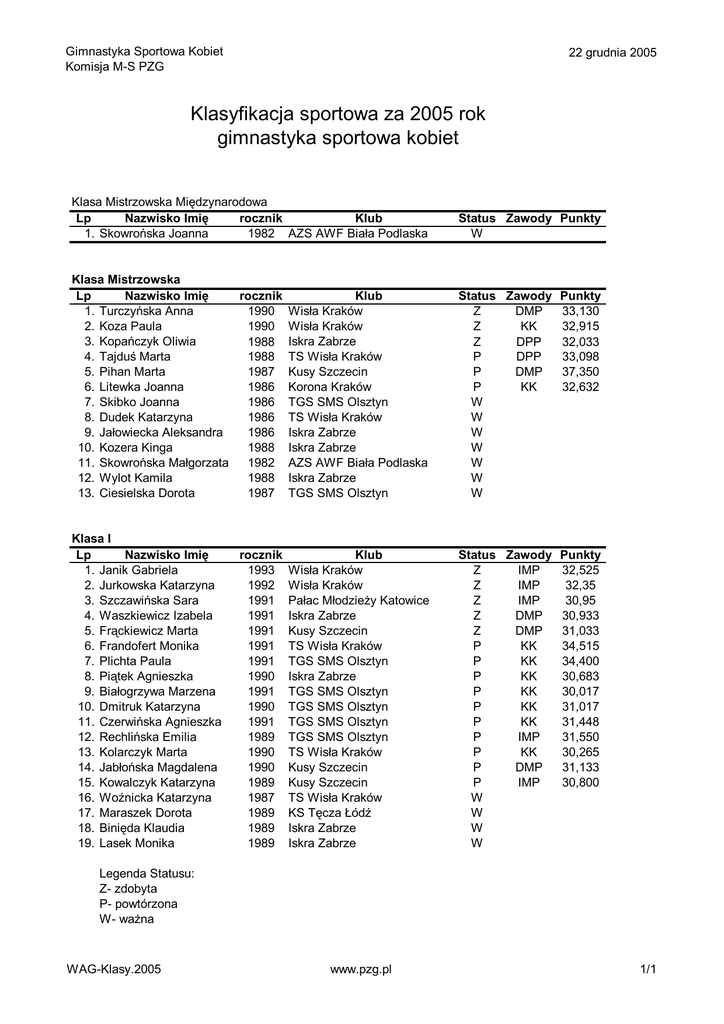 Gimnastyka Sportowa Kobiet Komisja M-S PZG 22 grudnia 2005 Klasyfikacja sportowa za 2005 rok gimnastyka sportowa kobiet Klasa Mistrzowska Międzynarodowa Lp Nazwisko Imię rocznik Klub 1. Skowrońska Joanna 1982 AZS AWF Biała Podlaska Status Zawody Punkty W Klasa Mistrzowska Lp Nazwisko Imię rocznik Klub 1. Turczyńska Anna 1990 Wisła Kraków 2. Koza Paula 1990 Wisła Kraków 3. Kopańczyk Oliwia 1988 Iskra Zabrze 4. Tajduś Marta 1988 TS Wisła Kraków 5. Pihan Marta 1987 Kusy Szczecin 6. Litewka Joanna 1986 Korona Kraków 7. Skibko Joanna 1986 TGS SMS Olsztyn 8. Dudek Katarzyna 1986 TS Wisła Kraków 9. Jałowiecka Aleksandra 1986 Iskra Zabrze 10. Kozera Kinga 1988 Iskra Zabrze 11. Skowrońska Małgorzata 1982 AZS AWF Biała Podlaska 12. Wylot Kamila 1988 Iskra Zabrze 13. Ciesielska Dorota 1987 TGS SMS Olsztyn Status Zawody Punkty Z DMP 33,130 Z KK 32,915 Z DPP 32,033 P DPP 33,098 P DMP 37,350 P KK 32,632 W W W W W W W Klasa I Lp Nazwisko Imię 1. Janik Gabriela 2. Jurkowska Katarzyna 3. Szczawińska Sara 4. Waszkiewicz Izabela 5. Frąckiewicz Marta 6. Frandofert Monika 7. Plichta Paula 8. Piątek Agnieszka 9. Białogrzywa Marzena 10. Dmitruk Katarzyna 11. Czerwińska Agnieszka 12. Rechlińska Emilia 13. Kolarczyk Marta 14. Jabłońska Magdalena 15. Kowalczyk Katarzyna 16. Woźnicka Katarzyna 17. Maraszek Dorota 18. Binięda Klaudia 19. Lasek Monika Status Zawody Punkty IMP Z 32,525 IMP Z 32,35 IMP Z 30,95 DMP Z 30,933 DMP Z 31,033 P KK 34,515 P KK 34,400 P KK 30,683 P KK 30,017 P KK 31,017 P KK 31,448 P IMP 31,550 P KK 30,265 P DMP 31,133 P IMP 30,800 W W W W rocznik 1993 1992 1991 1991 1991 1991 1991 1990 1991 1990 1991 1989 1990 1990 1989 1987 1989 1989 1989 Klub Wisła Kraków Wisła Kraków Pałac Młodzieży Katowice Iskra Zabrze Kusy Szczecin TS Wisła Kraków TGS SMS Olsztyn Iskra Zabrze TGS SMS Olsztyn TGS SMS Olsztyn TGS SMS Olsztyn TGS SMS Olsztyn TS Wisła Kraków Kusy Szczecin Kusy Szczecin TS Wisła Kraków KS Tęcza Łódź Iskra Zabrze Iskra Zabrze Legenda Statusu: Z- zdobyta P- powtórzona W- ważna WAG-Klasy.2005 www.pzg.pl 1/1
