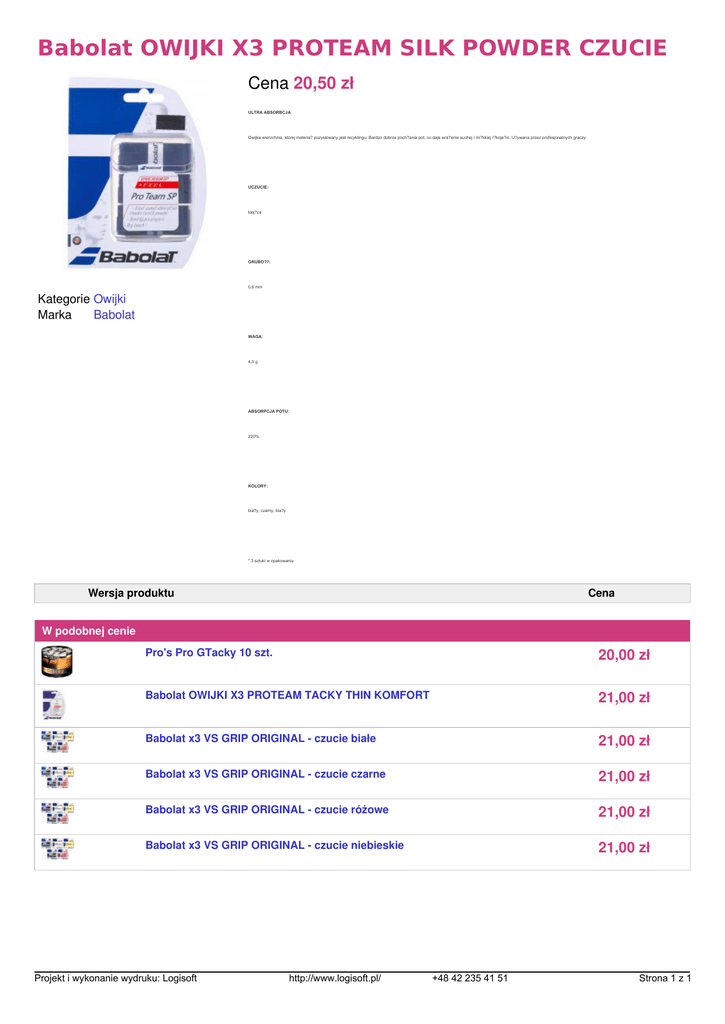 Babolat OWIJKI X3 PROTEAM SILK POWDER CZUCIE Cena 20,50 zł ULTRA ABSORBCJA Owijka wierzchnia, której materia? pozyskiwany jest recyklingu. Bardzo dobrze poch?ania pot, co daje wra?enie suchej i mi?kkiej r?koje?ci. U?ywana przez profesjonalnych graczy. UCZUCIE: klej?ca GRUBO??: 0,6 mm Kategorie Owijki Marka Babolat WAGA: 4,5 g ABSORPCJA POTU: 220% KOLORY: bia?y, czarny, bia?y * 3 sztuki w opakowaniu Wersja produktu Cena W podobnej cenie Pro's Pro GTacky 10 szt. 20,00 zł Babolat OWIJKI X3 PROTEAM TACKY THIN KOMFORT 21,00 zł Babolat x3 VS GRIP ORIGINAL - czucie białe 21,00 zł Babolat x3 VS GRIP ORIGINAL - czucie czarne 21,00 zł Babolat x3 VS GRIP ORIGINAL - czucie różowe 21,00 zł Babolat x3 VS GRIP ORIGINAL - czucie niebieskie 21,00 zł Projekt i wykonanie wydruku: Logisoft Powered by TCPDF (www.tcpdf.org) http://www.logisoft.pl/ +48 42 235 41 51 Strona 1 z 1