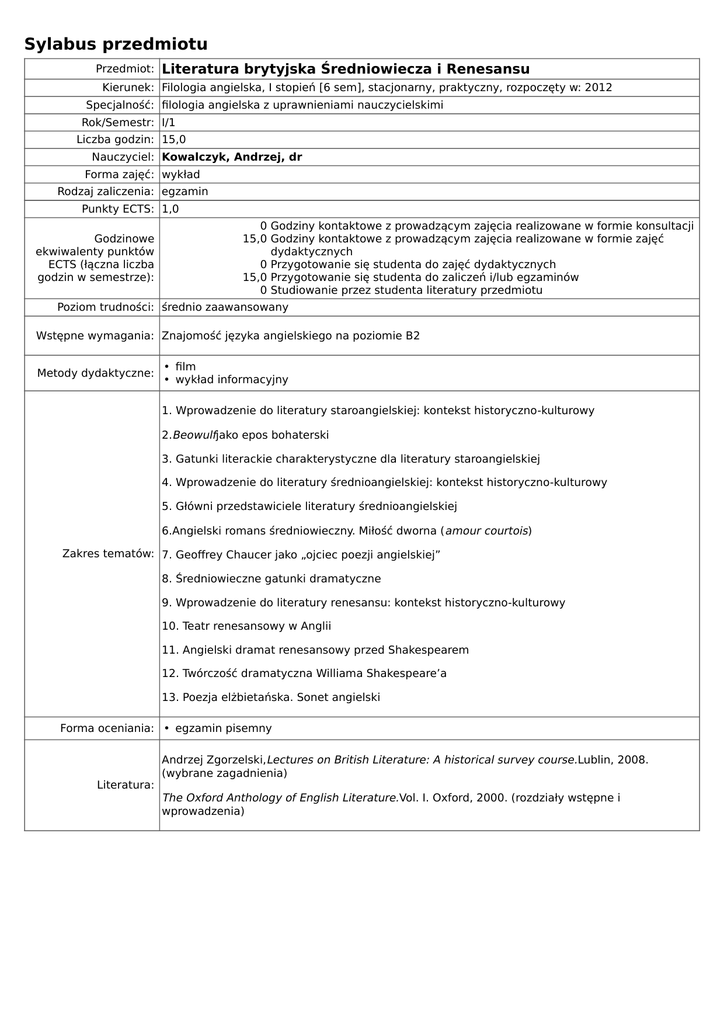 Sylabus przedmiotu Przedmiot: Literatura brytyjska Średniowiecza i Renesansu Kierunek: Filologia angielska, I stopień [6 sem], stacjonarny, praktyczny, rozpoczęty w: 2012 Specjalność: filologia angielska z uprawnieniami nauczycielskimi Rok/Semestr: I/1 Liczba godzin: 15,0 Nauczyciel: Kowalczyk, Andrzej, dr Forma zajęć: wykład Rodzaj zaliczenia: egzamin Punkty ECTS: 1,0 Godzinowe ekwiwalenty punktów ECTS (łączna liczba godzin w semestrze): 0 Godziny kontaktowe z prowadzącym zajęcia realizowane w formie konsultacji 15,0 Godziny kontaktowe z prowadzącym zajęcia realizowane w formie zajęć dydaktycznych 0 Przygotowanie się studenta do zajęć dydaktycznych 15,0 Przygotowanie się studenta do zaliczeń i/lub egzaminów 0 Studiowanie przez studenta literatury przedmiotu Poziom trudności: średnio zaawansowany Wstępne wymagania: Znajomość języka angielskiego na poziomie B2 Metody dydaktyczne: • film • wykład informacyjny 1. Wprowadzenie do literatury staroangielskiej: kontekst historyczno-kulturowy 2.Beowulfjako epos bohaterski 3. Gatunki literackie charakterystyczne dla literatury staroangielskiej 4. Wprowadzenie do literatury średnioangielskiej: kontekst historyczno-kulturowy 5. Główni przedstawiciele literatury średnioangielskiej 6.Angielski romans średniowieczny. Miłość dworna ( amour courtois) Zakres tematów: 7. Geoffrey Chaucer jako „ojciec poezji angielskiej” 8. Średniowieczne gatunki dramatyczne 9. Wprowadzenie do literatury renesansu: kontekst historyczno-kulturowy 10. Teatr renesansowy w Anglii 11. Angielski dramat renesansowy przed Shakespearem 12. Twórczość dramatyczna Williama Shakespeare’a 13. Poezja elżbietańska. Sonet angielski Forma oceniania: • egzamin pisemny Literatura: Andrzej Zgorzelski,Lectures on British Literature: A historical survey course. Lublin, 2008. (wybrane zagadnienia) The Oxford Anthology of English Literature.Vol. I. Oxford, 2000. (rozdziały wstępne i wprowadzenia)