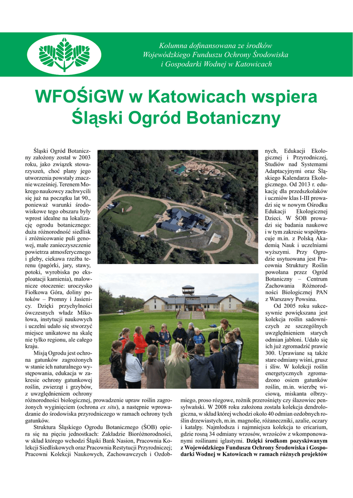 Środowisko w którym żyjemy Kolumna dofinansowana ze środków Wojewódzkiego Funduszu Ochrony Środowiska i Gospodarki Wodnej w Katowicach WFOŚiGW w Katowicach wspiera Śląski Ogród Botaniczny Śląski Ogród Botaniczny założony został w 2003 roku, jako związek stowarzyszeń, choć plany jego utworzenia powstały znacznie wcześniej. Terenem Mokrego naukowcy zachwycili się już na początku lat 90., ponieważ warunki środowiskowe tego obszaru były wprost idealne na lokalizację ogrodu botanicznego: duża różnorodność siedlisk i zróżnicowanie puli genowej, małe zanieczyszczenie powietrza atmosferycznego i gleby, ciekawa rzeźba terenu (pagórki, jary, stawy, potoki, wyrobiska po eksploatacji kamienia), malownicze otoczenie: uroczysko Fiołkowa Góra, doliny potoków – Promny i Jasienicy. Dzięki przychylności ówczesnych władz Mikołowa, instytucji naukowych i uczelni udało się stworzyć miejsce unikatowe na skalę nie tylko regionu, ale całego kraju. Misją Ogrodu jest ochrona gatunków zagrożonych w stanie ich naturalnego występowania, edukacja w zakresie ochrony gatunkowej roślin, zwierząt i grzybów, z uwzględnieniem ochrony różnorodności biologicznej, prowadzenie upraw roślin zagrożonych wyginięciem (ochrona ex situ), a następnie wprowadzanie do środowiska przyrodniczego w ramach ochrony tych gatunków. Struktura Śląskiego Ogrodu Botanicznego (ŚOB) opiera się na pięciu jednostkach: Zakładzie Bioróżnorodności, w skład którego wchodzi Śląski Bank Nasion, Pracownia Kolekcji Siedliskowych oraz Pracownia Restytucji Przyrodniczej; Pracowni Kolekcji Naukowych, Zachowawczych i Ozdob10 nych, Edukacji Ekologicznej i Przyrodniczej, Studiów nad Systemami Adaptacyjnymi oraz Śląskiego Kalendarza Ekologicznego. Od 2013 r. edukację dla przedszkolaków i uczniów klas I-III prowadzi się w nowym Ośrodku Edukacji Ekologicznej Dzieci. W ŚOB prowadzi się badania naukowe i w tym zakresie współpracuje m.in. z Polską Akademią Nauk i uczelniami wyższymi. Przy Ogrodzie usytuowana jest Pracownia Struktury Roślin powołana przez Ogród Botaniczny – Centrum Zachowania Różnorodności Biologicznej PAN z Warszawy Powsina. Od 2005 roku sukcesywnie powiększana jest kolekcja roślin sadowniczych ze szczególnych uwzględnieniem starych odmian jabłoni. Udało się ich już zgromadzić prawie 300. Uprawiane są także stare odmiany wiśni, grusz i śliw. W kolekcji roślin energetycznych zgromadzono osiem gatunków roślin, m.in. wierzbę wiciową, miskanta olbrzymiego, proso rózgowe, rożnik przerośnięty czy ślazowiec pensylwański. W 2008 roku założona została kolekcja dendrologiczna, w skład której wchodzi około 40 odmian ozdobnych roślin drzewiastych, m.in. magnolie, różaneczniki, azalie, oczary i katalpy. Najmłodsza i najmniejsza kolekcja to ericarium, gdzie rosną 34 odmiany wrzosów, wrzośców z wkomponowanymi roślinami iglastymi. Dzięki środkom pozyskiwanym z Wojewódzkiego Funduszu Ochrony Środowiska i Gospodarki Wodnej w Katowicach w ramach różnych projektów ŚLĄSKIE AKTUALNOŚCI ROLNICZE - grudzień 2014 Środowisko w którym żyjemy kolekcje mogą być rozwijane i zakładane nowe. Ostatnią z nich jest powstały w tym roku ogród warzywny w ramach projektu „Ogród edukacyjny roślin uprawnych, warzywnych oraz zielarskich”. Poza WFOŚiGW projekt wsparła firma handlowa Rolnik sp. j. z Mikołowa. Powierzchnia kolekcji wynosi 0,6 ha. Śląski Ogród Botaniczny prowadzi szeroko zakrojoną edukację ekologiczną i przyrodniczą. Warsztaty odbywają się zarówno w terenie, jak i na miejscu – w siedzibie ŚOB na Sośniej Górze, w formie wykładów czy laboratoriów i skierowane są do wszystkich zainteresowanych, niezależnie od wieku. Dla najmłodszych, czyli przedszkolaków i uczniów klas I-III, zajęcia odbywają się w nowym Ośrodku Edukacji Ekologicznej Dzieci, a dla starszych – w Centrum Edukacji Przyrodniczej i Ekologicznej (CEPiE). Zajęcia te prowadzone są nieodpłatnie dzięki środkom z WFOŚiGW. Dużym powodzeniem cieszą się niedzielne święta ekologiczne organizowane w ramach Śląskiego Kalendarza Ekologicznego również przy wsparciu WFOŚiGW. Są to wydarzenia, w których udział biorą całe rodziny, naukowcy, artyści, ekolodzy, przyrodnicy etc. Święta te obejmują zarówno wykłady i zajęcia tematyczne, jak również występy artystyczne, gry, zabawy i warsztaty edukacyjne stacjonarne i w plenerze, których tematyka nawiązuje do danego święta ekologicznego, m.in. Dzień, Ziemi, Roślin, Pszczoły, Ptaków, Siedlisk Naturalnych, Drzewa, Zwierząt – dzięki tej różnorodności dosłownie każdy znajdzie coś interesującego dla siebie. W tym roku Ogród poszerzył swoją działalność o organizację wystaw fotograficznych. Do końca 2015 roku odwiedzający będą mogli zobaczyć jeszcze pięć ekspozycji nawiązujących do szeroko rozumianej różnorodności, gdyż motywem przewodnim kampanii, w ramach której odbywają się wystawy jest „Różnorodność – potęga życia”. Przez dwa miesiące można było podziwiać wielkoformatowe zdjęcia przedstawiające Puszczę Białowieską, a aktualnie (do marca 2015 r.) organizatorzy zapraszają na wystawę IGPOTY, prezentującą wspaniałe fotografie z całego świata, nagrodzone w prestiżowym konkursie International Garden Photographer of the Year. Wybudowanie infrastruktury wystawienniczej, druk fotografii oraz działania towarzyszące wystawom, tj. warsztaty czy seminaria, zostały dofinansowane ze środków WFOŚiGW w Katowicach. Na koniec warto wspopmnieć, że od 2011 roku działa w Ogrodzie Śląski Bank Nasion. Jego powołanie było możliwe dzięki znacznemu wsparciu NFOŚ. Małgorzata Szymańczyk Rzecznik Prasowy ŚOB Fot. archiwum ŚOB Treści zawarte w publikacji nie stanowią oficjalnego stanowiska organów Wojewódzkiego Funduszu Ochrony Środowiska i Gospodarki Wodnej w Katowicach ŚLĄSKIE AKTUALNOŚCI ROLNICZE -