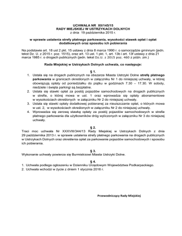 UCHWAŁA NR XII/145/15 RADY MIEJSKIEJ W USTRZYKACH DOLNYCH z dnia 19 października 2015 r. w sprawie ustalenia strefy płatnego parkowania, wysokości stawek opłat i opłat dodatkowych oraz sposobu ich pobierania Na podstawie art. 18 ust 2 pkt. 15 ustawy z dnia 8 marca 1990 r. o samorządzie gminnym (jedn. tekst Dz. U. z 2015 r. poz. 1515), oraz art. 13 ust. 1 pkt. 1, art. 13b i art. 13f ustawy z dnia 21 marca 1985 r. o drogach publicznych (jedn. tekst Dz.U. z 2015 poz. 460 z późn. zm.) Rada Miejskiej w Ustrzykach Dolnych uchwala, co następuje: § 1. 1. Ustala się na drogach publicznych na obszarze Miasta Ustrzyki Dolne strefę płatnego parkowania w granicach określonych w załączniku Nr 1 do niniejszej uchwały, w której obowiązują opłaty od poniedziałku do piątku w godzinach 7.30 – 17.30. W soboty, niedziele i święta parkingi są bezpłatne. 2. Ustala się stawki opłat za postój pojazdów samochodowych na drogach publicznych w strefie, o której mowa w ust. 1 oraz wprowadza się opłaty abonamentowe w wysokościach określonych w załączniku Nr 2 do niniejszej uchwały. 3. Ustala się stawki opłaty dodatkowej pobieranej za nieuiszczanie opłat, o których mowa w ust. 2, w wysokościach określonych w załączniku Nr 2 do niniejszej uchwały. 4. Wprowadza się zerową stawkę opłaty za postój pojazdów samochodowych w strefie płatnego parkowania dla użytkowników dróg wyliczonych w załączniku Nr 3 do niniejszej uchwały. § 2. Traci moc uchwała Nr XXXVIII/344/13 Rady Miejskiej w Ustrzykach Dolnych z dnia 29 października 2013 r. w sprawie ustalenia strefy płatnego parkowania na drogach publicznych w Ustrzykach Dolnych oraz określenia opłat za parkowanie pojazdów samochodowych i sposobu ich pobierania. § 3. Wykonanie uchwały powierza się Burmistrzowi Miasta Ustrzyki Dolne. § 4. 1. Uchwała podlega ogłoszeniu w Dzienniku Urzędowym Województwa Podkarpackiego. 2. Uchwała wchodzi w życie z dniem 1 stycznia 2016 r. Przewodniczący Rady Miejskiej Załącznik Nr 1 do Uchwały Nr XII/145/15 Rady Miejskiej w Ustrzykach Dolnych z dnia 19 października 2015 r. OBSZAR STREFY PŁATNEGO PARKOWANIA (SPP) NA DROGACH PUBLICZNYCH NA OBSZARZE MIASTA USTRZYKI DOLNE 1. Ustala się Strefę Płatnego Parkowania w centrum miasta na następujących ulicach charakteryzujących się znacznym deficytem miejsc postojowych: ul. Rynek - przy Zielonym Rynku, - w obszarze zaplecza pierzei południowej Rynku ( od budynku „Multimedia” do budynku Miejsko-Gminnej Biblioteki Publicznej - obok Kawiarni „Orlik”, - naprzeciwko budynku SHU Halicz „Bieszczadzka”, ul. Bełska - od budynku Banku PKO BP w kierunku ul. Wyzwolenia po obu stronach ulicy, ul. Wyzwolenia- strona prawa ( przy budynku Księgarni). 2. Granice obszaru Strefy Płatnego Parkowania obejmują wszystkie miejsca postojowe w pasie drogowym z wyłączeniem postojów taksówek. 3. Mapa Strefy Płatnego Parkowania. Załącznik Nr 2 do Uchwały Nr XII/145/15 Rady Miejskiej w Ustrzykach Dolnych z dnia 19 października 2015 r. STAWKI OPŁAT za postój pojazdów samochodowych na drogach publicznych Miasta Ustrzyki Dolne w strefie płatnego parkowania oraz opłaty dodatkowej. Stawki opłat za postój pojazdów samochodowych na drogach publicznych w strefie płatnego parkowania wynoszą: 1) samochody osobowe a) b) c) d) e) za pierwsze 15 minut postoju - bezpłatnie za rozpoczętą pierwszą płatną godzinę postoju - 2,50 zł za rozpoczętą drugą godzinę postoju – 3,00 zł za rozpoczętą trzecią godzinę postoju – 3,50 zł za czwartą i kolejne godziny postoju – 2,50 zł 2) samochody ciężarowe, autobusy, busy powyżej 3,5 tony dopuszczalnej masy całkowitej pojazdu a) b) c) d) za pierwszą godzinę postoju - 3,00 zł za rozpoczętą drugą godzinę postoju – 3,50 zł za rozpoczętą trzecią godzinę postoju – 4,00 zł za czwartą i kolejne godziny postoju – 3,00 zł Opłaty abonamentowe Miesięczna stawka opłaty abonamentowej za postój na wyznaczonych stanowiskach ogólnodostępnych w strefie płatnego parkowania wynosi : a) samochodu osobowego- 75,00 zł b) samochodu ciężarowego, autobusu i busa- 200,00 zł STAWKA OPŁATY DODATKOWEJ Za nieuiszczenie opłat za postój w Strefie Płatnego Parkowania, w tym za uiszczenie opłaty w zaniżonej wysokości lub przekroczenie opłaconego czasu postoju pobiera się opłatę dodatkową w wysokości 50,00 zł. POBÓR OPŁAT Pobór opłaty za postój pojazdów samochodowych oraz opłaty dodatkowej dokonywany będzie w sposób określony w umowie z dzierżawcą miejsc parkingowych wyłonionym w drodze przetargu nieograniczonego. Załącznik Nr 3 do Uchwały Nr XII/145/15 Rady Miejskiej w Ustrzykach Dolnych z dnia 19 października 2015 r. UŻYTKOWNICY DRÓG DLA KTÓRYCH WPROWADZONO ZEROWĄ STAWKĘ OPŁATY ZA POSTÓJ POJAZDÓW SAMOCHODOWYCH W STREFIE PŁATNEGO PARKOWANIA NA OBSZARZE MIASTA USTRZYKI DOLNE Ustala się zerową stawkę opłaty za postój: 1. pojazdów zaopatrzonych w aktualną kartę parkingową. 2. pojazdów służb miejskich podczas wykonywania obowiązków służbowych (Urzędu Miasta Ustrzyki Dolne, Przedsiębiorstwa Energetyki Cieplnej, Miejskiego Przedsiębiorstwa Gospodarki Komunalnej, Zarządu Gospodarki Mieszkaniowej Pogotowia Energetycznego itp.).