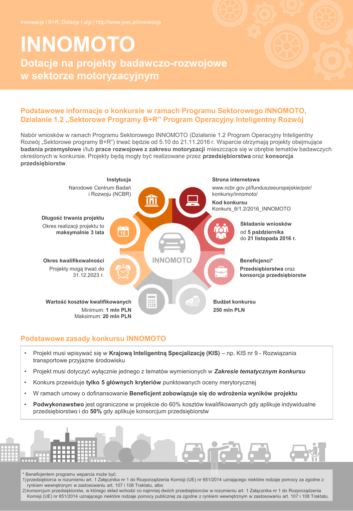 Innowacje i B+R, Dotacje i ulgi | http://www.pwc.pl/innowacje INNOMOTO Dotacje na projekty badawczo-rozwojowe w sektorze motoryzacyjnym Podstawowe informacje o konkursie w ramach Programu Sektorowego INNOMOTO, Działanie 1.2 „Sektorowe Programy B+R” Program Operacyjny Inteligentny Rozwój Nabór wniosków w ramach Programu Sektorowego INNOMOTO (Działanie 1.2 Program Operacyjny Inteligentny Rozwój „Sektorowe programy B+R”) trwać będzie od 5.10 do 21.11.2016 r. Wsparcie otrzymają projekty obejmujące badania przemysłowe i/lub prace rozwojowe z zakresu motoryzacji mieszczące się w obrębie tematów badawczych określonych w konkursie. Projekty będą mogły być realizowane przez przedsiębiorstwa oraz konsorcja przedsiębiorstw. Instytucja Strona internetowa Narodowe Centrum Badań i Rozwoju (NCBR) www.ncbr.gov.pl/funduszeeuropejskie/poir/ konkursy/innomoto/ Kod konkursu Konkurs_6/1.2/2016_INNOMOTO Długość trwania projektu Składanie wniosków Okres realizacji projektu to maksymalnie 3 lata Okres kwalifikowalności od 5 października do 21 listopada 2016 r. INNOMOTO Projekty mogą trwać do 31.12.2023 r. Wartość kosztów kwalifikowanych Minimum: 1 mln PLN Maksimum: 20 mln PLN Beneficjenci* Przedsiębiorstwa oraz konsorcja przedsiębiorstw Budżet konkursu 250 mln PLN Podstawowe zasady konkursu INNOMOTO • Projekt musi wpisywać się w Krajową Inteligentną Specjalizację (KIS) – np. KIS nr 9 - Rozwiązania transportowe przyjazne środowisku • Projekt musi dotyczyć wyłącznie jednego z tematów wymienionych w Zakresie tematycznym konkursu • Konkurs przewiduje tylko 5 głównych kryteriów punktowanych oceny merytorycznej • W ramach umowy o dofinansowanie Beneficjent zobowiązuje się do wdrożenia wyników projektu • Podwykonawstwo jest ograniczone w projekcie do 60% kosztów kwalifikowanych gdy aplikuje indywidualne przedsiębiorstwo i do 50% gdy aplikuje konsorcjum przedsiębiorstw * Beneficjentem programu wsparcia może być: 1) przedsiębiorca w rozumieniu art. 1 Załącznika nr 1 do Rozporządzenia Komisji (UE) nr 651/2014 uznającego niektóre rodzaje pomocy za zgodne z rynkiem wewnętrznym w zastosowaniu art. 107 i 108 Traktatu, albo 2) konsorcjum przedsiębiorstw, w którego skład wchodzi co najmniej dwóch przedsiębiorców w rozumieniu art. 1 Załącznika nr 1 do Rozporządzenia Komisji (UE) nr 651/2014 uznającego niektóre rodzaje pomocy publicznej za zgodne z rynkiem wewnętrznym w zastosowaniu art. 107 i 108 Traktatu. Innowacje i B+R, Dotacje i ulgi | http://www.pwc.pl/innowacje Zakres tematyczny konkursu Zagadnienia badawcze: I. Innowacyjne technologie produkcji, regeneracji, odzysku i recyklingu I.A.1. Udoskonalone lub nowe linie technologiczne i technologie produkcji pojazdów i części motoryzacyjnych I.A.2. Udoskonalone lub nowe linie technologiczne i technologie regeneracji komponentów i części motoryzacyjnych I.A.3. Udoskonalone lub nowe technologie wytwarzania materiałów i warstw wierzchnich I.A.4. Udoskonalone lub nowe technologie poprawiające właściwości wytrzymałościowe materiałów oraz technologie łączenia materiałów III. Innowacyjne części, komponenty i systemy do zastosowania w pojazdach II. Innowacyjne pojazdy i napędy II.A.1. Pojazdy osobowe III.A.1. Materiały metalowe II.A.2. Pojazdy ciężarowe, specjalne, autobusy i pozostałe III.A.2. Materiały polimerowe i kompozytowe II.B.1. Nadwozia III.A.3. Pokrycia i powłoki II.B.2. Naczepy i przyczepy III.A.4. Materiały na elementy cierne II.B.3. Zabudowy III.A.5. Materiały pędne, oleje i smary II.C.1. Napędy alternatywne oraz związana z nimi infrastruktura III.B.1. Układy wymiany ciepła II.C.2. Napędy spalinowe III.B.2. Układy oświetlenia oraz układy poprawiające widoczność III.B.3. Systemy bezpieczeństwa I.A.5. Udoskonalone lub nowe metody odzysku, recyklingu i utylizacji III.B.4. Układy zawieszenia, przeniesienia napędu, kierownicze i hamulcowe I.A.6. Udoskonalone lub nowe metody ograniczania negatywnego wpływu procesów produkcyjnych na środowisko III.B.5. Układy elektryczne i elektroniczne III.B.6. Pozostałe części, elementy oraz podzespoły III.B.7. Elementy wyposażenia wnętrza III.B.8. Układy wydechowe Poziomy dofinansowania Badania przemysłowe/prace rozwojowe Małe przedsiębiorstwo Średnie przedsiębiorstwo Warunki uzyskania premii* 70%/ 45% + 15% premii* 60%/ 35% 1 Szerokie rozpowszechnienie wyników projektu lub Duże przedsiębiorstwo 50%/ 25% * Przy skorzystaniu z premii poziom dofinasowania dla badań przemysłowych nie może przekroczyć 80%. 2 Skuteczna współpraca co najmniej 2 niepowiązanych przedsiębiorców Innowacje i B+R, Dotacje i ulgi | http://www.pwc.pl/innowacje Kryteria wyboru Ocena formalna Ocena formalna wniosku Ocena formalna dotyczy głównie poprawności, kompletności terminowości złożenia dokumentacji, ale również wiarygodności finansowej wnioskodawcy. Dla dużych przedsiębiorstw weryfikowane będzie występowanie efektu dyfuzji poprzez opis planowanej współpracy z MŚP lub NGO lub organizacjami B+R. Ocena merytoryczna – Ocena indywidualna Ocena merytoryczna wniosku • Podstawowe kryteria merytoryczne dostępu (Tak/Nie) - • Projekt obejmuje badania przemysłowe i prace rozwojowe albo prace rozwojowe i dotyczy innowacji produktowej lub procesowej, Projekt wpisuje się w Krajową Inteligentną Specjalizację (KIS), Projekt jest zgodny z zakresem tematycznym konkursu, Kwestia własności intelektualnej nie stanowi bariery, Kadra zarządzająca oraz sposób zarządzania w projekcie umożliwia jego prawidłową realizację. Kryteria merytoryczne punktowane - Zaplanowane prace B+R są adekwatne i niezbędne do osiągnięcia celu projektu, a ryzyka z nimi związane zostały zdefiniowane (0-5 pkt), Zespół badawczy oraz zasoby techniczne wnioskodawcy zapewniają prawidłową realizację zaplanowanych w projekcie prac B+R (0-5 pkt), Nowość rezultatów projektu (0-5 pkt), Zapotrzebowanie ry