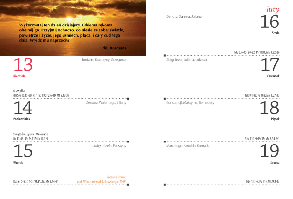 Danuty, Daniela, Juliana Wykorzystaj ten dzień dzisiejszy. Obiema rękoma obejmij go. Przyjmij ochoczo, co niesie ze sobą: światło, powietrze i życie, jego uśmiech, płacz, i cały cud tego dnia. Wyjdź mu naprzeciw 13 Rdz 8, 6-13. 20-22; Ps 116B; Mk 8,22-26 Zbigniewa, Juliana, Łukasza Niedziela Rdz 9,1-13; Ps 102; Mk 8,27-33 Zenona, Walentego, Liliany Konstancji, Maksyma, Bernadety Poniedziałek Rdz 11,1-9; Ps 33; Mk 8,34-9,1 Jowity, Józefa, Faustyny Wtorek Rdz 6, 5-8; 7, 1-5. 10; Ps 29; Mk 8,14-21 18 Piątek Święto Św. Cyryla i Metodego Dz 13,46-49; Ps 117; Łk 10,1-9 15 17 Czwartek 6. zwykła (II) Syr 15,15-20; Ps 119; 1 Kor 2,6-10; Mt 5,17-37 14 16 Środa Phil Bosmans Jordana, Katarzyny, Grzegorza luty Marcelego, Arnolda, Konrada 19 Sobota Rocznica śmierci prof. Włodzimierza Fijałkowskiego (2003) Hbr 11,1-7; Ps 145; Mk 9,2-13