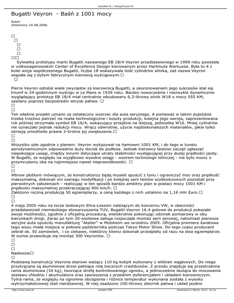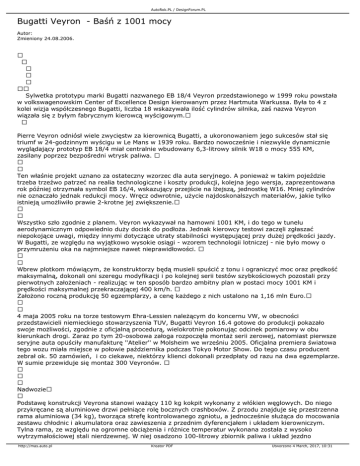 AutoRok.PL / DesignForum.PL Bugatti Veyron - Baśń z 1001 mocy Autor: Zmieniony 24.08.2006. Sylwetka prototypu marki Bugatti nazwanego EB 18/4 Veyron przedstawionego w 1999 roku powstała w volkswagenowskim Center of Excellence Design kierowanym przez Hartmuta Warkussa. Była to 4 z kolei wizja współczesnego Bugatti, liczba 18 wskazywała ilość cylindrów silnika, zaś nazwa Veyron wiązała się z byłym fabrycznym kierowcą wyścigowym. Pierre Veyron odniósł wiele zwycięstw za kierownicą Bugatti, a ukoronowaniem jego sukcesów stał się triumf w 24-godzinnym wyścigu w Le Mans w 1939 roku. Bardzo nowocześnie i niezwykle dynamicznie wyglądający prototyp EB 18/4 miał centralnie wbudowany 6,3-litrowy silnik W18 o mocy 555 KM, zasilany poprzez bezpośredni wtrysk paliwa. Ten właśnie projekt uznano za ostateczny wzorzec dla auta seryjnego. A ponieważ w takim pojeździe trzeba trzeźwo patrzeć na realia technologiczne i koszty produkcji, kolejna jego wersja, zaprezentowana rok później otrzymała symbol EB 16/4, wskazujący przejście na lżejszą, jednostkę W16. Mniej cylindrów nie oznaczało jednak redukcji mocy. Wręcz odwrotnie, użycie najdoskonalszych materiałów, jakie tylko istnieją umożliwiło prawie 2-krotne jej zwiększenie. Wszystko szło zgodnie z planem. Veyron wykazywał na hamowni 1001 KM, i do tego w tunelu aerodynamicznym odpowiednio duży docisk do podłoża. Jednak kierowcy testowi zaczęli zgłaszać niepokojące uwagi, między innymi dotyczące utraty stabilności występującej przy dużej prędkości jazdy. W Bugatti, ze względu na wyjątkowo wysokie osiągi - wzorem technologii lotniczej - nie było mowy o przymrużeniu oka na najmniejsze nawet nieprawidłowości. Wbrew plotkom mówiącym, że konstruktorzy będą musieli spuścić z tonu i ograniczyć moc oraz prędkość maksymalną, dokonali oni szeregu modyfikacji i po kolejnej serii testów szybkościowych pozostali przy pierwotnych założeniach - realizując w ten sposób bardzo ambitny plan w postaci mocy 1001 KM i prędkości maksymalnej przekraczającej 400 km/h. Założono roczną produkcję 50 egzemplarzy, a cenę każdego z nich ustalono na 1,16 mln Euro. 4 maja 2005 roku na torze testowym Ehra-Lessien należącym do koncernu VW, w obecności przedstawicieli niemieckiego stowarzyszenia TUV, Bugatti Veyron 16.4 gotowe do produkcji pokazało swoje możliwości, zgodnie z oficjalną procedurą, wielokrotnie pokonując odcinek pomiarowy w obu kierunkach drogi. Zaraz po tym 20-osobowa załoga rozpoczęła montaż serii zerowej, natomiast pierwsze seryjne auta opuściły manufakturę ''Atelier'' w Molsheim we wrześniu 2005. Oficjalna premiera światowa tego wozu miała miejsce w połowie października podczas Tokyo Motor Show. Do tego czasu producent zebrał ok. 50 zamówień, i co ciekawe, niektórzy klienci dokonali przedpłaty od razu na dwa egzemplarze. W sumie przewiduje się montaż 300 Veyronów. Nadwozie Podstawę konstrukcji Veyrona stanowi ważący 110 kg kokpit wykonany z włókien węglowych. Do niego przykręcane są aluminiowe drzwi pełniące rolę bocznych crashboxów. Z przodu znajduje się przestrzenna rama aluminiowa (34 kg), tworząca strefę kontrolowanego zgniotu, a jednocześnie służąca do mocowania zestawu chłodnic i akumulatora oraz zawieszenia z przednim dyferencjałem i układem kierowniczym. Tylna rama, ze względu na ogromne obciążenia i różnice temperatur wykonana została z wysoko wytrzymałościowej stali nierdzewnej. W niej osadzono 100-litrowy zbiornik paliwa i układ jezdno http://mas.auto.pl Kreator PDF Utworzono 4 March, 2017, 10:31 AutoRok.PL / DesignForum.PL napędowy. Większość pozostałych elementów tworzących poszycie zewnętrzne karoserii wykonano z włókien węglowych. Mimo tak doskonałych materiałów, auto naszpikowane supertechniką waży 1888 kg. Jak przystało na ten typ pojazdu, wnętrze jest 2-miejscowe, skrojone na miarę osoby wysportowanej, tolerującej jazdę w pozycji półleżącej. Aerodynamika W przypadku samochodu osiągającego prędkość 407 km/h, ważny jest nie tylko współczynnik Cx, ale również pozostałe właściwości aerodynamiczne - w tym właściwy docisk obu osi. By był on odpowiednio duży (350 kg przy 375 km/h), aerodynamicy musieli uciec się do najbardziej wyszukanych rozwiązań, jeszcze bardziej skomplikowanych niż w wyścigówkach F1. A że w przypadku aut drogowych nikt nie zabrania stosowania ruchomych odchylaczy strug powietrza, przed przednimi kołami oraz w tylnej części płyty podłogowej wykonano aktywne dyfuzory. Ich skuteczność zależy od prześwitu, a ten regulowany jest w sposób dynamiczny hydraulicznymi siłownikami zawieszenia. Oczywiście nad całością czuwa elektronika, która musi brać pod uwagę nie tylko wymogi aerodynamiki, ale i termodynamiki. Do 220 km/h zasadniczo utrzymywany jest prześwit 12,5 cm. Powyżej tej prędkości prześwit z przodu maleje do 8 cm, a z tyłu do 9,5 cm. Również ustawieniem tylnego spoilera zawiaduje komputer, posługujący się wieloma sensorami i siłownikami, które mogą spowodować, że w zaledwie 0,4 s skrzydło zmieniając swoje ustawienie o 700 stanie się potężnym hamulcem powietrznym. Następuje to, gdy hamowanie zaczyna się przy prędkości większej niż 200 km/h. Pomiar w tunelu aerodynamicznym wskazał, że samo rozwiązanie zwane Airbrake potrafi wywołać opóźnienie równe 0,6 g. Gdy prędkość jazdy spada poniżej 140 km/h wszystkie systemy związane z aerodynamiką powracają do pozycji neutralnej. W efekcie wartość Cx jest zmienna: standardowo wynosi ona 0,393, przy ustawieniach miejskich - 0,417, w konfiguracji ''top speed'' - 0,355, zaś w konfiguracji ''airbrake'' - 0,682. Dzięki tak wyrafinowanym i bardzo kosztownym rozwiązaniom, Veyron może rozpędzać się do 407 km/h. Nie da się ukryć, że jest to ekstremalnie wysoka prędkość. Dlatego też zastosowano ogranicznik, pozwalający na osiągani