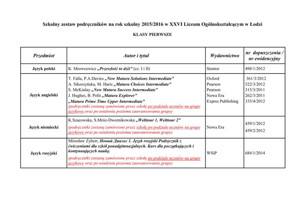 Szkolny zestaw podręczników na rok szkolny 2015/2016 w XXVI Liceum Ogólnokształcącym w Łodzi KLASY PIERWSZE nr dopuszczenia / nr ewidencyjny Przedmiot Autor i tytuł Język polski K. Mrowcewicz „Przeszłość to dziś” (cz. I i II) Stentor 498/1/2012 T. Falla, P.A.Davies „New Matura Solutions Intermediate” A. Sikorzyńska, M. Haris „Matura Choices Intermediate” S. McKinlay „New Matura Success Intermediate” J. Hughes, B. Polit „Matura Explorer” „Matura Prime Time Upper Intermediate” (podręczniki zostaną zamówione przez szkołę po podziale uczniów na grupy językowe oraz po ustaleniu poziomu zaawansowania grupy) Oxford Pearson Pearson Nowa Era Expres Publishing 361/3/2012 522/3/2012 315/3/2011 262/3/2011 335/4/2012 Język angielski Wydawnictwo K.Szacowska, S.Mróz-Dwornikowska „Welttour 1, Welttour 2” Język niemiecki Język rosyjski (podręczniki zostaną zamówione przez szkołę po podziale uczniów na grupy językowe oraz po ustaleniu poziomu zaawansowania grupy) Mirosław Zybert, Новый Диалог 1. Język rosyjski Podręcznik z ćwiczeniami dla szkół ponadgimnazjalnych. Kurs dla początkujących i kontynuujących naukę. (podręczniki zostaną zamówione przez szkołę po podziale uczniów na grupy językowe oraz po ustaleniu poziomu zaawansowania grupy) Nowa Era WSiP 459/1/2012 459/2/2012 684/1/2014 Język francuski En action 1, autor: Fabienne Gallon i Celine Himber. Adaptacja polska: Anna Głowacka. (podręczniki zostaną zamówione przez szkołę po podziale uczniów na grupy językowe oraz po ustaleniu poziomu zaawansowania grupy) Hachette 745/1/2015 SGEL 249/1/2009 Nuevo Espanol en marcha A1 + A2 i zeszyt ćwiczeń Język hiszpański Historia WOS (podręczniki zostaną zamówione przez szkołę po podziale uczniów na grupy językowe oraz po ustaleniu poziomu zaawansowania grupy) Sławomir Roszak, Jarosław Kłaczkow „Poznać przeszłość. Wiek XX” (zakres podstawowy) Nowa Era 525/2012 Marek Jekiel „W centrum uwagi” (zakres podstawowy) Nowa Era 505/2012 PWN 355/2011 Nowa Era 433/2012 ZamKor 394/2011 Nowa Era 450/2012 Nowa Era 564/1/2012 Nowa Era 438/2012 B. Lenartowicz, M. Wójcik „Czas na geografię” (zakres podstawowy) podręcznik i zeszyt ćwiczeń, - KLASY 1B, 1C, 1D, 1E Geografia J. Uliszak, K.Wiadermann „Oblicza geografii” podręcznik, (zakres podstawowy) - KLASA 1A Fizyka Maria Fijałkowska (red.) „Świat fizyki” – podręcznik dla szkół ponadgimnazjalnych E.Bonar, W. Kruszowiec-Jeleń, S.Czachorowski „Biologia na czasie” poziom podstawowy – wszystkie klasy Biologia oraz M. Guzik, E. Jastrzębska „Biologia na czasie”-część 1 KLASY 1C, 1E - od drugiego semestru Chemia Romuald Hass, Aleksandra Mrzigod, Janusz Mrzigod „To jest chemia" poziom podstawowy Matematyka Podstawy przedsiębiorczości Informatyka Edukacja dla bezpieczeństwa Marcin Kurczab, Elżbieta Kurczab, Elżbieta Świda „Matematyka” podręcznik dla liceów i techników (zakres podstawowy) oraz zbiór zadań KLASY 1A, 1C Marcin Kurczab, Elżbieta Kurczab, Elżbieta Świda „Matematyka” podręcznik dla liceów i techników. (zakres podstawowy i rozszerzony) oraz zbiór zadań KLASY 1B,1D,1E Zbigniew Makieła, Tomasz Rachwał „Krok w przedsiębiorczość” podręcznik dla szkoły ponadgimnazjalnej (zakres podstawowy) Nowa Era 467/2012 Operon 452/2012 PWN 422/2012 WSiP 500/2012 Monika Bokiniec, Barbara Forysiewicz „Spotkania z kulturą” Nowa Era 449/2012 „Wędrując ku dorosłości” – wychowanie do życia w rodzinie dla uczniów szkół ponadgimnazjalnych (podręcznik i ćwiczenia) Rubikon DKW-4015-20/01 Arkadiusz Gawełek „Informatyka, zakres podstawowy” M. Borowiecki, Z. Pytasz, E. Rygała „Bez Paniki” (podręcznik i ćwiczenia) KLASY 1A, 1C,1D,1E B. Breitkopf, M. Cieśla „Po prostu EDB” - KLASA 1B Wiedza o kulturze WDŻ Oficyna Edukacyjna 563/1/2012 Krzysztof Pazdro (podręcznik nieobowiązkowy - tylko dla chętnych) KLASY DRUGIE Przedmiot Autor i tytuł Język polski - 2 A Witold Bobiński, Anna Janus-Sitarz, Maciej Pabisek „Lustra świata” Język angielski T. Falla, P.A.Davies „New Matura Solutions Intermediate” A. Sikorzyńska, M. Haris „Matura Choices Intermediate” S. McKinlay „New Matura Success Intermediate” J. Hughes, B. Polit „Matura Explorer” „Matura Prime Time Upper Intermediate” kontynuacja, zgodnie z wyborem w klasie pierwszej) Język niemiecki K. Szachowska, S. Mróz-Dwornikowska „Welttour 2, Welttour 3” kontynuacja, zgodnie z wyborem w klasie pierwszej) Wydawnictwo nr dopuszczenia / nr ewidencyjny WSiP 541/1/2012 Oxford Pearson Pearson Nowa Era Expres Publishing 361/3/2012 522/3/2012 315/3/2011 262/3/2011 335/4/2012 Nowa Era 459/2/2012 453/3/2012 Mirosław Zybert, Новый Диалог 2. Język rosyjski Podręcznik z ćwiczeniami dla szkół ponadgimnazjalnych. Kurs dla początkujących i kontynuujących WSiP naukę.- kontynuacja, zgodnie z wyborem w klasie pierwszej) 591/2/2013 Język francuski “Version originale”- kontynuacja, zgodnie z wyborem w klasie pierwszej) Lektorklett 141/1/2009 Język hiszpański Espanol en marcha A1 + A2 - kontynuacja, zgodnie z wyborem w klasie pierwszej) SGEL 249/1/2009 Nowa Era 624/1/2013 624/2/2014 624/3/2014 Język rosyjski Historia – klasa 2 A R.Kulesza „Zrozumieć przeszłość” podręcznik dla szkół ponadgimnazjalnych, zakres rozszerzony, Paweł Klint, Piotr Galik „Zrozumieć przeszłość” - część II Piotr Galik „Zrozumieć przeszłość” - część III Historia i społeczeństwo 2B, 2C, 2D, 2E, Tomasz Maćkowski „Poznać przeszłość – Ojczysty panteon i ojczyste spory” Iwona Janicka „Poznać przeszłość - Rządzący i rządzeni” 659/1/2013 Nowa Era Jarosław Centek „Poznać przeszłość – Wojsko i wojskowość” 659/2/2014 659/3/2014 R. Malarz, M. Więckowski „ Oblicza geografii – cz. 1 zakres rozszerzony”. Podręcznik dla liceum ogólnokształcącego i technikum 