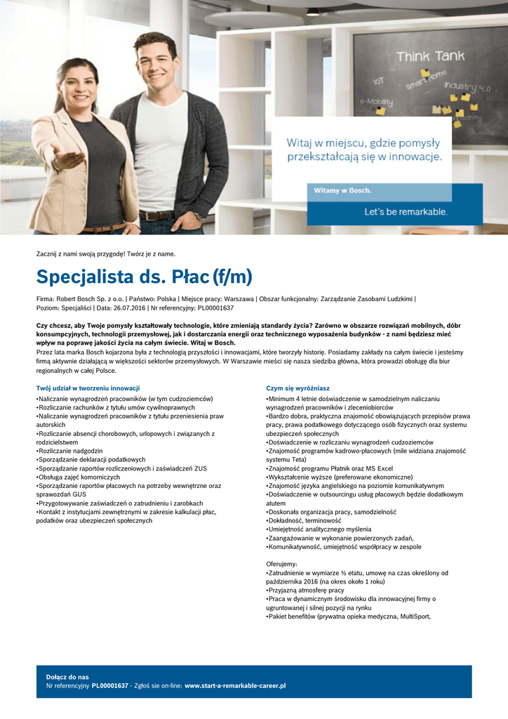 Zacznij z nami swoją przygodę! Twórz je z name. Specjalista ds. Płac (f/m) Firma: Robert Bosch Sp. z o.o. | Państwo: Polska | Miejsce pracy: Warszawa | Obszar funkcjonalny: Zarządzanie Zasobami Ludzkimi | Poziom: Specjaliści | Data: 26.07.2016 | Nr referencyjny: PL00001637 Czy chcesz, aby Twoje pomysły kształtowały technologie, które zmieniają standardy życia? Zarówno w obszarze rozwiązań mobilnych, dóbr konsumpcyjnych, technologii przemysłowej, jak i dostarczania energii oraz technicznego wyposażenia budynków - z nami będziesz mieć wpływ na poprawę jakości życia na całym świecie. Witaj w Bosch. Przez lata marka Bosch kojarzona była z technologią przyszłości i innowacjami, które tworzyły historię. Posiadamy zakłady na całym świecie i jesteśmy firmą aktywnie działającą w większości sektorów przemysłowych. W Warszawie mieści się nasza siedziba główna, która prowadzi obsługę dla biur regionalnych w całej Polsce. Twój udział w tworzeniu innowacji Czym się wyróżniasz •Naliczanie wynagrodzeń pracowników (w tym cudzoziemców) •Rozliczanie rachunków z tytułu umów cywilnoprawnych •Naliczanie wynagrodzeń pracowników z tytułu przeniesienia praw autorskich •Rozliczanie absencji chorobowych, urlopowych i związanych z rodzicielstwem •Rozliczanie nadgodzin •Sporządzanie deklaracji podatkowych •Sporządzanie raportów rozliczeniowych i zaświadczeń ZUS •Obsługa zajęć komorniczych •Sporządzanie raportów płacowych na potrzeby wewnętrzne oraz sprawozdań GUS •Przygotowywanie zaświadczeń o zatrudnieniu i zarobkach •Kontakt z instytucjami zewnętrznymi w zakresie kalkulacji płac, podatków oraz ubezpieczeń społecznych •Minimum 4 letnie doświadczenie w samodzielnym naliczaniu wynagrodzeń pracowników i zleceniobiorców •Bardzo dobra, praktyczna znajomość obowiązujących przepisów prawa pracy, prawa podatkowego dotyczącego osób fizycznych oraz systemu ubezpieczeń społecznych •Doświadczenie w rozliczaniu wynagrodzeń cudzoziemców •Znajomość programów kadrowo-płacowych (mile widziana znajomość systemu Teta) •Znajomość programu Płatnik oraz MS Excel •Wykształcenie wyższe (preferowane ekonomiczne) •Znajomość języka angielskiego na poziomie komunikatywnym •Doświadczenie w outsourcingu usług płacowych będzie dodatkowym atutem •Doskonała organizacja pracy, samodzielność •Dokładność, terminowość •Umiejętność analitycznego myślenia •Zaangażowanie w wykonanie powierzonych zadań, •Komunikatywność, umiejętność współpracy w zespole Oferujemy: •Zatrudnienie w wymiarze ½ etatu, umowę na czas określony od października 2016 (na okres około 1 roku) •Przyjazną atmosferę pracy •Praca w dynamicznym środowisku dla innowacyjnej firmy o ugruntowanej i silnej pozycji na rynku •Pakiet benefitów (prywatna opieka medyczna, MultiSport, Dołącz do nas Nr referencyjny PL00001637 - Zgłoś sie on-line: www.start-a-remarkable-career.pl