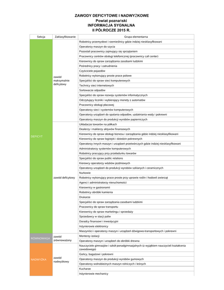 ZAWODY DEFICYTOWE I NADWYŻKOWE Powiat poznański INFORMACJA SYGNALNA II PÓŁROCZE 2015 R. Sekcja Zaklasyfikowanie Grupa elementarna Robotnicy przemysłowi i rzemieślnicy gdzie indziej niesklasyfikowani Operatorzy maszyn do szycia Pozostali pracownicy zajmujący się sprzątaniem Pracownicy centrów obsługi telefonicznej (pracownicy call center) Kierownicy do spraw zarządzania zasobami ludzkimi Pośrednicy pracy i zatrudnienia Czyściciele pojazdów zawód maksymalnie deficytowy Robotnicy wykonujący proste prace polowe Specjaliści do spraw sieci komputerowych Technicy sieci internetowych Sortowacze odpadów Specjaliści do spraw rozwoju systemów informatycznych Odczytujący liczniki i wybierający monety z automatów Pracownicy obsługi płacowej Operatorzy sieci i systemów komputerowych Operatorzy urządzeń do spalania odpadów, uzdatniania wody i pokrewni Operatorzy maszyn do produkcji wyrobów papierniczych Układacze towarów na półkach Dealerzy i maklerzy aktywów finansowych Kierownicy do spraw obsługi biznesu i zarządzania gdzie indziej niesklasyfikowani DEFICYT Kierownicy do spraw logistyki i dziedzin pokrewnych Operatorzy innych maszyn i urządzeń przetwórczych gdzie indziej niesklasyfikowani Administratorzy systemów komputerowych Robotnicy pracujący przy przeładunku towarów Specjaliści do spraw public relations Kierowcy operatorzy wózków jezdniowych Operatorzy urządzeń do produkcji wyrobów szklanych i ceramicznych Nurkowie zawód deficytowy Robotnicy wykonujący prace proste przy uprawie roślin i hodowli zwierząt Agenci i administratorzy nieruchomości Kierownicy w gastronomii Robotnicy obróbki kamienia Drukarze Specjaliści do spraw zarządzania zasobami ludzkimi Pracownicy do spraw transportu Kierownicy do spraw marketingu i sprzedaży Sprzedawcy w stacji paliw Doradcy finansowi i inwestycyjni Inżynierowie elektronicy Maszyniści i operatorzy maszyn i urządzeń dźwigowo-transportowych i pokrewni RÓWNOWAGA zawód zrównoważony Monterzy izolacji Operatorzy maszyn i urządzeń do obróbki drewna Nauczyciele gimnazjów i szkół ponadgimnazjalnych (z wyjątkiem nauczycieli kształcenia zawodowego) NADWYŻKA zawód nadwyżkowy Gońcy, bagażowi i pokrewni Operatorzy maszyn do produkcji wyrobów gumowych Operatorzy wolnobieżnych maszyn rolniczych i leśnych Kucharze Inżynierowie mechanicy Sekcja Zaklasyfikowanie Grupa elementarna Pracownicy administracyjni i sekretarze biura zarządu Betoniarze, betoniarze zbrojarze i pokrewni zawód nadwyżkowy Robotnicy wykonujący prace proste w budownictwie drogowym, wodnym i pokrewni Pomoce i sprzątaczki biurowe, hotelowe i pokrewne Tynkarze i pokrewni Specjaliści do spraw księgowości i rachunkowości Ogrodnicy NADWYŻKA Dietetycy i żywieniowcy Technicy nauk chemicznych, fizycznych i pokrewni zawód maksymalnie nadwyżkowy Artyści plastycy Technicy farmaceutyczni Kierownicy do spraw innych typów usług gdzie indziej niesklasyfikowani Robotnicy zwalczania szkodników i chwastów Pracownicy bibliotek, galerii, muzeów, informacji naukowej i pokrewni Rolnicy upraw mieszanych *Monitoring zawodów deficytowych i nadwyżkowych został wykonany według nowej metodologii przygotowanej w ramach projektu współfinansowanego ze środków UE w ramach EFS „Opracowanie nowych zaleceń metodycznych prowadzenia monitoringu zawodów deficytowych i nadwyżkowych na lokalnym rynku pracy".