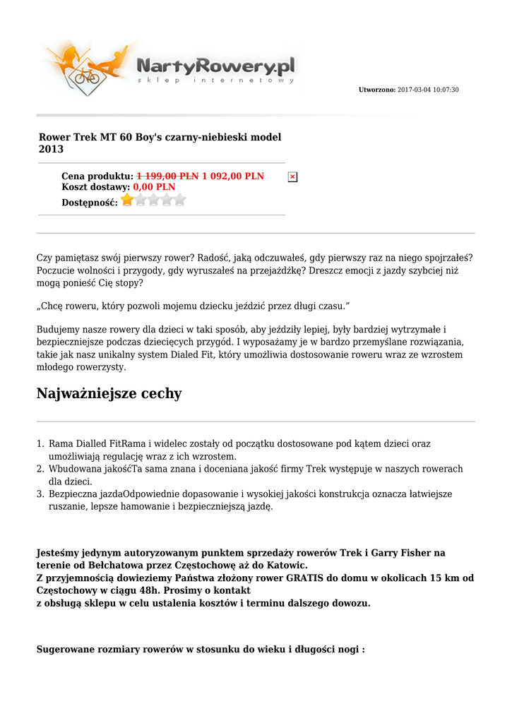 Utworzono: 2017-03-04 10:07:30 Rower Trek MT 60 Boy's czarny-niebieski model 2013 Cena produktu: 1 199,00 PLN 1 092,00 PLN Koszt dostawy: 0,00 PLN Dostępność: Czy pamiętasz swój pierwszy rower? Radość, jaką odczuwałeś, gdy pierwszy raz na niego spojrzałeś? Poczucie wolności i przygody, gdy wyruszałeś na przejażdżkę? Dreszcz emocji z jazdy szybciej niż mogą ponieść Cię stopy? „Chcę roweru, który pozwoli mojemu dziecku jeździć przez długi czasu.” Budujemy nasze rowery dla dzieci w taki sposób, aby jeździły lepiej, były bardziej wytrzymałe i bezpieczniejsze podczas dziecięcych przygód. I wyposażamy je w bardzo przemyślane rozwiązania, takie jak nasz unikalny system Dialed Fit, który umożliwia dostosowanie roweru wraz ze wzrostem młodego rowerzysty. Najważniejsze cechy 1. Rama Dialled FitRama i widelec zostały od początku dostosowane pod kątem dzieci oraz umożliwiają regulację wraz z ich wzrostem. 2. Wbudowana jakośćTa sama znana i doceniana jakość firmy Trek występuje w naszych rowerach dla dzieci. 3. Bezpieczna jazdaOdpowiednie dopasowanie i wysokiej jakości konstrukcja oznacza łatwiejsze ruszanie, lepsze hamowanie i bezpieczniejszą jazdę. Jesteśmy jedynym autoryzowanym punktem sprzedaży rowerów Trek i Garry Fisher na terenie od Bełchatowa przez Częstochowę aż do Katowic. Z przyjemnością dowieziemy Państwa złożony rower GRATIS do domu w okolicach 15 km od Częstochowy w ciągu 48h. Prosimy o kontakt z obsługą sklepu w celu ustalenia kosztów i terminu dalszego dowozu. Sugerowane rozmiary rowerów w stosunku do wieku i długości nogi : Wiek lata Długość nogi cale Rozmiar cm Rama Koło 2-4 14 36 12" 3-5 16 41 14" 4-6 18 46 16" 5-8 20 51 11" 20" 5-8 21 53 12" 20" 5-8 22 56 13" 20" 7 - 12 26 66 14" 24" 7 - 12 27 69 15" 24" Dlaczego warto wybrać sklep NartyRowery.pl ? ● ● ● ● ● ● ● ● ● ● ● ● ● Darmowa Przesyłka Kurierska dla zamówień już od 400 PLN Szybka dostawa w 24h Możliwość zwrotu lub wymiany towaru w ciągu 10 dni od zakupu W naszym sklepie internetowym są tylko aktualnie dostępne produkty (zredukowaliśmy do minimum ryzyko braku dostępności zamówionego towaru) Możliwość negocjacji cen Częste promocje i rabaty ( obniżki cen, rabat na akcesoria, gratisy do rowerów) Fachowe doradztwo Pozytywne opinie w niezależnych serwisach m.in. Opineo, Allegro i porównywarkach cen Możliwość zakupu na raty - obsługujemy systemy Żagiel i Cetelem Sprzedajemy rowery wyregulowane i przesmarowane Do każdego zamówienia otrzymasz paragon lub fakturę stanowiący podstawę gwarancji Szczegółowe informacje o statusie zamówienia i wysyłce na adres e-mail podany w zamówieniu Obsługujemy płatności internetowe i Paypal Dołożono wszelkich starań, aby opisy i zdjęcia produktów były dokładne i aktualne. Specyfikacje i ceny mogą ulec zmianie bez uprzedzenia Płeć Przeznaczenie Manetki Widelec/ amortyzator Przerzutka przód Przerzutka tył Dziecięcy Górski / MTB, Dla dzieci Shimano Revo, 6-biegowe, obrotowe SR Suntour M2015 suspension widelec with 30mm travel Dopasowane zawieszenie SR Suntour, skok 30 mm nie dotyczy Shimano TX35 Kaseta/ wolnobieg Sun Run 14-28, 6-speed Korbowód Pedały Dopasowana długość z możliwością regulacji 120 – 140 mm, 32T Dopasowany rozmiar 20", platformowe Hamulce Przednie i tylne hamulce v-brake z dopasowanymi dźwigniami z aluminium Piasta przód Przednia piasta z aluminium; tylna piasta z aluminium z aluminiowymi obręczami 20" z 32 otworami Piasta tył Przednia piasta z aluminium; tylna piasta z aluminium z aluminiowymi obręczami 20" z 32 otworami Obręcze Przednia piasta z aluminium; tylna piasta z aluminium z aluminiowymi obręczami 20" z 32 otworami Szprychy - Kolekcja 2013 Opony Bontrager SX, 20x2,0" Stery Regulowane łożysko kulkowe Mostek Kierownica Stal Dopasowana, stalowa, wznios 40 mm Chwyty Dopasowany, Kraton Siodło Dopasowany rozmiar 20", wyściełane Sztyca Stal Waga b.d. Rama Dopasowany rozmiar ramy 20", Alpha Silver Aluminum Hamulce V-Brake Damper brak Pegi brak Łańcuch Gwarancja Ilość biegów Adres: http://nartyrowery.pl/ b.d dożywotnia na ramę i 2 lata na osprzęt 6 Telefon: 34 365 66 09, 793 61 04 29 Email: [email protected] Gadu-Gadu: Skype: