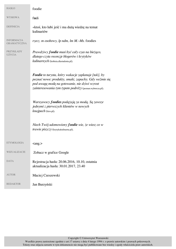HASŁO foodie WYMOWA fudi DEFINICJA «ktoś, kto lubi jeść i ma dużą wiedzę na temat kulinariów» INFORMACJA GRAMATYCZNA rzecz. m osobowy, lp ndm, lm M.–Ms. foodies PRZYKŁADY UŻYCIA Prawdziwy foodie musi być cały czas na bieżąco, dlatego czyta recenzje blogerów i krytyków kulinarnych (kobieta.dlastudenta.pl). Foodie to turysta, który wakacje zaplanuje [tak], by poznać nowe: produkty, smaki, zapachy. Gdy weźmie się pod uwagę modę na gotowanie, nie dziwi wzrost zainteresowania tym typem podróży (poznan.wyborcza.pl). Warszawscy foodies podążają za modą. Są zawsze jednymi z pierwszych klientów w nowych knajpach (hiro.pl). Niech Twój udomowiony foodie wie, że wiesz co w trawie piszczy (krytykakulinarna.pl). ETYMOLOGIA WIZUALIZACJE <ang.> Zobacz w grafice Google DATA Rejestracja hasła: 20.06.2016, 10.10, ostatnia aktualizacja hasła: 30.01.2017, 23.40 AUTOR Maciej Czeszewski REDAKTOR Jan Burzyński Copyright © Uniwersytet Warszawski Wszelkie prawa zastrzeżone zgodnie z art.17 ustawy z dnia 4 lutego 1994 r. o prawie autorskim i prawach pokrewnych. Teksty oraz zdjęcia zawarte w tym dokumencie nie mogą być publikowane bez wiedzy i zgody właściciela praw autorskich. Powered by TCPDF (www.tcpdf.org)