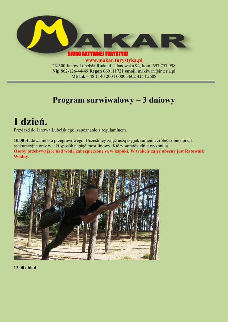 BIURO AKTYWNEJ TURYSTYKI www.makar.turystyka.pl 23-300 Janów Lubelski Ruda ul. Ulanowska 94, kom. 697 757 998 Nip 862-126-44-49 Regon 060111721 email. [email protected] MBank – 48 1140 2004 0000 3602 4154 2688 Program surwiwalowy – 3 dniowy I dzień. Przyjazd do Janowa Lubelskiego, zapoznanie z regulaminem. 10.00 Budowa mostu przeprawowego. Uczestnicy zajęć uczą się jak samemu zrobić sobie uprząż asekuracyjną oraz w jaki sposób napiąć most linowy, Który samodzielnie wykonują. Osoby przebywające nad wodą zabezpieczone są w kapoki. W trakcie zajęć obecny jest Ratownik Wodny. 13.00 obiad 15.00 paintball 18.00 kolacja 20.00 ognisko II dzień 08.00 śniadanie 09.30 Nauka tworzenia przedmiotów z trzciny, traw… 13.00 obiad 16.00 Wyprawa samochodami terenowymi . Wycieczka trwa około 1,15 godziny. 18.00 kolacja III dzień 08.00 śniadanie 09.30 nauka pozyskiwania ognia ( rozpalanie ognia za pomocą krzesiw, baterii z latarki, kamieni, lupy, apteczki, łuku ogniowego… ) Cena 240 zł /osoba Cena zawiera Zakwaterowanie. Wyżywienie Dobra zabawę Dojazd do Janowa Lubelskiego nie jest wliczony w cenę.