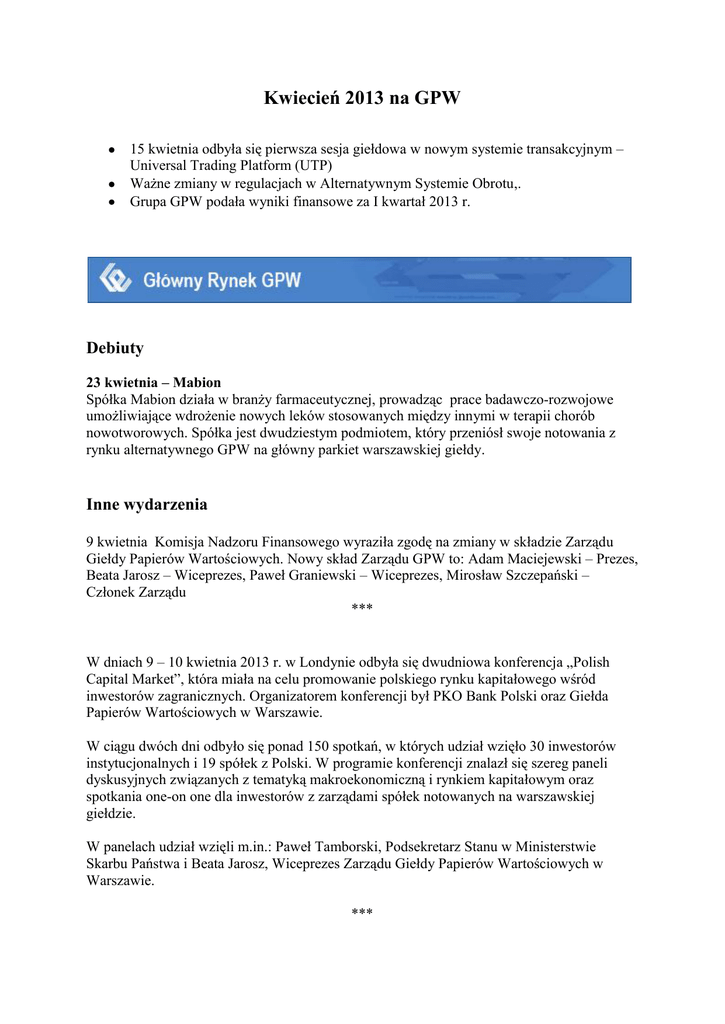 Kwiecień 2013 na GPW 15 kwietnia odbyła się pierwsza sesja giełdowa w nowym systemie transakcyjnym – Universal Trading Platform (UTP) Ważne zmiany w regulacjach w Alternatywnym Systemie Obrotu,. Grupa GPW podała wyniki finansowe za I kwartał 2013 r. Debiuty 23 kwietnia – Mabion Spółka Mabion działa w branży farmaceutycznej, prowadząc prace badawczo-rozwojowe umożliwiające wdrożenie nowych leków stosowanych między innymi w terapii chorób nowotworowych. Spółka jest dwudziestym podmiotem, który przeniósł swoje notowania z rynku alternatywnego GPW na główny parkiet warszawskiej giełdy. Inne wydarzenia 9 kwietnia Komisja Nadzoru Finansowego wyraziła zgodę na zmiany w składzie Zarządu Giełdy Papierów Wartościowych. Nowy skład Zarządu GPW to: Adam Maciejewski – Prezes, Beata Jarosz – Wiceprezes, Paweł Graniewski – Wiceprezes, Mirosław Szczepański – Członek Zarządu *** W dniach 9 – 10 kwietnia 2013 r. w Londynie odbyła się dwudniowa konferencja „Polish Capital Market”, która miała na celu promowanie polskiego rynku kapitałowego wśród inwestorów zagranicznych. Organizatorem konferencji był PKO Bank Polski oraz Giełda Papierów Wartościowych w Warszawie. W ciągu dwóch dni odbyło się ponad 150 spotkań, w których udział wzięło 30 inwestorów instytucjonalnych i 19 spółek z Polski. W programie konferencji znalazł się szereg paneli dyskusyjnych związanych z tematyką makroekonomiczną i rynkiem kapitałowym oraz spotkania one-on one dla inwestorów z zarządami spółek notowanych na warszawskiej giełdzie. W panelach udział wzięli m.in.: Paweł Tamborski, Podsekretarz Stanu w Ministerstwie Skarbu Państwa i Beata Jarosz, Wiceprezes Zarządu Giełdy Papierów Wartościowych w Warszawie. *** 12 kwietnia Giełda poinformowała o rozpoczęciu wstępnych rozmów na temat współpracy z CEE Stock Exchange Group AG (CEESEG). Na obecnym etapie strony analizują wszystkie możliwe rozwiązania strategiczne oraz możliwe metody współpracy. *** 15 kwietnia odbyła się pierwsza sesja giełdowa na GPW przy użyciu nowego systemu transakcyjnego – Universal Trading Platform (UTP). Notowania przebiegły prawidłowo zgodnie z nowym harmonogramem – sesja dla rynku kasowego rozpoczęła się o godz. 9:00, a dla rynku terminowego o godz. 8:45; sesja na obu rynkach zakończyła się o godzinie 17:05, a otwarcie i zamknięcie sesji odbyło się bez zakłóceń Podczas pierwszej sesji całkowita wartość obrotów akcjami wyniosła 752,8 mln zł, a inwestorzy zawarli w sumie 54 744 transakcji. System transakcyjny UTP (Universal Trading Platform) to światowej klasy jakość w dziedzinie technologii, która umiejscowi GPW pośród najnowocześniejszych globalnych giełd. UTP spełnia najwyższe światowe standardy i rosnące wymagania uczestników rynku, a przy tym gwarantuje organizację obrotu zgodnie z globalnymi trendami. UTP, którego twórcą jest NYSE Technologies, znany jest międzynarodowym inwestorom i brokerom z największych światowych rynków – tą samą platformę obrotu wykorzystują giełdy grupy NYSE Euronext z siedzibami w Nowym Jorku, Paryżu, Lizbonie, Amsterdamie i Brukseli, jak również wiele rynków giełdowych. Dzięki UTP polski rynek kapitałowy otwiera się na nowe kategorie inwestorów, w tym duże, globalne firmy inwestycyjne stosujące techniki handlu algorytmicznego. System UTP zastąpił Warset, który działał na warszawskiej giełdzie od 17 listopada 2000 roku. Porównanie: pierwsze sesje w systemach Warset i UTP: WARSET liczba instrumentów UTP 352 1 882 liczba zleceń 31 251 3 743 491 liczba transakcji 14 854 54 744 obrót akcjami (mln zł) 134,4 752,78 obrót kontraktami (szt.) 5 958 46 368 *** 16 kwietnia 2012 przypadła 22. rocznica powstania GPW. Po 22 latach GPW jest największą krajową giełdą instrumentów finansowych w regionie Europy Środkowej i Wschodniej pod względem kapitalizacji notowanych spółek (128,5 mld euro)1 i wartości obrotów akcjami (w ciągu ostatnich 12 miesięcy wyniosły one 45,5 mld euro)2, a także jedną z najszybciej rozwijających się giełd w Europie. Jak wynika z najnowszego raportu IPO Watch Europe, dotyczącego liczby i wartości pierwszych ofert publicznych (IPO) na giełdach europejskich, warszawski parkiet jest drugim rynkiem w Europie pod względem liczby debiutów oraz trzecim pod względem wartości ofert w pierwszym kwartale 2013 r., plasując się za giełdami z grupy LSE i Deutsche Boerse. *** 30 kwietnia Grupa GPW podała wyniki finansowe za I kwartał 2013 r. Grupa Kapitałowa Giełdy Papierów Wartościowych w Warszawie odnotowała w tym okresie rekordowe przychody ze sprzedaży na poziomie 79,4 mln zł (o 24,1% większe w porównaniu z analogicznym okresem ubiegłego roku). Wzrost jest w znacznej mierze spowodowany wysoką aktywnością uczestników Towarowej Giełdy Energii, spółki zależnej GPW. Przychody z rynku finansowego, na którym od początku roku obowiązują nowe, obniżone opłaty od transakcji akcjami i kontraktami terminowymi, wzrosły o 5,1% wobec IV kwartału 2012 r. i wyniosły 52,5 mln zł. W stosunku do I kwartału 2012 r. przychody z rynku finansowego obniżyły się o 7,8%, przy wzroście obrotów sesyjnych na rynku akcji o 1,5%. W tym samym okresie większość regulowanych rynków akcji w Unii Europejskiej odnotowała spadek wartości obrotów, które dla całej UE wyniosły blisko 992 mld euro i były o 7,4% niższe niż rok wcześniej. Najważniejsze dane statystyczne Zmiany procentowe indeksów w kwietniu WIG20 -2,2 MWIG40 -2,8 SWIG80 -3,9 WIG-PLUS -6,5 WIG -2,2 Od początku roku -10,21 -0,06 0,65 1,94 -6,95 Spośród wszystkich spółek giełdowych notowanych na głównym rynku 178 zanotowało dodatnią stopę zwrotu. Największe wzrosty cen w kwietniu Spółka Kurs 30.04.2013 INTAKUS 0,02 MISPOL 1,51 POLICE 21,00 *dla debiutantów kurs odniesienia z dnia debiutu Kurs 28.03.2013* 0,01 0,83 16,30 Zmiana % 100,
