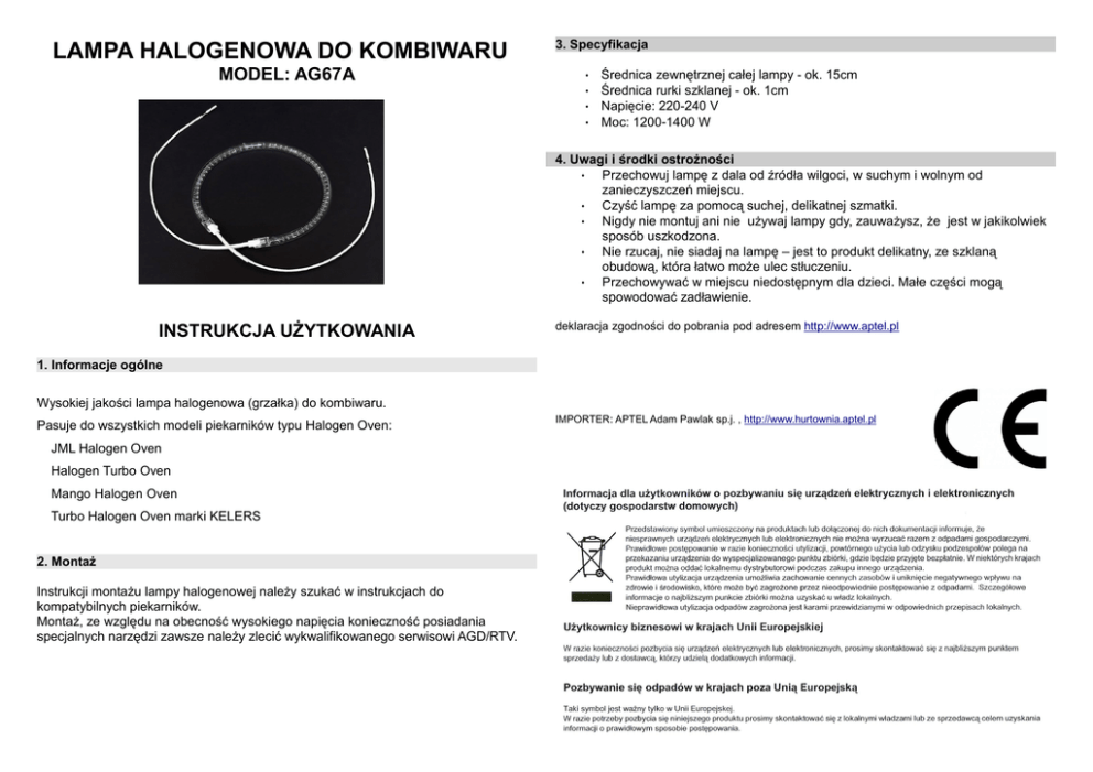LAMPA HALOGENOWA DO KOMBIWARU MODEL: AG67A 3. Specyfikacja • • • • Średnica zewnętrznej całej lampy - ok. 15cm Średnica rurki szklanej - ok. 1cm Napięcie: 220-240 V Moc: 1200-1400 W 4. Uwagi i środki ostrożności • Przechowuj lampę z dala od źródła wilgoci, w suchym i wolnym od zanieczyszczeń miejscu. • Czyść lampę za pomocą suchej, delikatnej szmatki. • Nigdy nie montuj ani nie używaj lampy gdy, zauważysz, że jest w jakikolwiek sposób uszkodzona. • Nie rzucaj, nie siadaj na lampę – jest to produkt delikatny, ze szklaną obudową, która łatwo może ulec stłuczeniu. • Przechowywać w miejscu niedostępnym dla dzieci. Małe części mogą spowodować zadławienie. INSTRUKCJA UŻYTKOWANIA deklaracja zgodności do pobrania pod adresem http://www.aptel.pl 1. Informacje ogólne Wysokiej jakości lampa halogenowa (grzałka) do kombiwaru. Pasuje do wszystkich modeli piekarników typu Halogen Oven: JML Halogen Oven Halogen Turbo Oven Mango Halogen Oven Turbo Halogen Oven marki KELERS 2. Montaż Instrukcji montażu lampy halogenowej należy szukać w instrukcjach do kompatybilnych piekarników. Montaż, ze względu na obecność wysokiego napięcia konieczność posiadania specjalnych narzędzi zawsze należy zlecić wykwalifikowanego serwisowi AGD/RTV. IMPORTER: APTEL Adam Pawlak sp.j. , http://www.hurtownia.aptel.pl