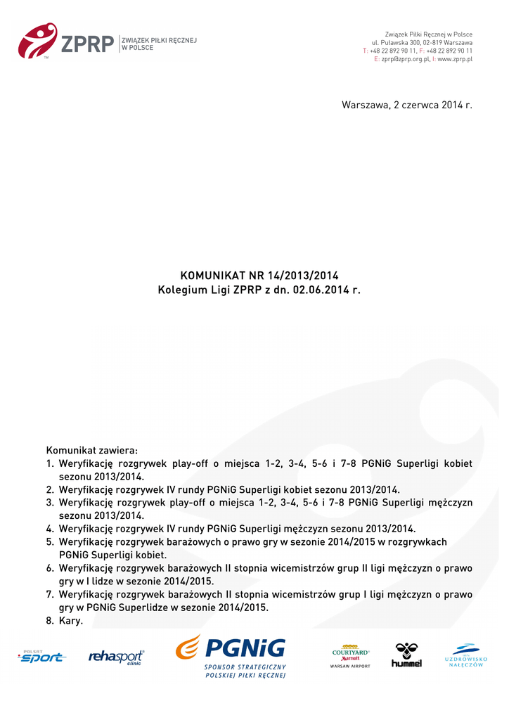 KOMUNIKAT NR 14/2013/2014 Kolegium Ligi ZPRP z dn. 02.06