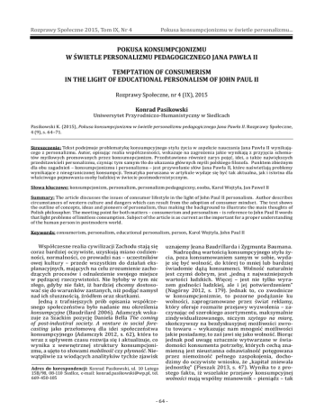 Rozprawy Społeczne 2015, Tom IX, Nr 4 Pokusa konsumpcjonizmu w świetle personalizmu... POKUSA KONSUMPCJONIZMU W ŚWIETLE PERSONALIZMU PEDAGOGICZNEGO JANA PAWŁA II TEMPTATION OF CONSUMERISM IN THE LIGHT OF EDUCATIONAL PERSONALISM OF JOHN PAUL II Rozprawy Społeczne, nr 4 (IX), 2015 Konrad Pasikowski Uniwersytet Przyrodniczo-Humanistyczny w Siedlcach Pasikowski K. (2015), Pokusa konsumpcjonizmu w świetle personalizmu pedagogicznego Jana Pawła II. Rozprawy Społeczne, 4 (9), s. 64–71. Streszczenie: Tekst podejmuje problematykę konsumpcyjnego stylu życia w aspekcie nauczania Jana Pawła II wynikającego z personalizmu. Autor, opisując realia współczesności, wskazuje na zagrożenia jakie wynikają z przyjęcia schematów myślowych promowanych przez konsumopcjonizm. Przedstawiono również zarys pojęć, idei, a także największych przedstawicieli personalizmu, czyniąc tym samym tło do ukazania głównych myśli polskiego filozofa. Punktem zbieżnym dla obu zagadnień – konsumpcjonizmu i personalizmu – jest przywołanie słów Jana Pawła II, które naświetlają problemy wynikające z nieograniczonej konsumpcji. Tematyka poruszana w artykule wydaje się być tak aktualna, jak i istotna dla właściwego pojmowania osoby ludzkiej w świecie postmodernistycznym. Słowa kluczowe: konsumpcjonizm, personalizm, personalizm pedagogiczny, osoba, Karol Wojtyła, Jan Paweł II Summary: The article discusses the issues of consumer lifestyle in the light of John Paul II personalism. Author describes circumstances of western culture and dangers which can result from the adoption of consumer mindset. The text shows the outline of concepts, ideas and pioneers of personalism, thus making the background to illustrate the main thoughts of Polish philosopher. The meeting point for both matters – consumerism and personalism – is reference to John Paul II words that light problems of limitless consumption. Subject of the article is as current as the important for a proper understanding of the human person in postmodern world. Keywords: consumerism, personalism, educational personalism, person, Karol Wojtyla, John Paul II Współczesne realia cywilizacji Zachodu stają się coraz bardziej oczywiste, uzyskują miano codzienności, normalności, co prowadzi nas – uczestników owej kultury – przede wszystkim do działań eksplanacyjnych, mających na celu zrozumienie zachodzących procesów i odnalezienie swojego miejsce w pędzącej rzeczywistości. Nie byłoby w tym nic złego, gdyby nie fakt, iż bardziej chcemy dostosować się do warunków zastanych, niż podjąć namysł nad ich słusznością, źródłem oraz skutkami. Jedną z trafniejszych prób opisania współczesnego społeczeństwa było nadanie mu określenia konsumpcyjne (Baudrilard 2006). Adamczyk wskazuje za Szackim pozycję Daniela Bella The coming of post-industiral society. A venture in social forecasting jako przełomową dla idei społeczeństwa konsumpcyjnego (Adamczyk 2012, s. 62), która to wraz z upływem czasu rozwija się i aktualizuje, co wynika z wewnętrznej struktury konsumpcjonizmu, a ujęto to słowami mobilność czy płynność. Niewątpliwie za wiodących analityków tychże zjawisk Adres do korespondencji: Konrad Pasikowski, ul. 10 Lutego 15B/98, 08-110 Siedlce, e-mail: [email protected], tel. 669-450-105 uznajemy Jeana Baudrillarda i Zygmunta Baumana. Nadrzędną wartością konsumpcyjnego stylu życia, poza konsumowaniem samym w sobie, wydaje się być wolność, do której to mniej lub bardziej świadomie dążą konsumenci. Wolność naturalnie jest czymś dobrym, jest „jedną z najważniejszych wartości ludzkich. Więcej – jest nie tylko wyrazem godności ludzkiej, ale i jej potwierdzeniem” (Nagórny 2012, s. 179). Jednak to, co zwodnicze w konsumpcjonizmie, to pozorne podążanie ku wolności, zaprogramowane przez świat reklamy, który oferuje rozmaite przejawy wyzwolenia – zaczynając od szerokiego asortymentu, maksymalnie zindywidualizowanego, niczym szytego na miarę, skończywszy na bezdyskusyjnej możliwości zwrotu towaru – wykazując nam mnogość możliwości jakie posiadamy, to zaś jawi się jako wolność. Biorąc jednak pod uwagę sztucznie wytwarzane w świadomości konsumenta potrzeby, których cechą znamienną jest nieustanna odnawialność potęgowana przez niemożność pełnego zaspokojenia, dochodzimy do oczywiste wniosku, że „kapitał zniewala jednostkę” (Pieszak 2013, s. 47). Wynika to z prostego faktu, iż wszelakie przejawy konsumpcyjnej wolności mają wspólny mianownik – pieniądz – tak - 64 - Rozprawy Społeczne 2015, Tom IX, Nr 4 Pokusa konsumpcjonizmu w świetle personalizmu... więc człowiek w pogoni za wolnością staje się zniewolony pieniądzem, od niego to bowiem uzależnia poziom swego wyzwolenia. Powyższe słowa można zobrazować przywołując na myśl historię przytoczoną w 44 listach ze świata płynnej nowoczesności, gdzie dwudziestotrzyletnia Siobhan Healey dzień, w którym otrzymała pierwszą kartę kredytową, zaczęła corocznie obchodzić jako własne święto niepodległości finansowej. Jak można było się domyślić – w stosunkowo niedługim czasie – zadłużenie urosło do niebagatelnej kwoty, mianowicie 26 tysięcy dolarów (Bauman 2011, s. 82). Tego rodzaju zachowania zapewne wypływają z przekonania, iż miernikiem wartości jednostki jest suma dóbr materialnych oraz symbolicznych przez nią posiadanych, albo należałoby stwierdzić za Baumanem nie tyle posiadanych co używanych (Bauman 2007, s. 180). Używanie pozwala zachować ciągłość niedosytu, pragnienia, które nieustannie staramy się zaspokoić. Oznacza to, iż kosumpcyjny styl życia wykracza poza stereotypowe mieć, ponieważ rozwiązaniem tego równania byłoby obkupienie się przedmiotami i utrzymanie ich w posiadaniu, tak aby pełniły rolę nieustannego źródła szczęścia. Jednak tak się nie dzieje, gdyż napędza nas nie tyle potrzeb
