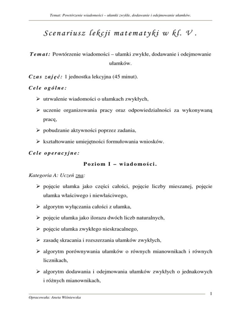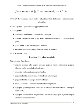 Temat: Powtórzenie wiadomości – ułamki zwykłe, dodawanie i odejmowanie ułamków. Sc e nar ius z l ek c ji mat e m at yk i w k l . V . T e m a t : Powtórzenie wiadomości – ułamki zwykłe, dodawanie i odejmowanie ułamków. C z a s z a j ę ć : 1 jednostka lekcyjna (45 minut). Cele ogólne: utrwalenie wiadomości o ułamkach zwykłych, uczenie organizowania pracy oraz odpowiedzialności za wykonywaną pracę, pobudzanie aktywności poprzez zadania, kształtowanie umiejętności formułowania wniosków. Cele operacyjne: Poziom I – wiadomości. Kategoria A: Uczeń zna: pojęcie ułamka jako części całości, pojęcie liczby mieszanej, pojęcie ułamka właściwego i niewłaściwego, algorytm wyłączania całości z ułamka, pojęcie ułamka jako ilorazu dwóch liczb naturalnych, pojęcie ułamka zwykłego nieskracalnego, zasadę skracania i rozszerzania ułamków zwykłych, algorytm porównywania ułamków o równych mianownikach i równych licznikach, algorytm dodawania i odejmowania ułamków zwykłych o jednakowych i różnych mianownikach, 1 Opracowała: Aneta Wiśniewska Temat: Powtórzenie wiadomości – ułamki zwykłe, dodawanie i odejmowanie ułamków. Kategoria B: Uczeń rozumie: jaką rolę w życiu codziennym odgrywają ułamki oraz jak istotna jest umiejętność dodawania i odejmowania ułamków zwykłych, pojęcie ułamka jako wynik podziału całości na części. Poziom II – umiejętności. Kategoria C: Uczeń potrafi: rozpoznawać ułamki właściwe i niewłaściwe, wyłączać liczby całkowite z ułamków niewłaściwych, skracać i rozszerzać ułamki, rozpoznawać ułamki większe i mniejsze od 1 , 2 porównywać ułamki, dodawać i odejmować ułamki o jednakowych i różnych mianownikach. Metody pracy: ćwiczenia utrwalające. Formy pracy: praca w grupach, indywidualna. Środki dydaktyczne: karty A4 z zapisanymi ułamkami zwykłymi. Typ lekcji: utrwalająca. 2 Opracowała: Aneta Wiśniewska Temat: Powtórzenie wiadomości – ułamki zwykłe, dodawanie i odejmowanie ułamków. Przebieg lekcji. Uczniowie po wejściu do klasy siadają na krzesłach w półokręgu. Powitanie i sprawdzenie listy obecności. Określenie celu lekcji. Nauczyciel informuję uczniów, iż będą oni utrwalać zdobyte wcześniej wiadomości dotyczące ułamków zwykłych, dodawania i odejmowania ułamków. Sformułowanie i zapisanie tematu lekcji. Przeprowadzenie ćwiczenia z zakresu kinezjologii edukacyjnej (kapturek myśliciela). Ćwiczenie wykonuje się przez kilkakrotne odwijanie uszu z góry do dołu. Ćwiczenie kończymy pociągnięciem ucha do góry, do tyłu i do dołu. Pobudza cały mechanizm słuchu i wspomaga pamięć. Powtórzenie podstawowych definicji i twierdzeń dotyczących ułamków zwykłych. Nauczyciel stawia uczniom pytania: ♦ Do czego służą ułamki? ♦ Co oznacza liczba zapisana w liczniku ułamka, a co w mianowniku? ♦ Jakie ułamki nazywamy właściwymi, a jakie niewłaściwymi? ♦ Jakie wartości mają ułamki niewłaściwe? ♦ Jak inaczej można zapisać ułamek niewłaściwy? 3 Opracowała: Aneta Wiśniewska Temat: Powtórzenie wiadomości – ułamki zwykłe, dodawanie i odejmowanie ułamków. ♦ Czy liczbę naturalną można zapisać w postaci ułamka? ♦ Jak zapisać za pomocą ułamka liczbę 2? ♦ Jak zapisać liczbę 2 w postaci ułamka o mianowniku 4? ♦ Jak zapisać liczbę 2 w postaci ułamka o liczniku 6? ♦ Jak skracamy ułamki? ♦ Kiedy ułamek jest nieskracalny? Podaj przykłady. ♦ Jak rozszerzamy ułamki? ♦ Czy po rozszerzeniu ułamek ma większą wartość? ♦ Podaj przykłady ułamków właściwych o jednakowych licznikach. ♦ Jeżeli ułamki mają jednakowe liczniki to który jest większy? ♦ Jeżeli ułamki mają jednakowe mianowniki to który jest większy? ♦ Jak porównać ułamki, jeżeli nie mają ani wspólnego licznika ani mianownika? ♦ Jak skrócić ułamek do ułamka nieskracalnego? Poprawne wypowiedzi uczniów oceniane są plusami, w przeciwnym przypadku – minusami. Każdy uczeń otrzymuje od nauczyciela kartkę formatu A4 z napisanym na niej ułamkiem zwykłym. Kartki te zostały przygotowane przez uczniów wcześniej. Znajdowały się na nich następujące ułamki: 1 1 1 1 4 4 , , , , , , 8 4 3 2 32 16 4 4 7 3 2 28 12 8 3 5 5 5 5 2 , , , , , , , , , , , , , . 12 2 8 4 4 32 16 12 6 8 4 3 2 6 Ułamki właściwe i niewłaściwe. Dzieci ustawiają się w dwóch grupach: • grupa I - „ułamki właściwe”, 4 Opracowała: Aneta Wiśniewska Temat: Powtórzenie wiadomości – ułamki zwykłe, dodawanie i odejmowanie ułamków. • grupa II - „ułamki niewłaściwe”. Uczniowie uzasadniają swój wybór. Następnie z ułamków niewłaściwych wyłączają liczby całkowite. Ułamki skracalne i nieskracalne. Uczniowie dzielą się na dwie grupy: • grupa I – „ułamki skracalne”, • grupa II – „ułamki nieskracalne”. Uczniowie również uzasadniają swój wybór oraz mówią jakie ułamki nazywamy skracalnymi, a jakie nieskracalnymi. Tworzenie par ułamków równych. Uczniowie dobierają się w pary tak, aby ich ułamki zapisane na kartkach były równe. Każda para dzieci uzasadnia równość ułamków poprzez ich skracanie, bądź rozszerzanie. Następuje podział na trzy grupy: 1 2 • grupa I – „ułamki, które mają wartość ”, 1 2 • grupa II – „ułamki, które są większe od ”, 1 2 • grupa III – „ułamki, które są mniejsze od ”. Uczniowie uzasadniają swój wybór. Porównywanie ułamków. Uczniowie kolejno tworzą grupy ułamków o jednakowych mianownikach a następnie o jednakowych licznikach i w obydwu przypadkach porównują ułamki ustawiając się rosnąco. Kilka wybranych ułamków o różnych licznikach i mianownikach dzieci porównują wykonując obliczenia na tablicy. 5 Opracowała: Aneta Wiśniewska Temat: Powtórzenie wiadomości – ułamki zwykłe, dodawanie i odejmowanie ułamków. Dodawanie ułamków zwykłych. Uczniowie dobierają 