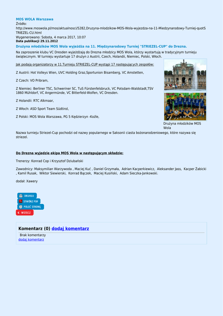 MOS WOLA Warszawa Źródło: http://www.moswola.pl/mos/aktualnosci/5282,Druzyna-mlodzikow-MOS-Wola-wyjezdza-na-11-Miedzynarodowy-Turniej-quotS TRIEZEL-CU.html Wygenerowano: Sobota, 4 marca 2017, 10:07 Data publikacji 29.11.2012 Drużyna młodzików MOS Wola wyjeżdża na 11. Międzynarodowy Turniej "STRIEZEL-CUP" do Drezna. Na zaproszenie klubu VC Dresden wyjeżdżają do Drezna młodzicy MOS Wola, którzy wystartują w tradycyjnym turnieju świątecznym. W turnieju wystartuje 17 drużyn z Austrii, Czech, Holandii, Niemiec, Polski, Włoch. Jak podają organizatorzy w 11.Turnieju STRIEZEL-CUP wystąpi 17 następujących zespołów: Z Austrii: Hot Volleys Wien, UVC Holding Graz,Sportunion Bisamberg, VC Amstetten, Z Czech: VO Pribram, Z Niemiec: Berliner TSC, Schweriner SC, TuS Fürstenfelsbruck, VC Potsdam-Waldstadt,TSV 1860 Mühldorf, VC Angermünde, VC Bitterfeld-Wolfen, VC Dresden. Z Holandii: RTC Alkmaar, Z Włoch: ASD Sport Team Südtirol, Z Polski: MOS Wola Warszawa, PG 5 Kędzierzyn -Koźle, Drużyna młodzików MOS Wola Nazwa turnieju Striezel-Cup pochodzi od nazwy popularnego w Saksonii ciasta bożonarodzeniowego, które nazywa się striezel. Do Drezna wyjedzie ekipa MOS Wola w następującym składzie: Trenerzy: Konrad Cop i Krzysztof Dziubański Zawodnicy: Maksymilian Warzywoda , Maciej Kuć , Daniel Grzymała, Adrian Kacperkiewicz, Aleksander Jass, Kacper Żabicki , Kamil Rusak, Wiktor Siewierski, Konrad Bączek, Maciej Kusiński, Adam Sieczka-Jankowski. dodał: Xawery Komentarz (0) dodaj komentarz Brak komentarzy dodaj komentarz