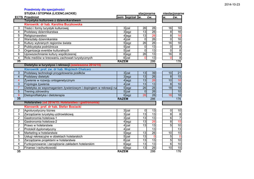 2014-10-23 Przedmioty dla specjalności STUDIA I STOPNIA (LICENCJACKIE) stacjonarne ćw. ECTS Przedmiot sem egz/zal w. Turystyka kulturowa z dziennikarstwem Kierownik: dr hab. Karolina Buczkowska 3 Treści i formy turystyki kulturowej 3 zal 26 26 4 Podstawy dziennikarstwa 3 egz 13 26 5 Religioznawstwo 4 egz 13 26 2 Warsztaty dziennikarskie 4 zal 0 26 6 Kultury wybranych regionów świata 5 egz 26 26 2 Publicystyka podróżnicza 5 zal 0 13 3 Organizacja eventów kulturalnych 5 zal 0 13 6 Upowszechnianie kultury współczesnej 6 egz 26 13 4 Rola mediów w kreowaniu zachowań turystycznych 6 zal 0 13 35 RAZEM 286 Dietetyka w turystyce i rekreacji (zawieszona 2014/15) Kierownik: prof. zw. dr hab. Wojciech Chalcarz 3 Podstawy technologii przygotowania posiłków 3 zal 13 39 4 Podstawy dietetyki 3 egz 13 26 4 Żywienie w rozwoju ontogenetycznym 4 egz 13 26 3 Fizjologia żywienia 4 zal 13 13 7 5 egz 26 26 Dietetyka ze wspomaganiem żywieniowym i dopingiem w rekreacji ruc 5 Trening zdrowotny 5 zal 0 26 9 Dietoprofilaktyka i dietoterapia 6 egz 26 26 35 RAZEM 286 Hotelarstwo (od 2014/15: Hotelarstwo i gastronomia) Kierownik: prof. dr hab. Stefan Bosiacki 2 Agroturystyczny biznes 3 zal 0 13 3 Zarządzanie turystyką uzdrowiskową 3 zal 13 13 2 Gastronomia hotelowa-1 3 zal 13 13 3 Gastronomia hotelowa-2 4 egz 13 26 2 Prawo w hotelarstwie 4 zal 13 13 2 Protokół dyplomatyczny 4 zal 13 6 Marketing w hotelarstwie 5 egz 13 26 5 Usługi rekreacyjne w obiektach hotelarskich 5 zal 13 0 3 Zarządzanie projektami w hotelarstwie 6 zal 13 13 4 Funkcjonowanie i zarządzanie zakładem hotelarskim 6 egz 13 13 3 Finanse i rachunkowość 6 egz 13 26 35 RAZEM 286 niestacjonarne w. ćw. 16 8 8 0 16 0 0 16 0 16 16 16 16 16 8 8 8 8 176 10 8 10 8 18 21 15 16 10 18 10 16 176 16 0 8 6 8 5 10 5 5 6 10 10 8 7 15 10 13 15 0 10 10 15 176 2014-10-23 Przedmioty dla specjalności STUDIA I STOPNIA (LICENCJACKIE) ECTS Przedmiot Rekreacja kierownik: prof. dr hab. Beata Pluta 4 Programowanie rekreacji-1 3 Rekreacja ruchowa-1 3 Programowanie rekreacji-2 2 Rekreacja ruchowa-2 2 Trening zdrowotny 3 Rekreacja osób niepełnosprawnych 2 Rekreacja ruchowa-3 5 Obóz zimowy (7 dni) 4 Rekreacja ruchowa-4 3 Organizacja imprez rekreacyjnych 4 Rekreacja plenerowa (ćw. terenowe) 35 Obsługa ruchu turystycznego Kierownik: dr Joanna Śniadek 2 Usługi turystyczne-1 (Transport w turystyce) 1 Usługi turystyczne-2 (Ubezpieczenia) 1 Usługi turystyczne-3 (Agroturystyka) 2 Animacja czasu wolnego-1 2 Animacja czasu wolnego-2 (Turystyka osób niepełnosprawnych) 1 Ochrona zdrowia i medycyna podróży 3 Prawo w turystyce 2 Protokół dyplomatyczny - spec. 4 Pilotaż i przewodnictwo 3 Ćw. terenowe z zakresu specjalności 4 Marketing i rynek w turystyce-1 (Marketing w turystyce) 4 Marketing i rynek w turystyce-2 (Analiza rynku) 6 Finanse i rachunkowość 35 stacjonarne ćw. sem egz/zal w. 3 zal 3 zal 4 egz 4 zal 4 zal 5 egz 5 zal 5 zal 6 zal 6 zal 6 zal RAZEM 13 0 13 3 zal 3 zal 3 zal 3 zal 3 zal 3 zal 4 zal 4 zal 5 egz 5 zal 5 zal 6 egz 6 egz RAZEM 13 0 0 0 0 13 13 0 0 0 13 13 13 0 13 0 0 0 niestacjonarne w. ćw. 13 26 13 26 26 13 26 52 26 13 13 286 10 0 13 13 13 13 0 13 13 26 39 26 13 26 286 8 10 10 10 10 10 10 10 10 10 52 10 7 7 176 8 8 8 8 10 10 10 10 10 7 8 15 16 15 10 15 176 2014-10-23 Przedmioty dla specjalności STUDIA I STOPNIA (LICENCJACKIE) ECTS Przedmiot Agroturystyka i Ekoturystyka (zawieszona 2014/15) Kierownik: dr inż. Rafał Kurczewski 1 Ekofilozofia 3 Ekoturystyka-1 1 Turystyka wiejska 2 Biogeografia-1 1 Biogeografia-2 2 Dziedzictwo przyrodniczo-kulturowe Polski-1 2 Turystyka na obszarach chronionych-1 2 Agroturystyka-1 3 Dziedzictwo przyrodniczo-kulturowe Polski-2 2 Turystyka na obszarach chronionych-2 2 Ekoturystyka-2 2 Agroturystyka-2 2 Żywienie w agro- i ekoturystyce 3 Edukacja ekologiczna 2 Ćwiczenia terenowe 1 Podstawy zarządzania środowiskiem 2 Biometeorologia 2 Ekonomia ekologiczna 35 stacjonarne sem egz/zal w. ćw. 3 zal 3 egz 3 egz 3 zal 4 egz 4 zal 4 zal 4 zal 5 egz 5 zal 5 zal 5 zal 5 zal 6 zal 6 zal 6 zal 6 egz 6 egz RAZEM 13 13 13 13 5 8 6 5 8 7 5 7 4 13 10 13 10 13 13 13 13 13 13 13 24 13 5 286 niestacjonarne w. ćw. 8 8 8 8 3 5 3 3 5 4 3 4 2 8 7 8 7 8 8 8 8 8 8 8 14 8 4 176
