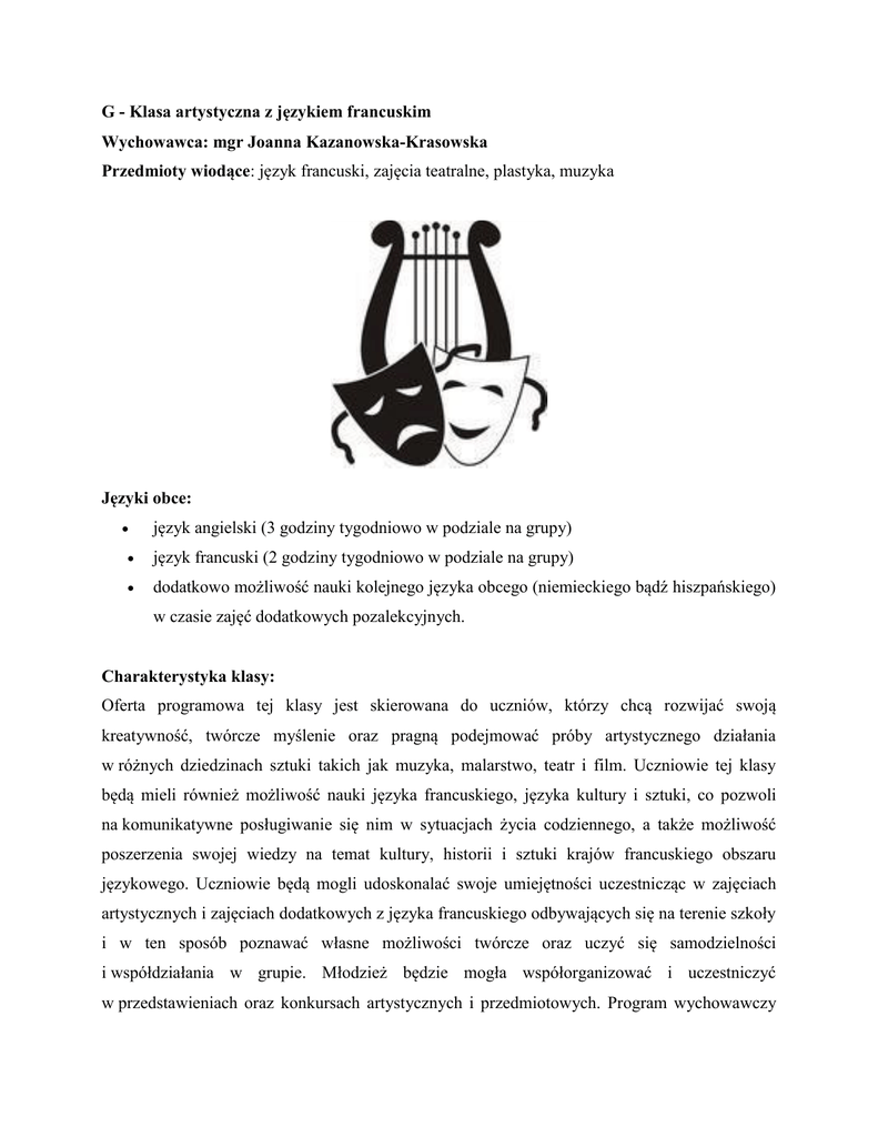 G - Klasa artystyczna z językiem francuskim Wychowawca: mgr