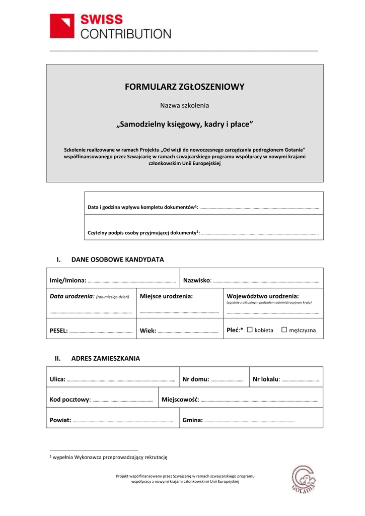 ______________________________________________________________________________________________________________ FORMULARZ ZGŁOSZENIOWY Nazwa szkolenia „Samodzielny księgowy, kadry i płace” Szkolenie realizowane w ramach Projektu „Od wizji do nowoczesnego zarządzania podregionem Gotania” współfinansowanego przez Szwajcarię w ramach szwajcarskiego programu współpracy w nowymi krajami członkowskim Unii Europejskiej Data i godzina wpływu kompletu dokumentów1: ……………………………………………………………………………………………. Czytelny podpis osoby przyjmującej dokumenty1: ………………………………………………………………………………………….. I. DANE OSOBOWE KANDYDATA Imię/Imiona: …………………………………………………………………… Data urodzenia: (rok-miesiąc-dzień) Nazwisko: …………………………………………………………………………………. Miejsce urodzenia: Województwo urodzenia: (zgodnie z aktualnym podziałem administracyjnym kraju) ………………………………………………………………. ……………………………………………………………. ………………………………………………………………………. PESEL: ……………………………………………….. Wiek: ……………………………………………… Płeć:* II. ADRES ZAMIESZKANIA Ulica: …………………………………………………………………………………… Kod pocztowy: ……………………………………………… Nr domu: ………………………… Nr lokalu: …………………………… Miejscowość: ………………………………………………………………………………………….. Powiat: …………………………………………………………………………….. 1 □ kobieta □ mężczyzna Gmina: …………………………………………………………………….. wypełnia Wykonawca przeprowadzający rekrutację Projekt współfinansowany przez Szwajcarię w ramach szwajcarskiego programu współpracy z nowymi krajami członkowskimi Unii Europejskiej ______________________________________________________________________________________________________________ III. DANE KONTAKTOWE Telefon stacjonarny: …………………………………………………… Telefon komórkowy: ……………………………………………………… Adres e-mail: ……………………………………………………………………………………………………………………………………………………………………………………. IV. WYKSZTAŁCENIE * □ □ □ □ □ V. podstawowe gimnazjalne ponadgimnazjalne [wykształcenie średnie lub zasadnicza szkoła zawodowa] pomaturalne [kontynuacja nauki po maturze w innej formie niż studia] wyższe [tytuł licencjata, inżyniera, magistra lub doktora] STATUS KANDYDATA * □ osoba bezrobotna □ □ osoba nieaktywna zawodowo □ rolnik (nie prowadzący działalności gospodarczej i niezatrudniony na umowę o pracę) domownik ( będący osobą bezrobotną bądź nieaktywną zawodowo) □ osoba pobierająca naukę VI. Czy zamierza Pan/Pani starać się o zwrot kosztów dojazdu na zajęcia? * (dotyczy osób zameldowanych poza miejscowością, w której odbywają się zajęcia) □ TAK □ NIE VII. OŚWIADCZENIE Wyrażam zgodę na udział w usługach projektowych realizowanych w ramach projektu „Od wizji do nowoczesnego zarządzania podregionem Gotania” współfinansowanego przez Szwajcarię w ramach szwajcarskiego programu współpracy z nowymi krajami członkowskim Unii Europejskiej. Zostałam/zostałem pouczony, że składając dokumenty uczestnictwa w projekcie powinienem/powinnam podać wszystkie dane wskazane w w/w dokumentach zgodnie ze stanem faktycznym istniejącym w momencie ich składania. Oświadczam, że dane zawarte w złożonych przeze mnie dokumentach są zgodne z prawdą. Podanie danych niezgodnych z prawdą będzie rodzić po stronie podającego nieprawdziwe dane odpowiedzialność cywilną względem poszkodowanego. Projekt współfinansowany przez Szwajcarię w ramach szwajcarskiego programu współpracy z nowymi krajami członkowskimi Unii Europejskiej ______________________________________________________________________________________________________________ Oświadczam, że zapoznałem/am się, akceptuję i zobowiązuję się do przestrzegania „Regulaminu rekrutacji i realizacji szkoleń w ramach projektu „Od wizji do nowoczesnego zarządzania podregionem Gotania”, w szczególności zobowiązuję się do regularnego udziału w zajęciach oraz po pozytywnej rekrutacji do udziału w nie więcej jak dwóch szkoleniach w ramach drugiej edycji szkoleń. Wyrażam zgodę na przetwarzanie moich danych osobowych przez Gminę Miejską Hrubieszów – CENTRUM KSZTAŁCENIA BIZNESU sp. z o.o. zgodnie z ustawą z dnia 29.08.1997r. o ochronie danych osobowych (tj. Dz. U. z 2002r., nr. 101, poz. 926 z późn. zm.). Jednocześnie oświadczam, że akceptuję następujące warunki: 1) administratorem moich danych osobowych jest Gmina Miejska Hrubieszów – CENTRUM KSZTAŁCENIA BIZNESU sp. z o.o., 2) moje dane osobowe mogą zostać udostępnione podmiotom realizującym kursy/szkolenia, podmiotom wdrażającym i kontrolującym Szwajcarsko-Polski Program Współpracy oraz innym podmiotom w celach związanych z realizacją projektu, 3) podanie danych jest dobrowolne, aczkolwiek odmowa ich podania jest równoznaczna z brakiem możliwości udzielenia wsparcia w ramach Projektu; 4) mam prawo dostępu do treści swoich danych i ich poprawiania. Na potwierdzenie statusu kandydata wskazanego w pkt. V Formularza Zgłoszeniowego przekładam stosowne dokumenty (zaświadczenie z miejsca zatrudnienia, ZUS, KRUS, PUP lub inne). miejscowo