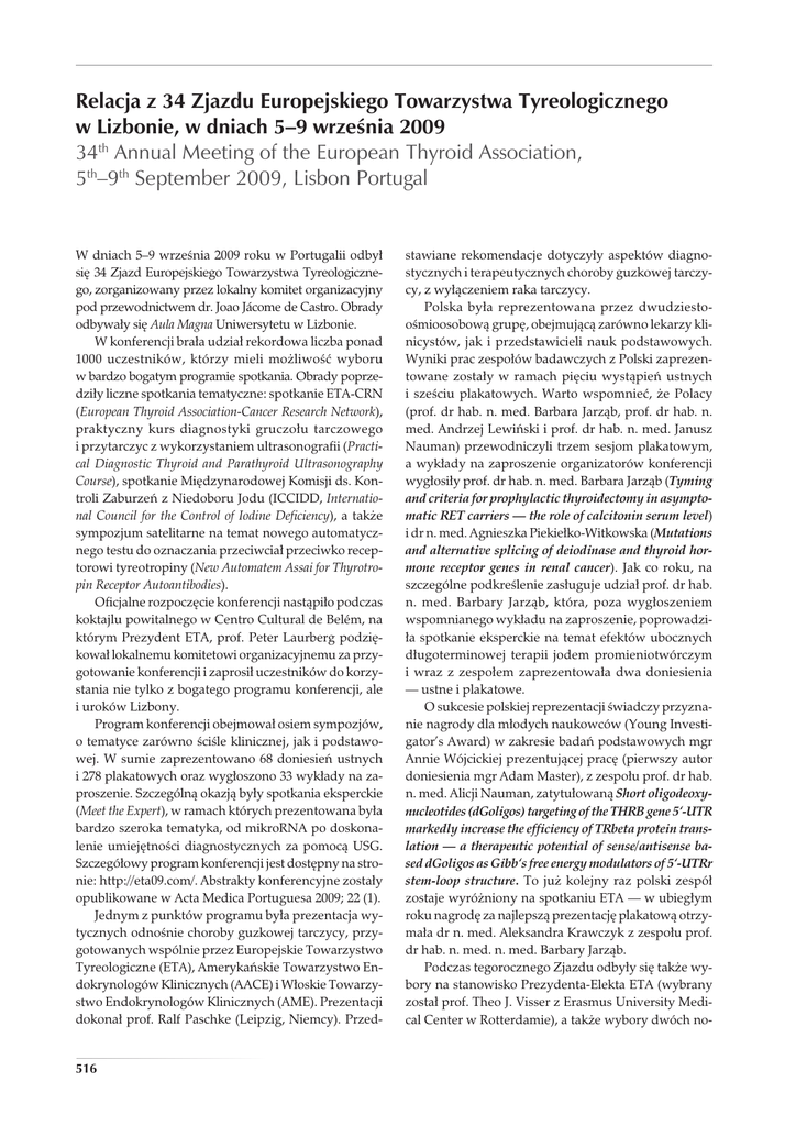 Relacja z 34 Zjazdu Europejskiego Towarzystwa Tyreologicznego w Lizbonie, w dniach 5–9 września 2009 34th Annual Meeting of the European Thyroid Association, 5th–9th September 2009, Lisbon Portugal W dniach 5–9 września 2009 roku w Portugalii odbył się 34 Zjazd Europejskiego Towarzystwa Tyreologicznego, zorganizowany przez lokalny komitet organizacyjny pod przewodnictwem dr. Joao Jácome de Castro. Obrady odbywały się Aula Magna Uniwersytetu w Lizbonie. W konferencji brała udział rekordowa liczba ponad 1000 uczestników, którzy mieli możliwość wyboru w bardzo bogatym programie spotkania. Obrady poprzedziły liczne spotkania tematyczne: spotkanie ETA-CRN (European Thyroid Association-Cancer Research Network), praktyczny kurs diagnostyki gruczołu tarczowego i przytarczyc z wykorzystaniem ultrasonografii (Practical Diagnostic Thyroid and Parathyroid Ultrasonography Course), spotkanie Międzynarodowej Komisji ds. Kontroli Zaburzeń z Niedoboru Jodu (ICCIDD, International Council for the Control of Iodine Deficiency), a także sympozjum satelitarne na temat nowego automatycznego testu do oznaczania przeciwciał przeciwko receptorowi tyreotropiny (New Automatem Assai for Thyrotropin Receptor Autoantibodies). Oficjalne rozpoczęcie konferencji nastąpiło podczas koktajlu powitalnego w Centro Cultural de Belém, na którym Prezydent ETA, prof. Peter Laurberg podziękował lokalnemu komitetowi organizacyjnemu za przygotowanie konferencji i zaprosił uczestników do korzystania nie tylko z bogatego programu konferencji, ale i uroków Lizbony. Program konferencji obejmował osiem sympozjów, o tematyce zarówno ściśle klinicznej, jak i podstawowej. W sumie zaprezentowano 68 doniesień ustnych i 278 plakatowych oraz wygłoszono 33 wykłady na zaproszenie. Szczególną okazją były spotkania eksperckie (Meet the Expert), w ramach których prezentowana była bardzo szeroka tematyka, od mikroRNA po doskonalenie umiejętności diagnostycznych za pomocą USG. Szczegółowy program konferencji jest dostępny na stronie: http://eta09.com/. Abstrakty konferencyjne zostały opublikowane w Acta Medica Portuguesa 2009; 22 (1). Jednym z punktów programu była prezentacja wytycznych odnośnie choroby guzkowej tarczycy, przygotowanych wspólnie przez Europejskie Towarzystwo Tyreologiczne (ETA), Amerykańskie Towarzystwo Endokrynologów Klinicznych (AACE) i Włoskie Towarzystwo Endokrynologów Klinicznych (AME). Prezentacji dokonał prof. Ralf Paschke (Leipzig, Niemcy). Przed- 516 stawiane rekomendacje dotyczyły aspektów diagnostycznych i terapeutycznych choroby guzkowej tarczycy, z wyłączeniem raka tarczycy. Polska była reprezentowana przez dwudziestoośmioosobową grupę, obejmującą zarówno lekarzy klinicystów, jak i przedstawicieli nauk podstawowych. Wyniki prac zespołów badawczych z Polski zaprezentowane zostały w ramach pięciu wystąpień ustnych i sześciu plakatowych. Warto wspomnieć, że Polacy (prof. dr hab. n. med. Barbara Jarząb, prof. dr hab. n. med. Andrzej Lewiński i prof. dr hab. n. med. Janusz Nauman) przewodniczyli trzem sesjom plakatowym, a wykłady na zaproszenie organizatorów konferencji wygłosiły prof. dr hab. n. med. Barbara Jarząb (Tyming and criteria for prophylactic thyroidectomy in asymptomatic RET carriers — the role of calcitonin serum level) i dr n. med. Agnieszka Piekiełko-Witkowska (Mutations and alternative splicing of deiodinase and thyroid hormone receptor genes in renal cancer). Jak co roku, na szczególne podkreślenie zasługuje udział prof. dr hab. n. med. Barbary Jarząb, która, poza wygłoszeniem wspomnianego wykładu na zaproszenie, poprowadziła spotkanie eksperckie na temat efektów ubocznych długoterminowej terapii jodem promieniotwórczym i wraz z zespołem zaprezentowała dwa doniesienia — ustne i plakatowe. O sukcesie polskiej reprezentacji świadczy przyznanie nagrody dla młodych naukowców (Young Investigator’s Award) w zakresie badań podstawowych mgr Annie Wójcickiej prezentującej pracę (pierwszy autor doniesienia mgr Adam Master), z zespołu prof. dr hab. n. med. Alicji Nauman, zatytułowaną Short oligodeoxynucleotides (dGoligos) targeting of the THRB gene 5‘-UTR markedly increase the efficiency of TRbeta protein translation — a therapeutic potential of sense/antisense based dGoligos as Gibb‘s free energy modulators of 5‘-UTRr stem-loop structure. To już kolejny raz polski zespół zostaje wyróżniony na spotkaniu ETA — w ubiegłym roku nagrodę za najlepszą prezentację plakatową otrzymała dr n. med. Aleksandra Krawczyk z zespołu prof. dr hab. n. med. n. med. Barbary Jarząb. Podczas tegorocznego Zjazdu odbyły się także wybory na stanowisko Prezydenta-Elekta ETA (wybrany został prof. Theo J. Visser z Erasmus University Medical Center w Rotterdamie), a także wybory dwóch no- Endokrynologia Polska/Polish Journal of Endocrinology 2009; 60 (6) wych członków Zarządu (Executive Commitee) ETA. Na to ostatnie stanowisko wybrane zostały prof. Ana Aranda (z Instituto de Investigaciones Biomédicas Alberto Sols w Madrycie) oraz dr n. med. Agnieszka PiekiełkoWitkowska z Centrum Medycznego Kształcenia Podyplomowego w Warszawie, serdecznie gratulujemy. Cieszymy się, że Polska nadal będzie miała swojego przedstawiciela w Zarządzie ETA. Od 2006 roku w Zarządzie ETA zasiadała prof. dr hab. n. med. Barbara Jarząb, której kadencja zakończyła się w tym roku. W przyszłym roku czeka nas przerwa w spotkaniach ETA, z uwagi na przygotowywany w Paryżu Międzynarodowy Kongres Tyreologiczny (ITC, International Thyroid Congress). Za to w roku 2011 gospodarzem spotkania ETA będzie Kraków, co stwarza wyjątkową okazję do zaprezentowania naszych dokonań na polu tyreologii. Taką okazję dobrze wykorzystali gospodarze minionego spotkania w Lizbonie, na którym zaprezentowali aż 71 doniesień plakatowych oraz przewodni- czyli 9 sesjom. Z pewnością warto skupić wysiłki by w ciągu najbli