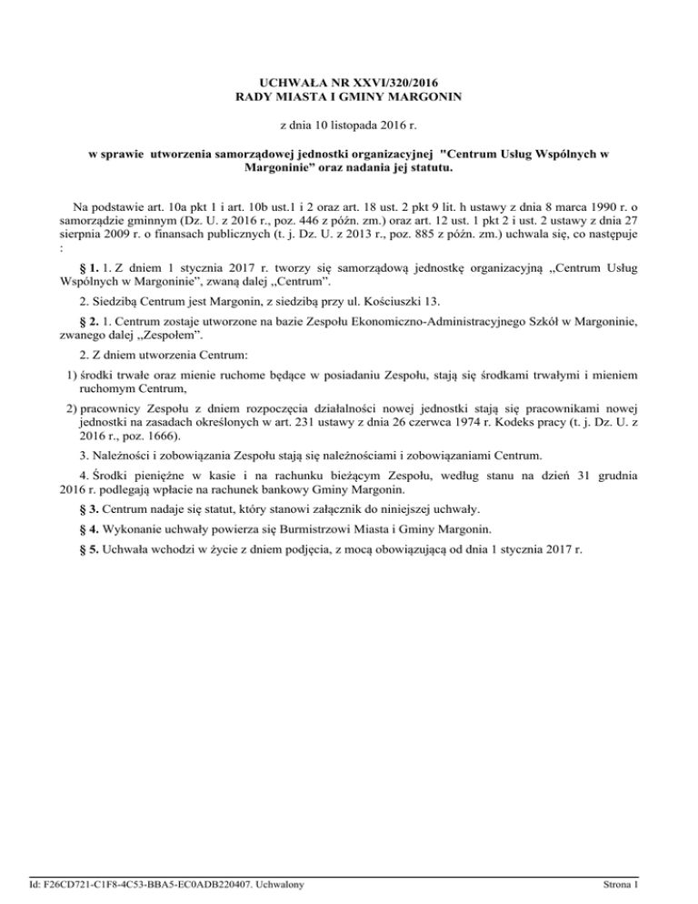 UCHWAŁA NR XXVI/320/2016 RADY MIASTA I GMINY MARGONIN z dnia 10 listopada 2016 r. w sprawie utworzenia samorządowej jednostki organizacyjnej "Centrum Usług Wspólnych w Margoninie” oraz nadania jej statutu. Na podstawie art. 10a pkt 1 i art. 10b ust.1 i 2 oraz art. 18 ust. 2 pkt 9 lit. h ustawy z dnia 8 marca 1990 r. o samorządzie gminnym (Dz. U. z 2016 r., poz. 446 z późn. zm.) oraz art. 12 ust. 1 pkt 2 i ust. 2 ustawy z dnia 27 sierpnia 2009 r. o finansach publicznych (t. j. Dz. U. z 2013 r., poz. 885 z późn. zm.) uchwala się, co następuje : § 1. 1. Z dniem 1 stycznia 2017 r. tworzy się samorządową jednostkę organizacyjną ,,Centrum Usług Wspólnych w Margoninie”, zwaną dalej ,,Centrum”. 2. Siedzibą Centrum jest Margonin, z siedzibą przy ul. Kościuszki 13. § 2. 1. Centrum zostaje utworzone na bazie Zespołu Ekonomiczno-Administracyjnego Szkół w Margoninie, zwanego dalej ,,Zespołem”. 2. Z dniem utworzenia Centrum: 1) środki trwałe oraz mienie ruchome będące w posiadaniu Zespołu, stają się środkami trwałymi i mieniem ruchomym Centrum, 2) pracownicy Zespołu z dniem rozpoczęcia działalności nowej jednostki stają się pracownikami nowej jednostki na zasadach określonych w art. 231 ustawy z dnia 26 czerwca 1974 r. Kodeks pracy (t. j. Dz. U. z 2016 r., poz. 1666). 3. Należności i zobowiązania Zespołu stają się należnościami i zobowiązaniami Centrum. 4. Środki pieniężne w kasie i na rachunku bieżącym Zespołu, według stanu na dzień 31 grudnia 2016 r. podlegają wpłacie na rachunek bankowy Gminy Margonin. § 3. Centrum nadaje się statut, który stanowi załącznik do niniejszej uchwały. § 4. Wykonanie uchwały powierza się Burmistrzowi Miasta i Gminy Margonin. § 5. Uchwała wchodzi w życie z dniem podjęcia, z mocą obowiązującą od dnia 1 stycznia 2017 r. Id: F26CD721-C1F8-4C53-BBA5-EC0ADB220407. Uchwalony Strona 1 Załącznik do Uchwały Nr XXVI/320/2016 Rady Miasta i Gminy Margonin z dnia 10 listopada 2016 r. Statut Centrum Usług Wspólnych w Margoninie Rozdział 1. Postanowienia ogólne § 1. 1. Centrum Usług Wspólnych w Margoninie zwanej dalej Centrum, jest gminną jednostką organizacyjną działającą na zasadach jednostki budżetowej. 2. Centrum działa na podstawie powszechnie obowiązujących przepisów prawa oraz niniejszego statutu. Rozdział 2. Cele i zakres działania § 2. 1. Centrum pełni funkcję jednostki obsługującej placówki oświatowe, tj. szkoły oraz przedszkola z terenu Gminy Margonin, zwane dalej jednostkami obsługiwanymi, dla których organem prowadzącym jest Gmina Margonin. 2. Do jednostek obsługiwanych zaliczają się: 1) Przedszkole Samorządowe w Margoninie, ul. Poznańska 10, 2) Szkoła Podstawowa im. Jana Pawła II w Lipinach, Lipiny 40, 3) Szkoła Podstawowa im. Powstańców Wielkopolskich w Radwankach, Radwanki 31, 4) Zespół Szkół w Margoninie, ul. Polna 6, w tym: a) Szkoła Podstawowa im. Mikołaja Kopernika w Margoninie, b) Publiczne Gimnazjum w Margoninie, 5) Urząd Miasta i Gminy w Margoninie, ul. Kościuszki 13 – w zakresie określonym w § 3 ust. 2. § 3. 1. Centrum w stosunku do jednostek obsługiwanych, o których mowa w § 2 ust. 2 pkt 1-4, wykonuje zadania w zakresie: 1) rachunkowości i sprawozdawczości w całości, zgodnie z przepisami o rachunkowości z uwzględnieniem zasad określonych w ustawie o finansach publicznych, 2) administracyjno-organizacyjnym: a) prowadzenie obsługi kadrowej pracowników, b) prowadzenie dokumentacji emerytalno-rentowej pracowników, c) sporządzanie kwartalnych i rocznych sprawozdań statystycznych, 3) obsługi finansowo-księgowej: a) prowadzenie obsługi rachunków bankowych, b) zgłaszanie i wyrejestrowywanie z ZUS pracowników – na podstawie udzielonych upoważnień, c) sporządzanie list wynagrodzeń i dokonywanie ich wypłat, i innych świadczeń wynikających ze stosunku pracy d) naliczanie i odprowadzanie należnych świadczeń na rzecz Zakładu Ubezpieczeń Społecznych i Urzędu Skarbowego, PFRON, Id: F26CD721-C1F8-4C53-BBA5-EC0ADB220407. Uchwalony Strona 1 e) dokonywanie wypłat świadczeń z zakresu zakładowego funduszu świadczeń socjalnych, pomocy zdrowotnej dla nauczycieli, doskonalenia zawodowego nauczycieli – zgodnie z dyspozycjami kierowników jednostek obsługiwanych, f) prowadzenie obsługi kasowej Centrum, 4) wykonywania dyspozycji środkami pieniężnymi zleconych przez kierowników jednostek obsługiwanych, 5) gromadzenia i przechowywania dokumentacji finansowo - księgowej, 6) współpracy z kierownikami jednostek obsługiwanych w zakresie objętym obsługą. 2. Centrum w stosunku do jednostki obsługiwanej, o której mowa § 2 ust. 2 pkt 5, wykonuje zadaniaw zakresie: 1) rozliczania średniego wynagrodzenia nauczycieli oraz sporządzania sprawozdania - zgodnie z art. 30a Karty Nauczyciela, 2) realizacji zadań związanych z dofinansowaniem pracodawcom kosztów kształcenia pracowników młodocianych, 3) rozliczania zwrotu kosztów dowozu dzieci i młodzieży niepełnosprawnych do przedszkoli, szkół, gimnazjów i ośrodków umożliwiających realizację obowiązku szkolnego lub obowiązku nauki, organizowanego przez rodziców, opiekunów lub opiekunów prawnych, 4) realizacji zadań związanych z bezpłatnym przekazaniem podręczników i ćwiczeń dla uczniów objętych obowiązkiem szkolnym w zakresie obsługi publicznych i niepublicznych jednostek oświatowych – szkół podstawowych i gimnazjów, 5) sporządzania zbiorczego zestawienia sprawozdawczości systemu informacji oświatowej dla Gminy Margonin za organ prowadzący w zakresie obsługi jednostek oświatowych, 6) prowadzenia spraw w zakresie organizacji konkursów dla kandydatów na stanowiska dyrektorów szkół i przedszkoli, 7) prowadzenia spraw w zakresie organizacji egzaminów nauczycieli ubiegających się o awans na stopień nauczyciela mianowanego, 8) współpraca z organem nadzoru pedagogicznego w sprawach związanych z dokonywan