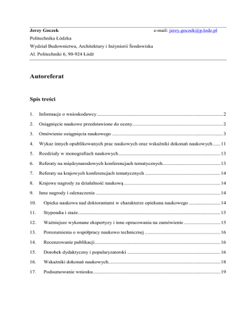 Autoreferat - Politechnika Łódzka,Wydział Budownictwa